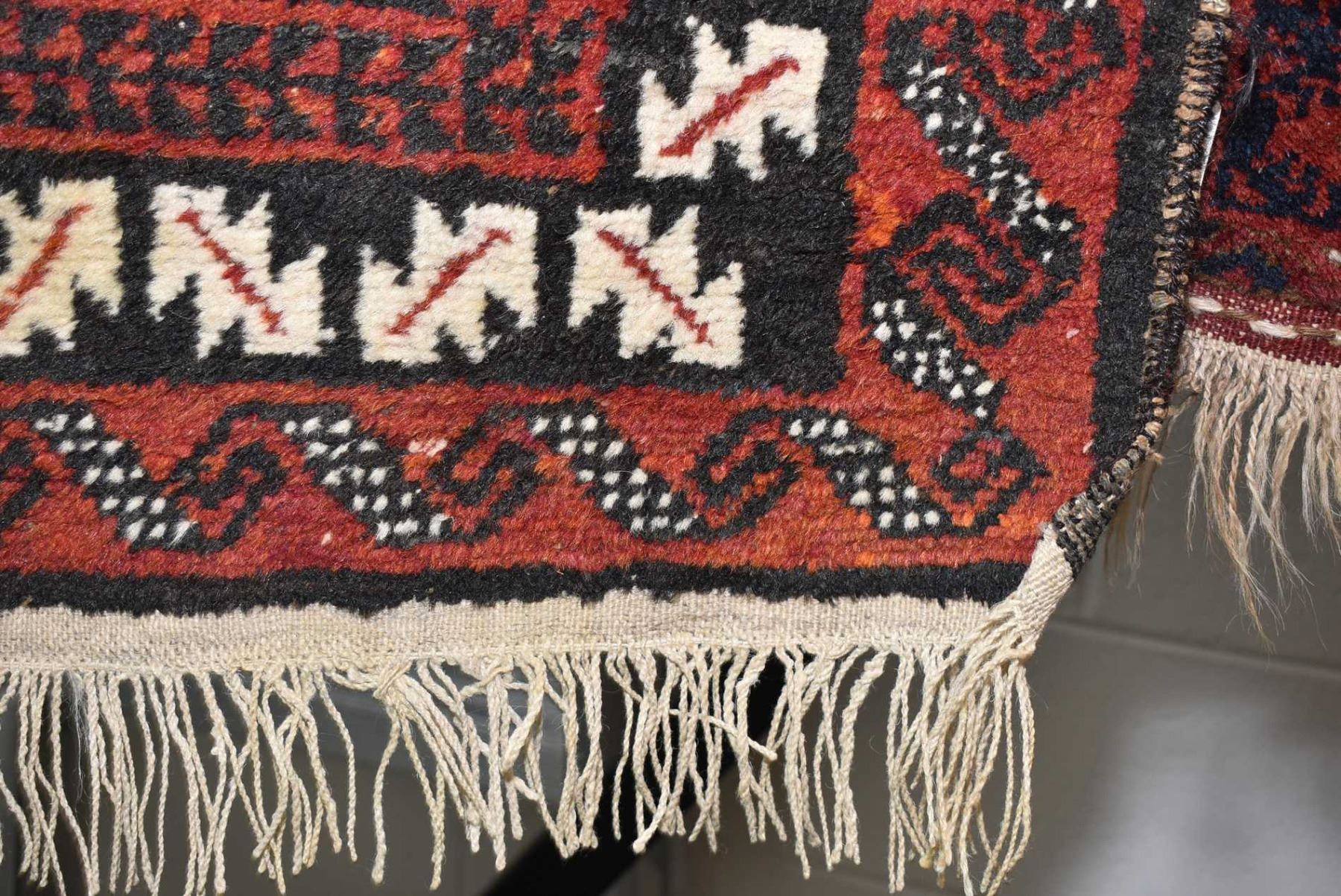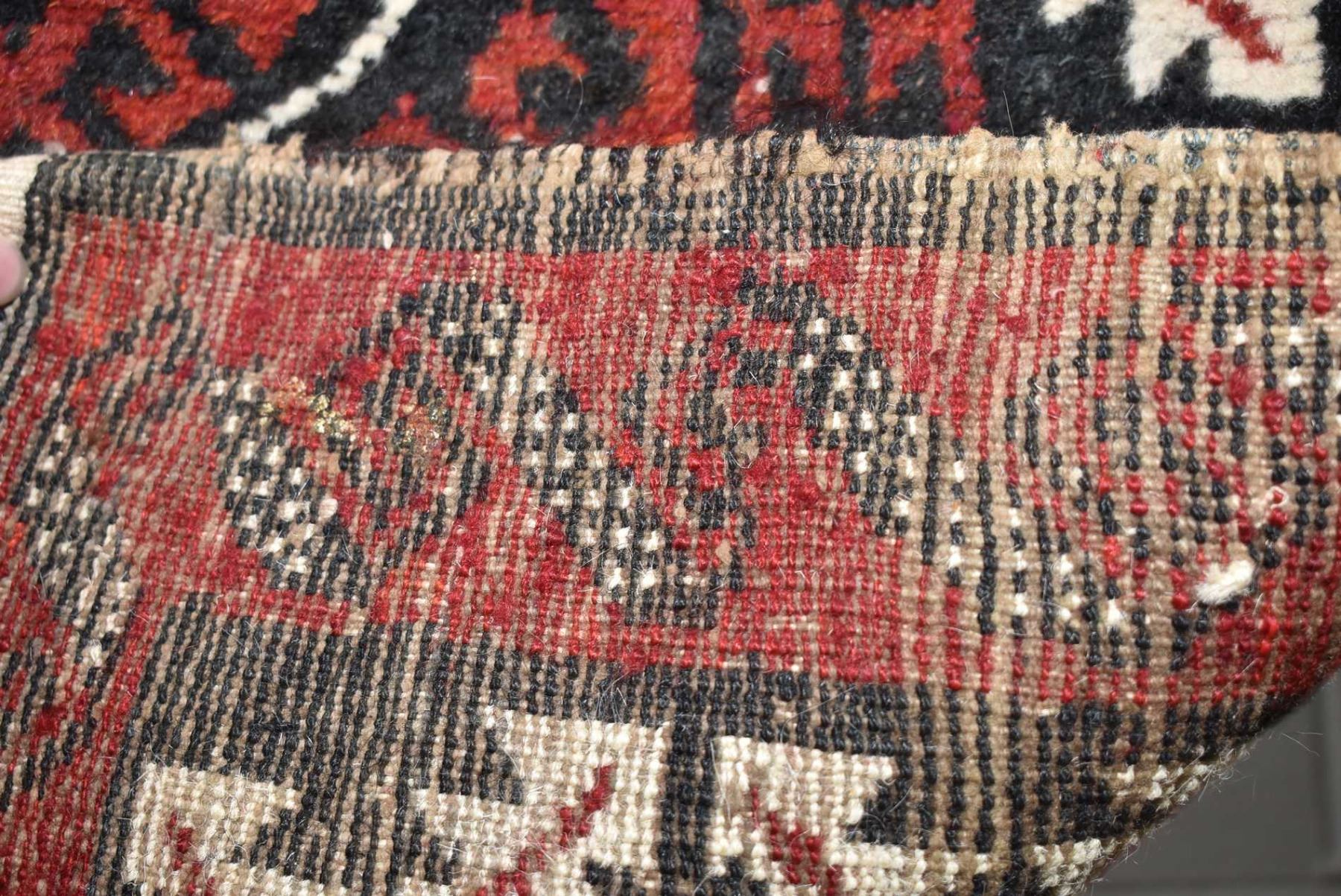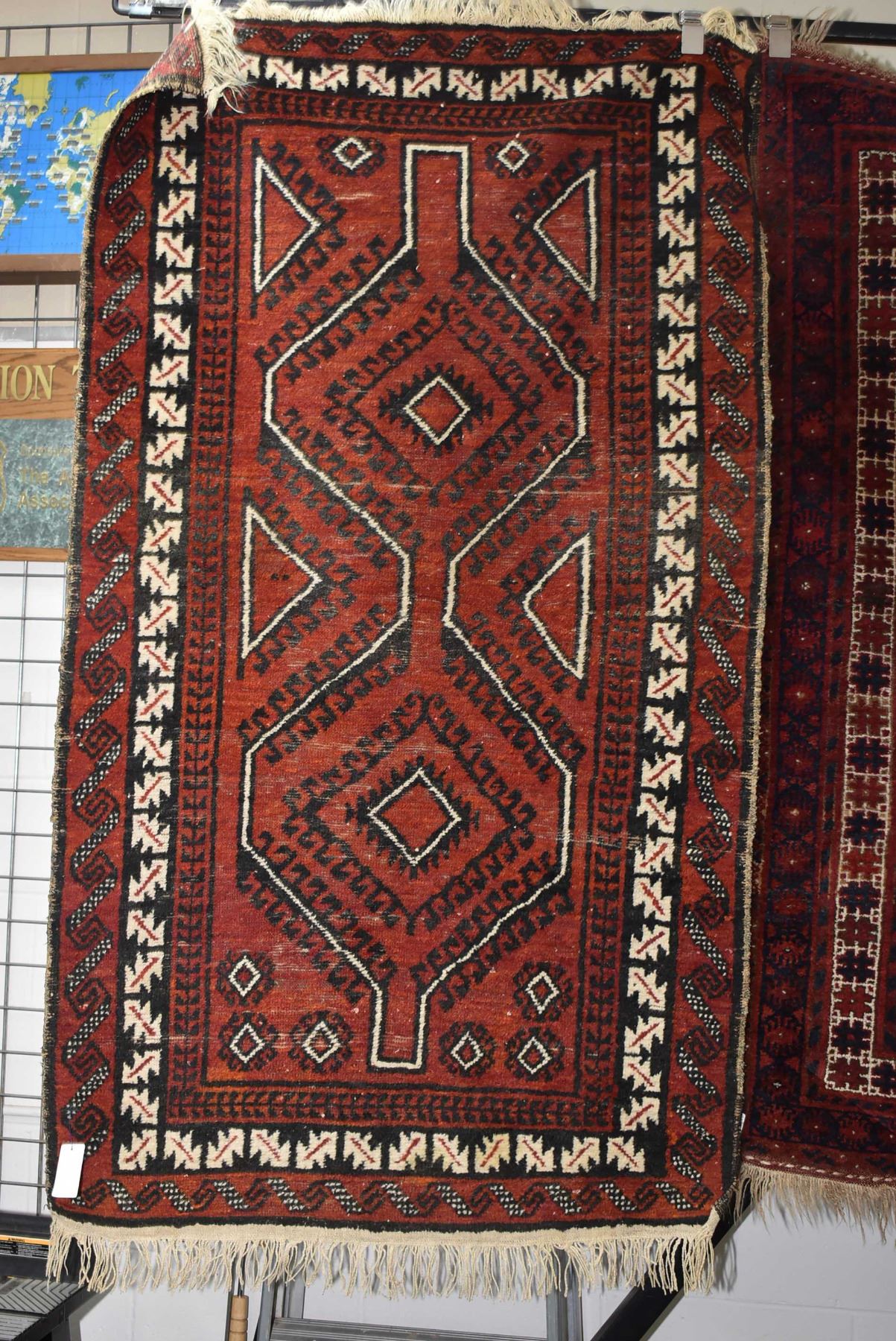 Vintage Iranian wool throw rug with double medallion in shades or red, black, white etc. 39" X 69"
