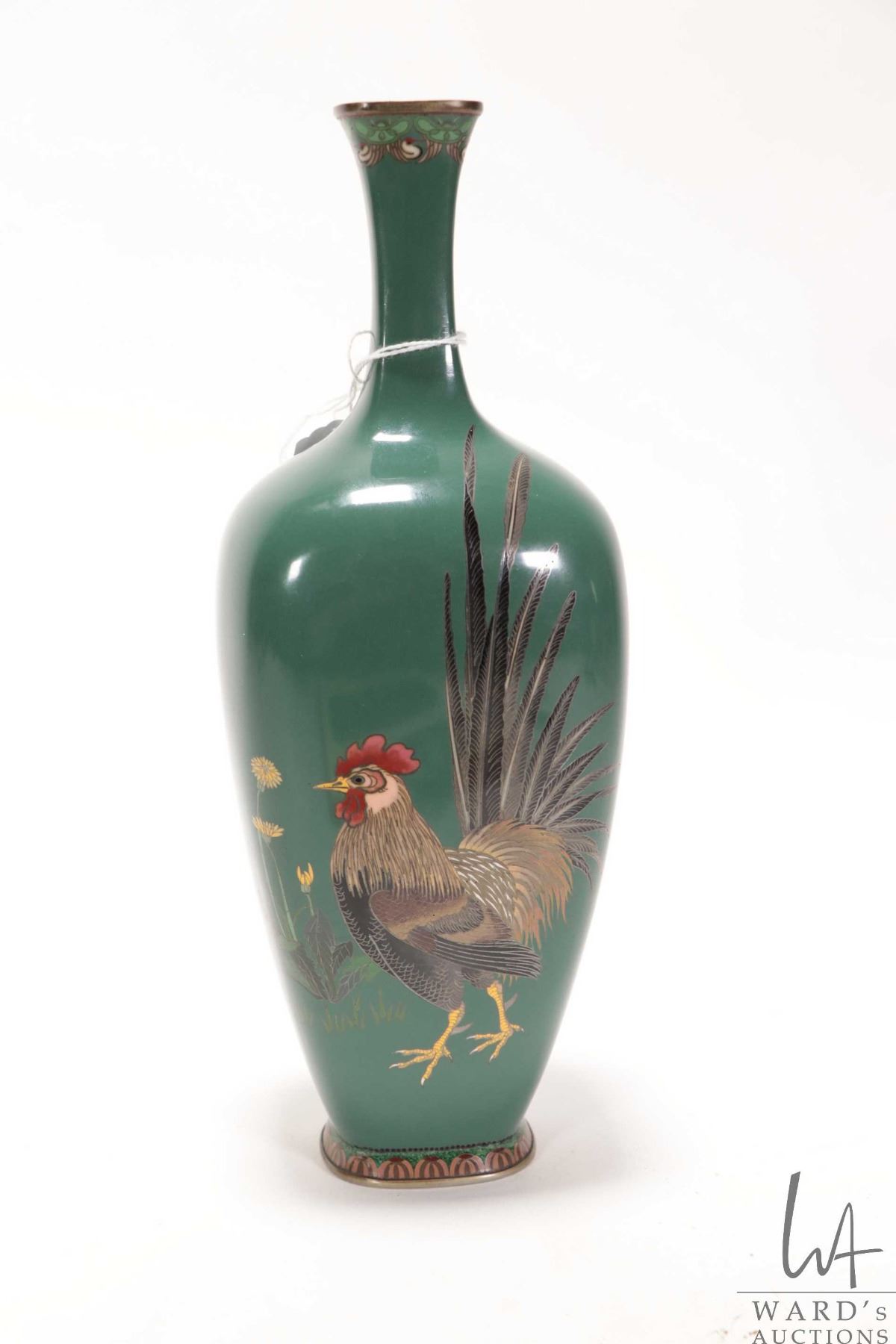 Vintage Japanese Meiji period Cloissone vase with dark green background, silver wire over copper and coloured enamelling. Possibly the work of Hayahsi Kodenji II, 10" in height