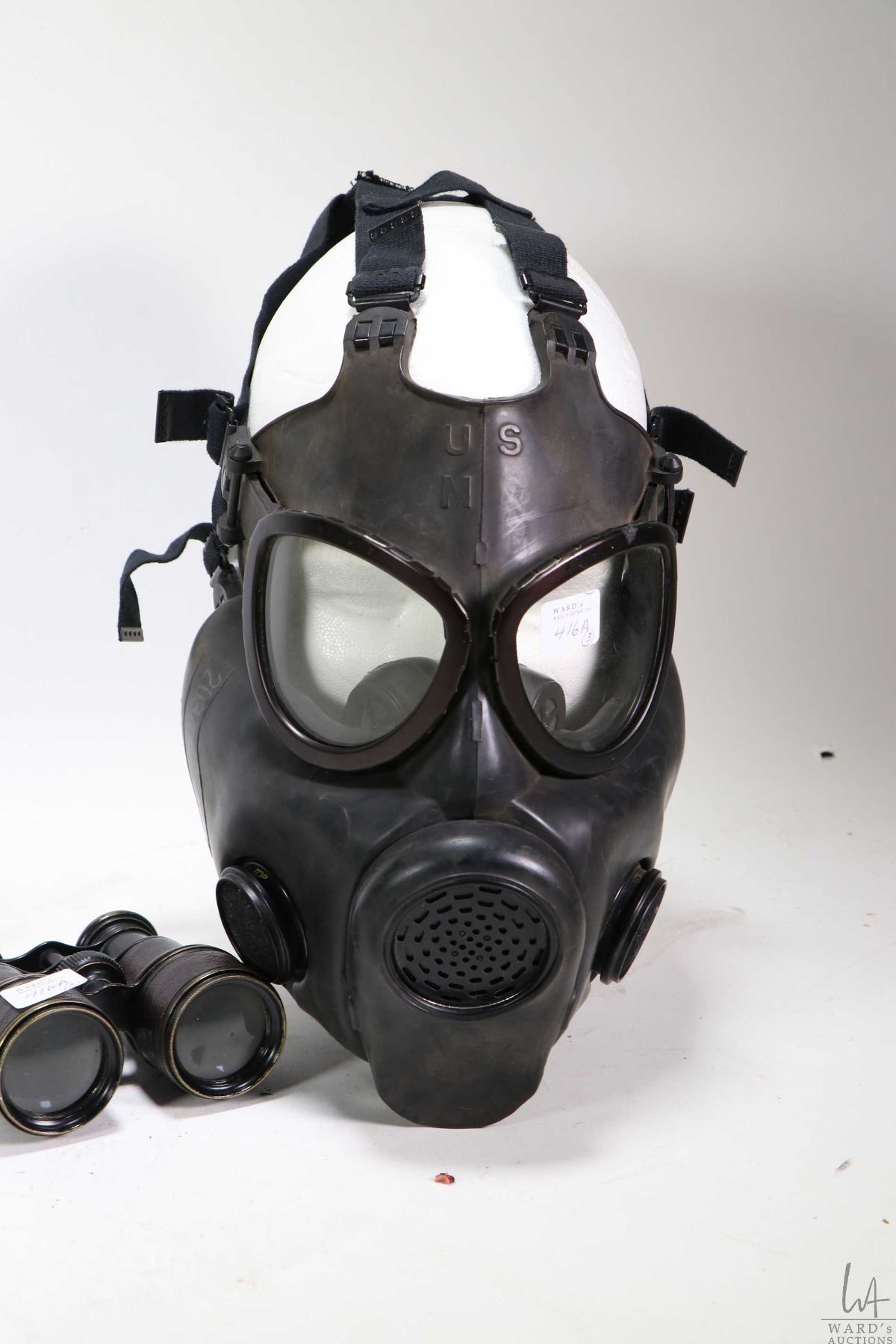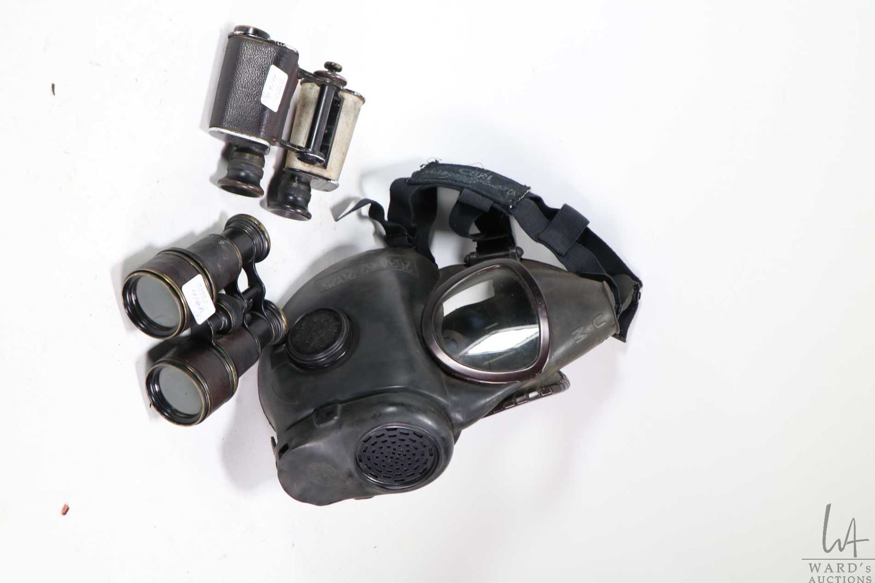 Vintage MSA Us military black rubber gas mask respirator and two pairs of vintage binoculars