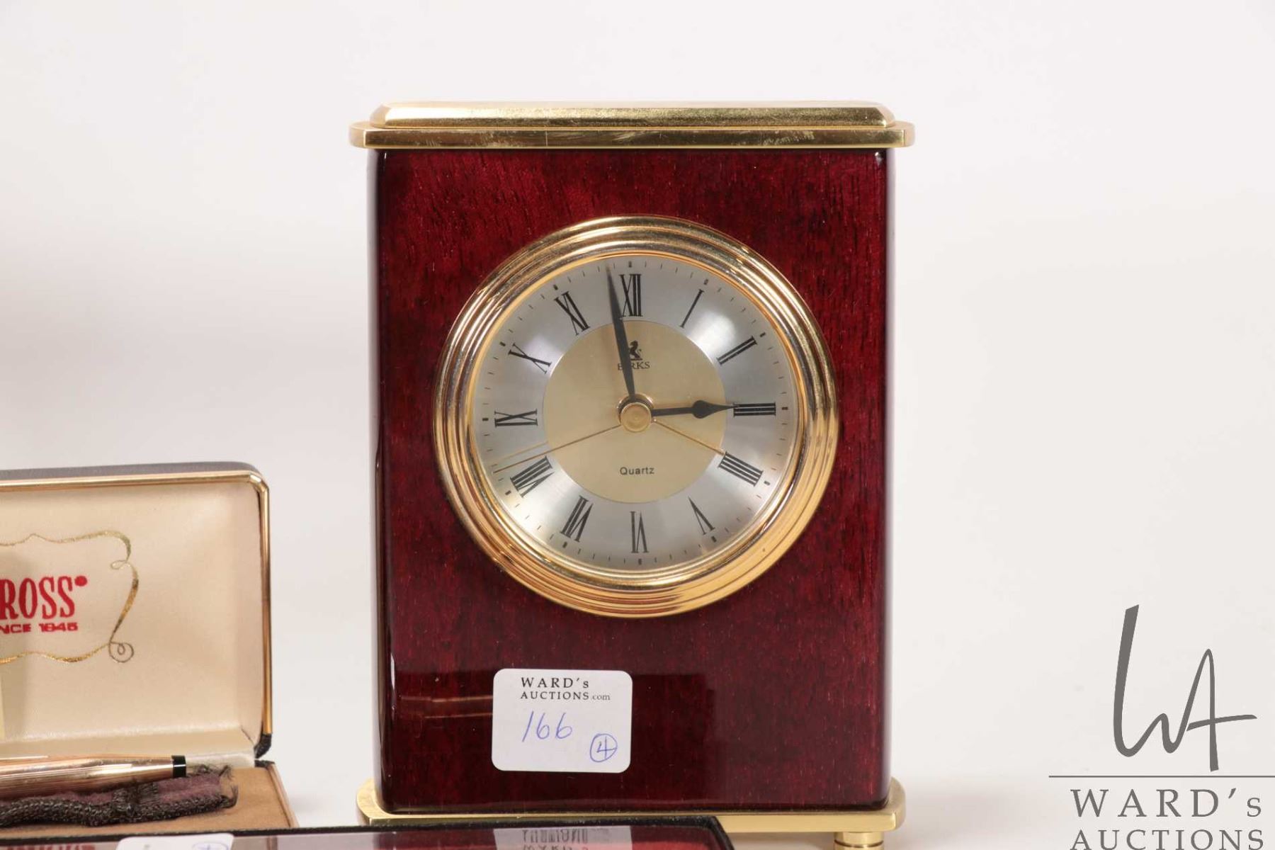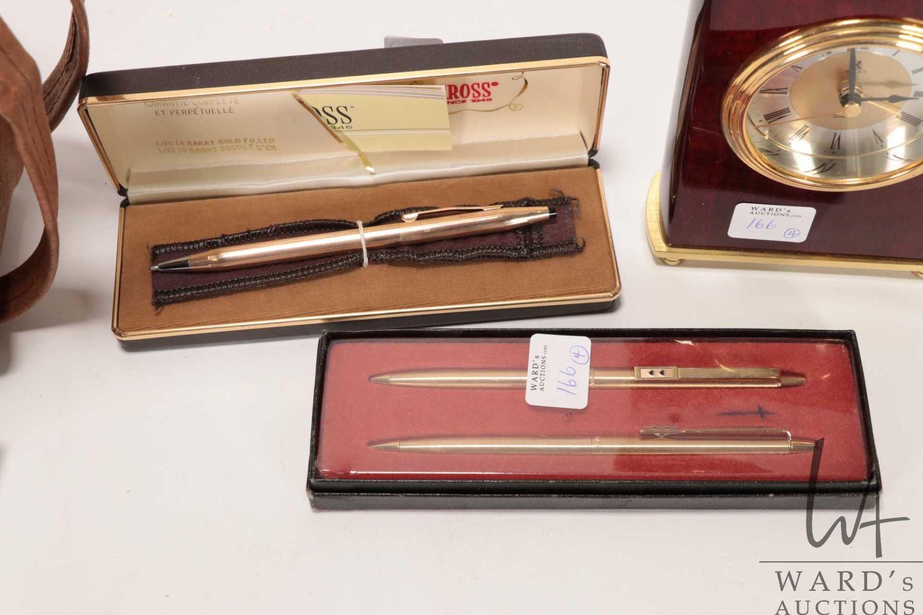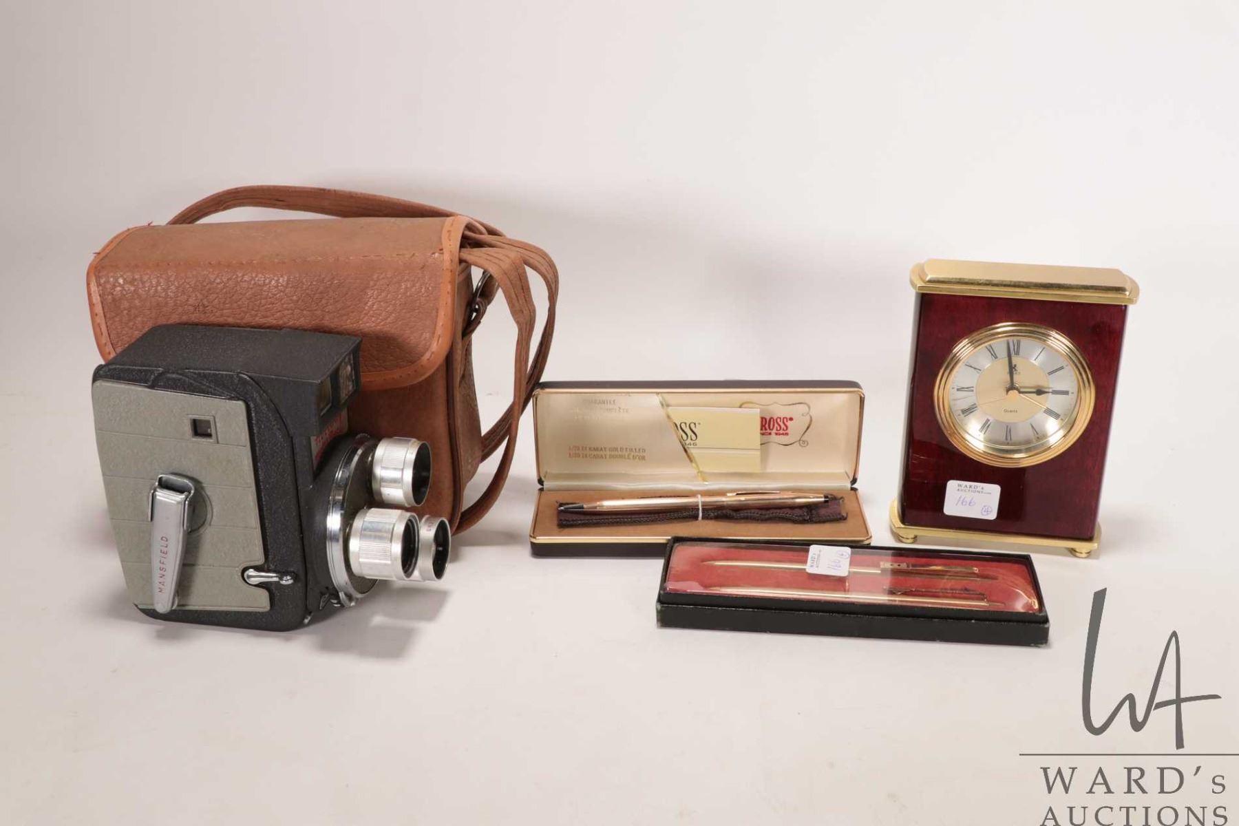 Vintage Mansfield Holiday Meter Matic 8mm movie camera with carry case, not tested, a Birks quartz mantle clock and boxed pens including Paper Mate pen and pencil set and a Cross gold plated biro