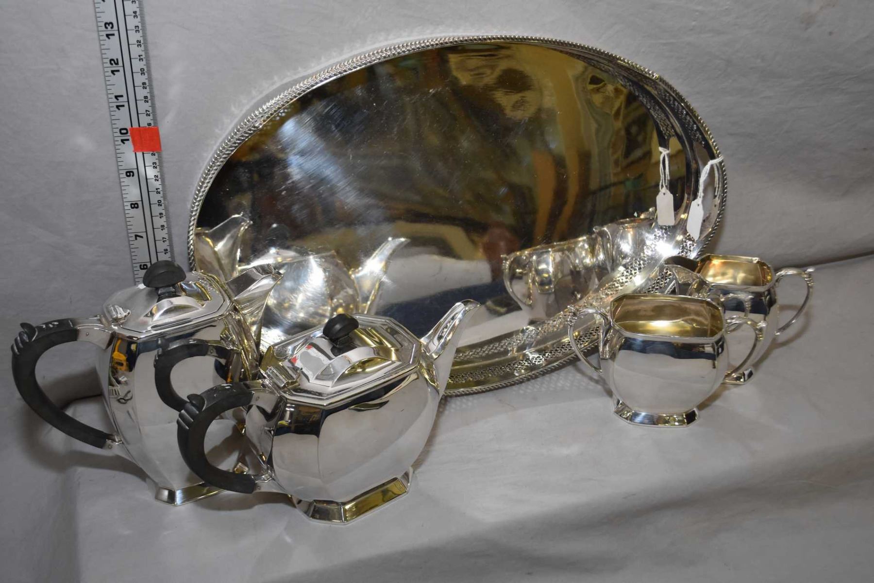 Vintage Mappin and Webb deco style silver-plate tea service on silver-plate tray