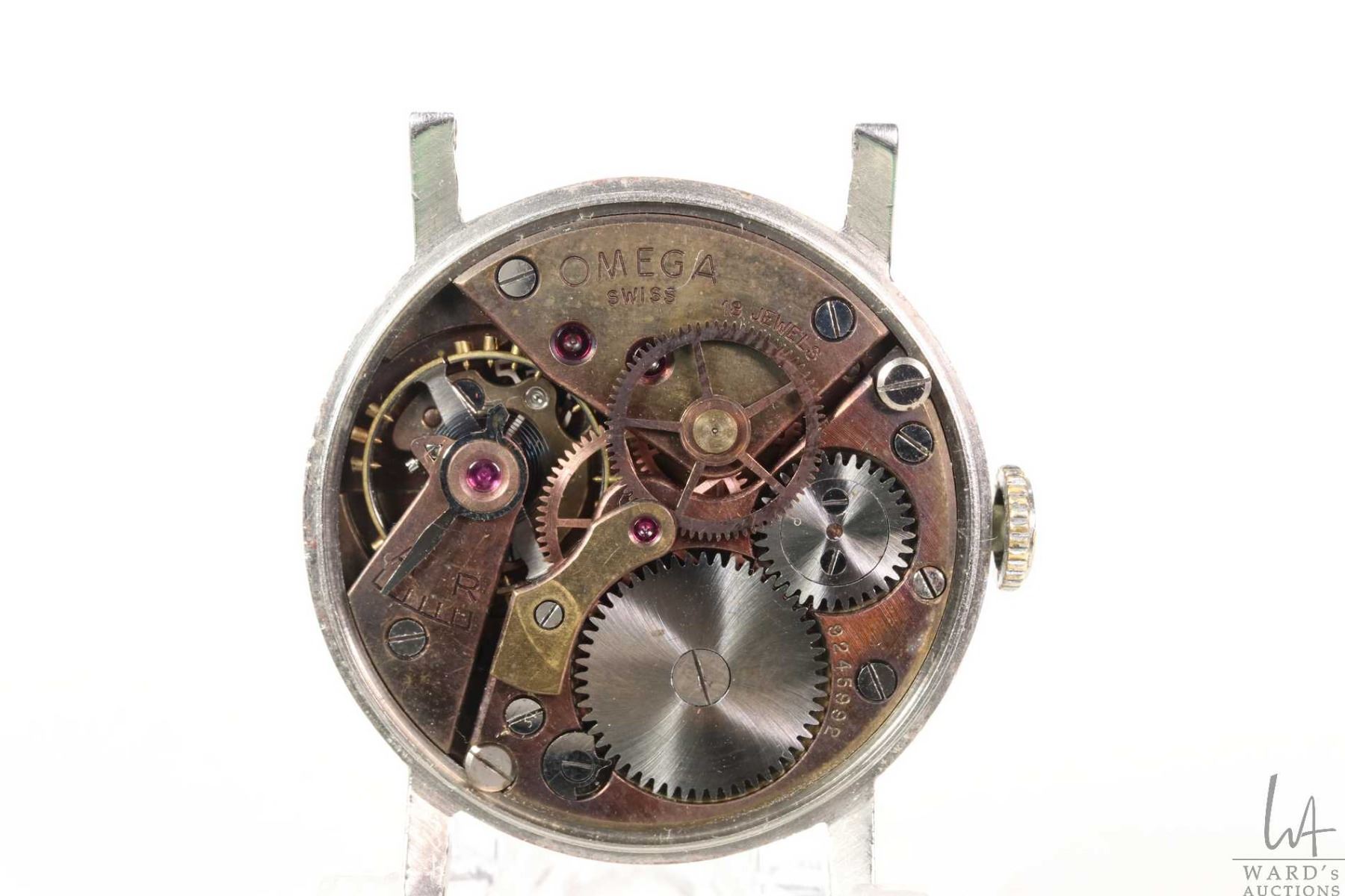 Vintage Omega hand wind 18 jewel wrist watch with stainless steel case, circa 1940, working at time of cataloguing. Possible military issue, but not marked. Retail replacement value $2,400.00