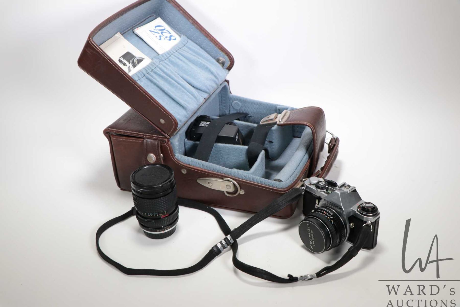 Vintage Pentax ME 35mm camera with Pentax 1:1:7 50mm lens, plus two Tokina lenses including a 28-70mm zoom and a 80-200mm zoom lens plus carrying case manual and flash etc.