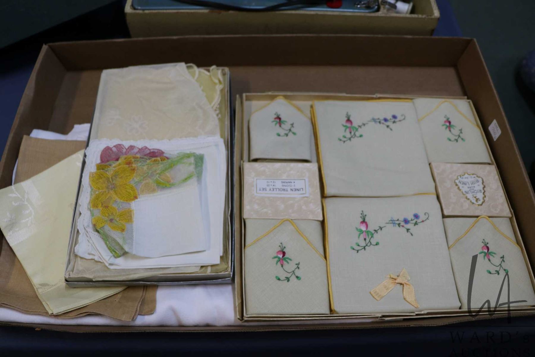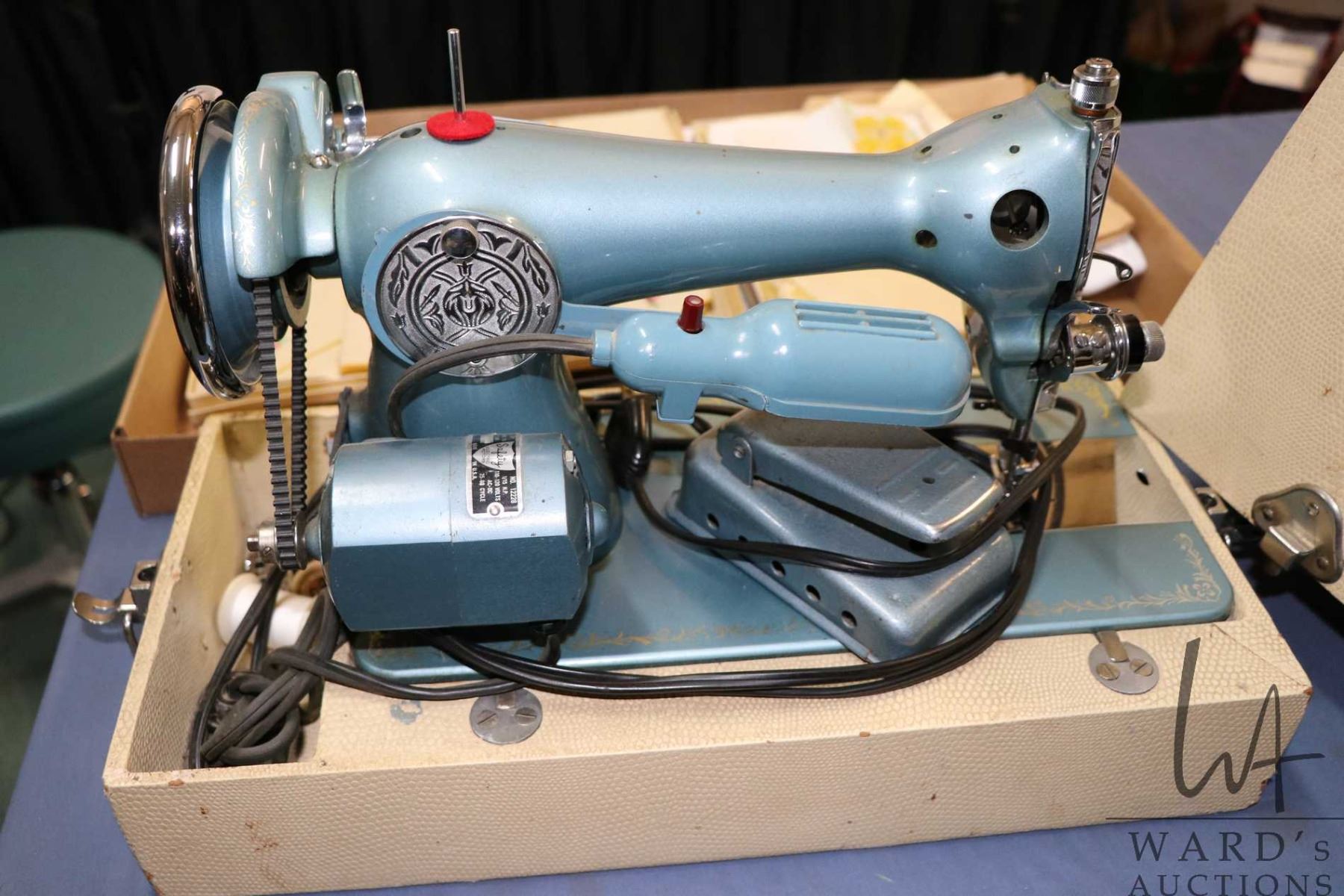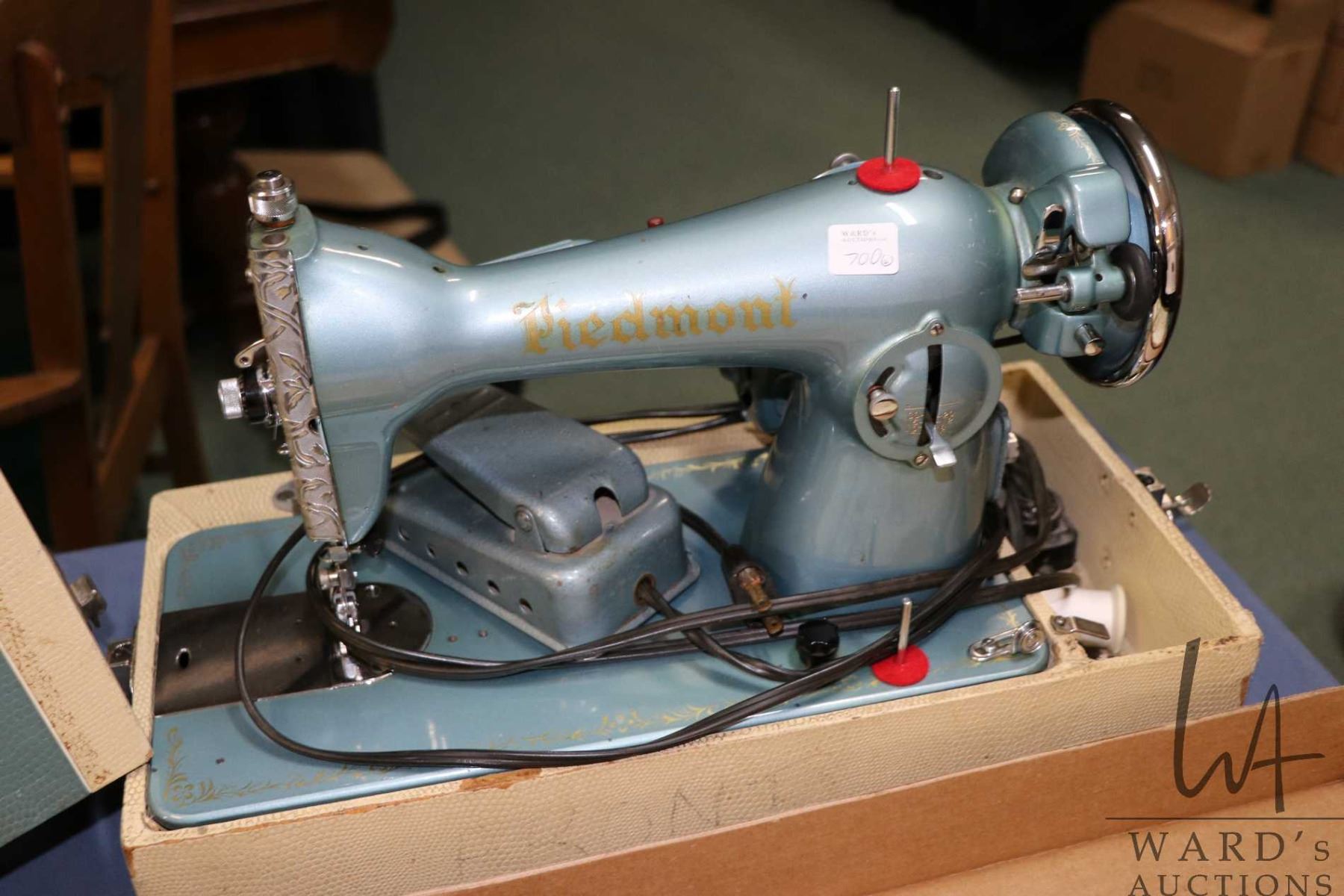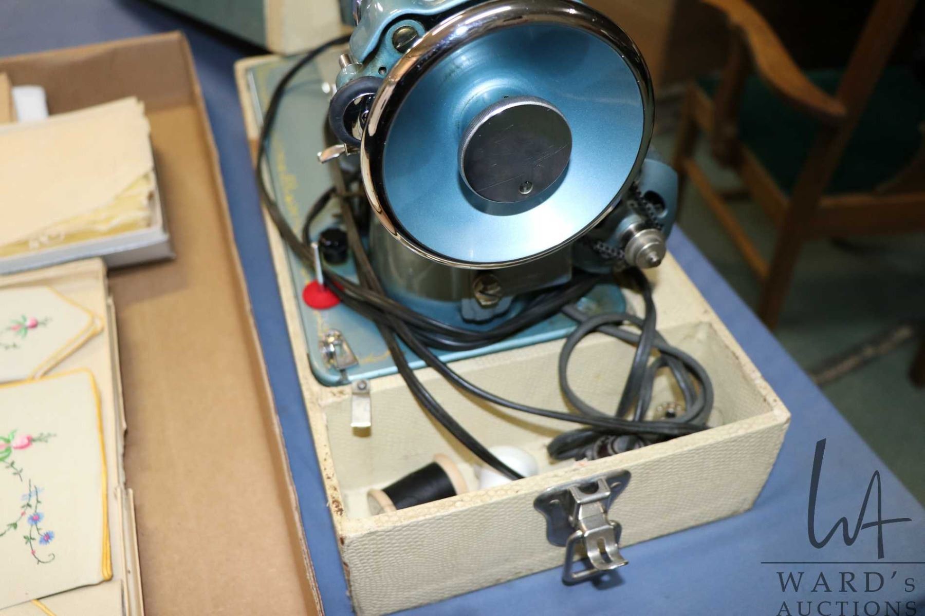 Vintage Piedmont portable electric sewing machine, working at time of cataloguing and a selection of vintage linens including boxed Irish set