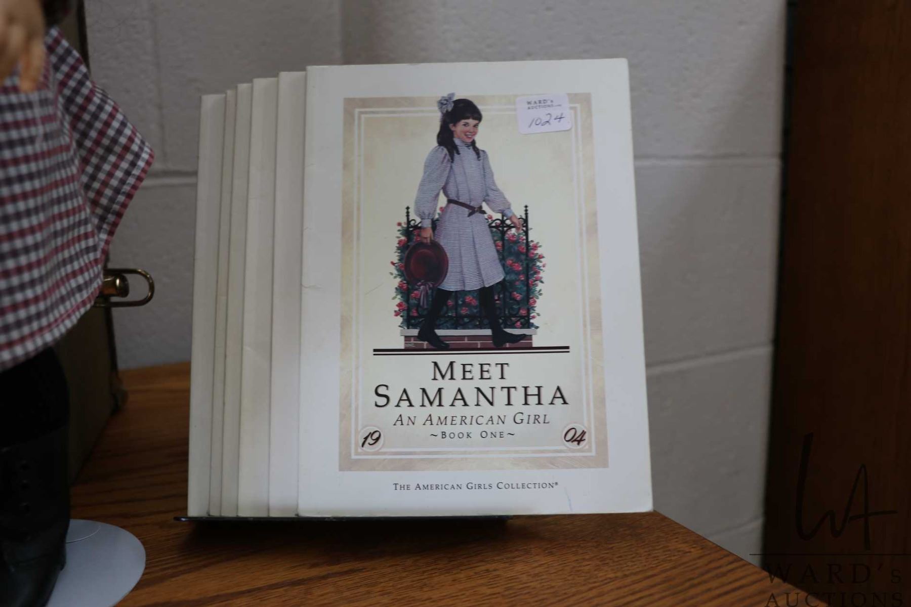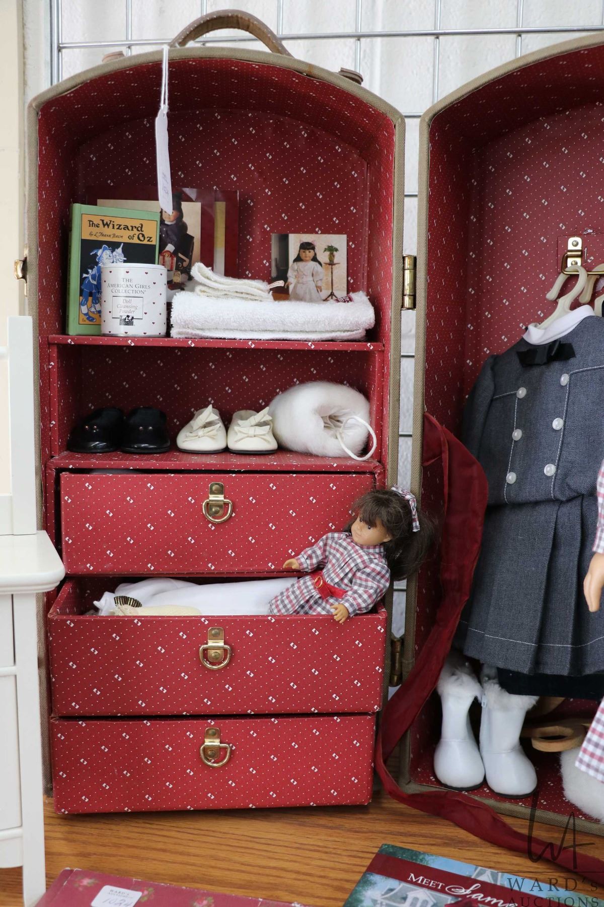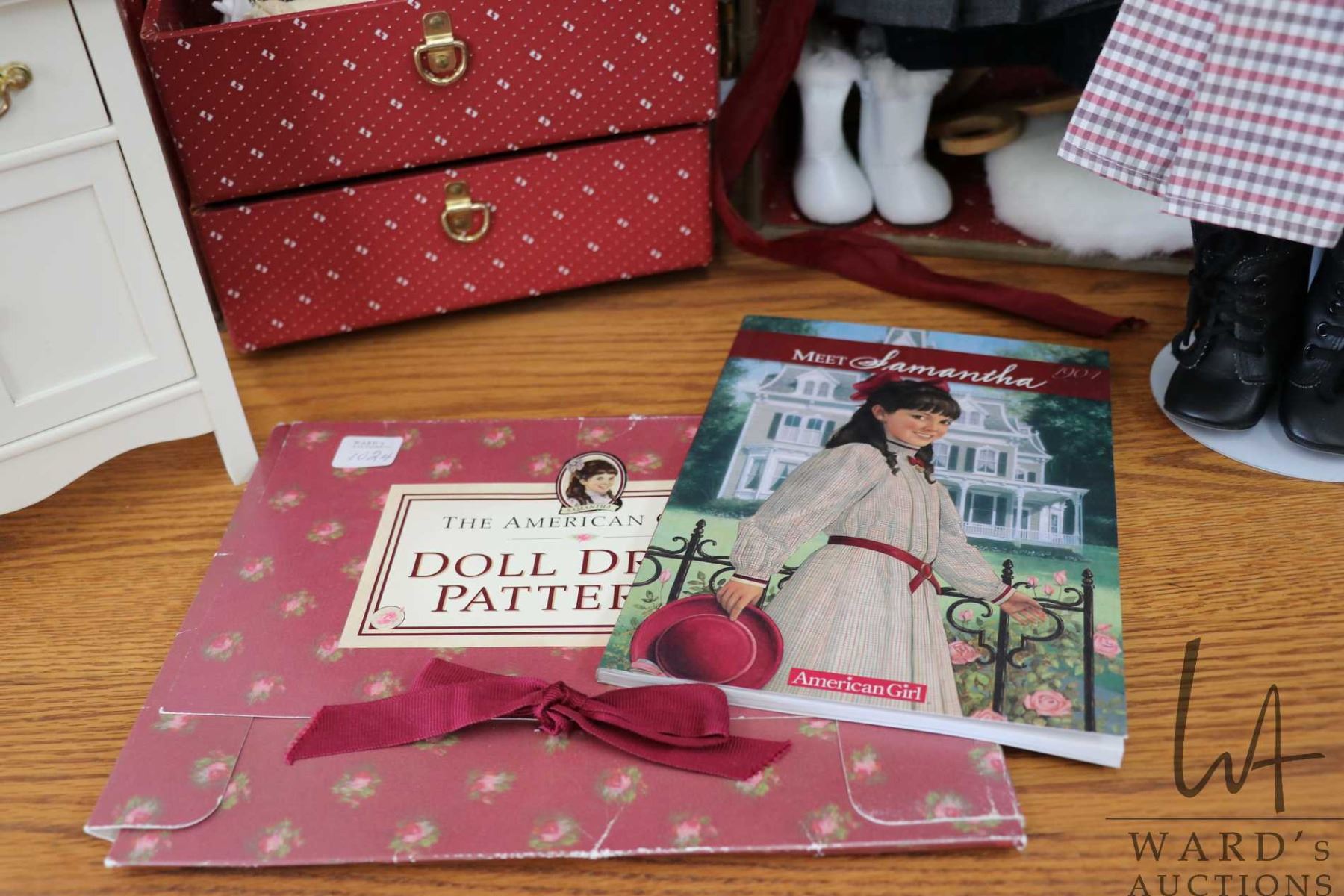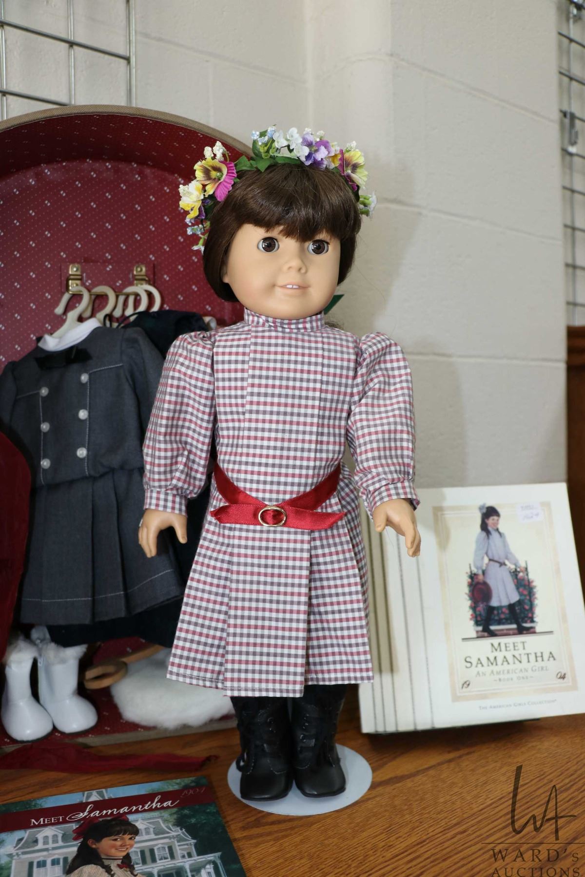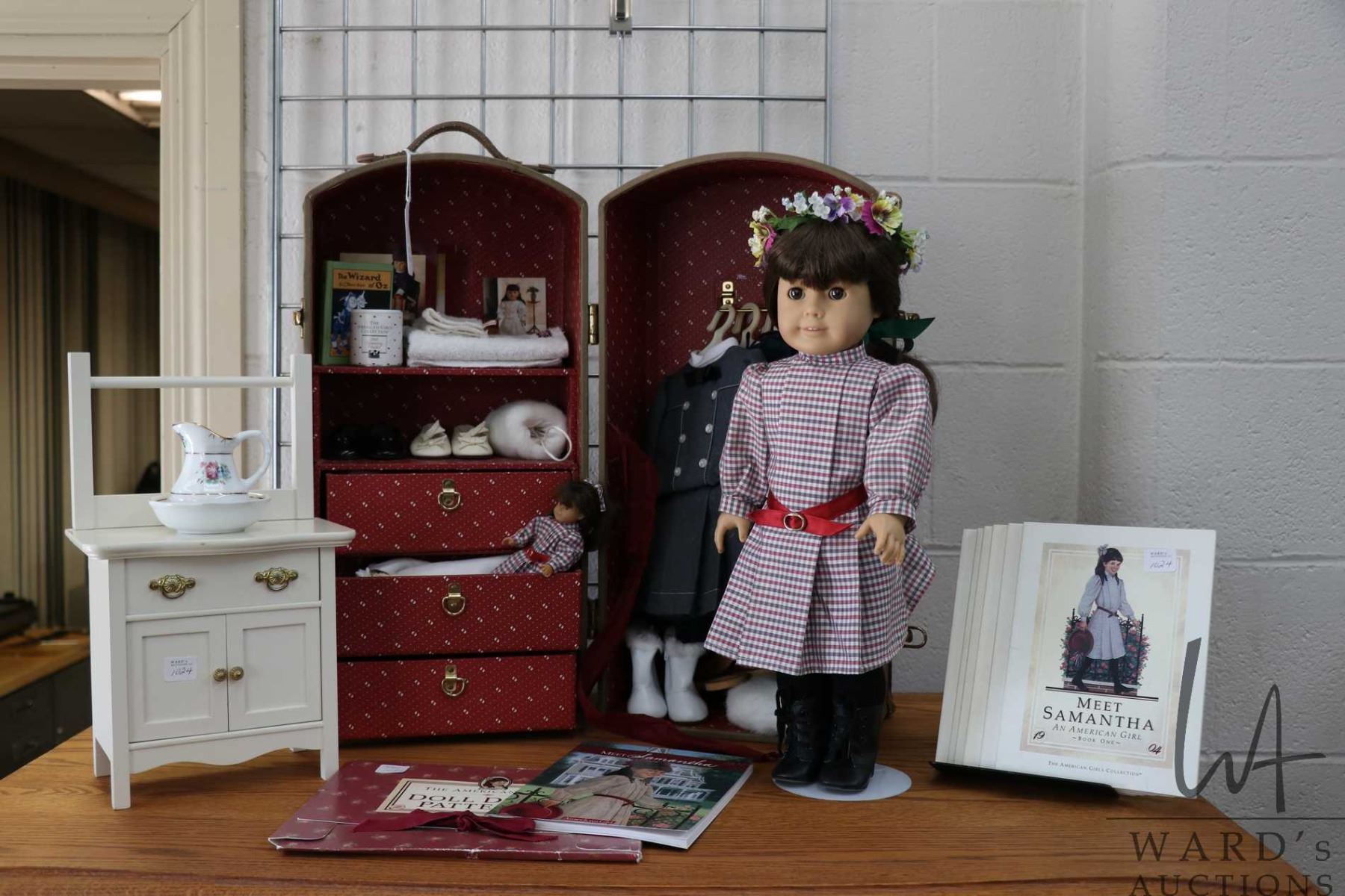 Vintage Pleasant Company American girl Samantha with Pleasant company trunk, dresses, accessories, a selection of Samantha books, clothes patterns and washstand with bowl and jug
