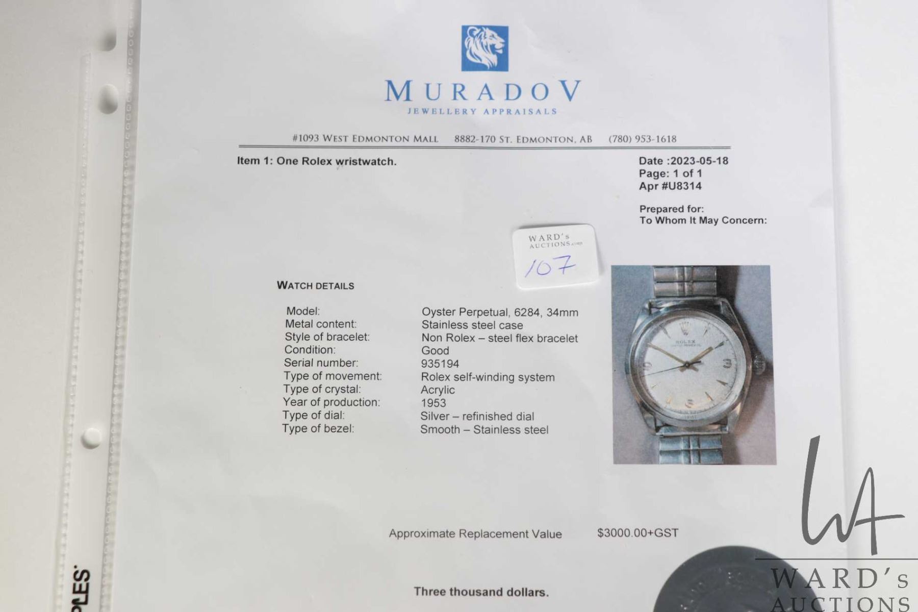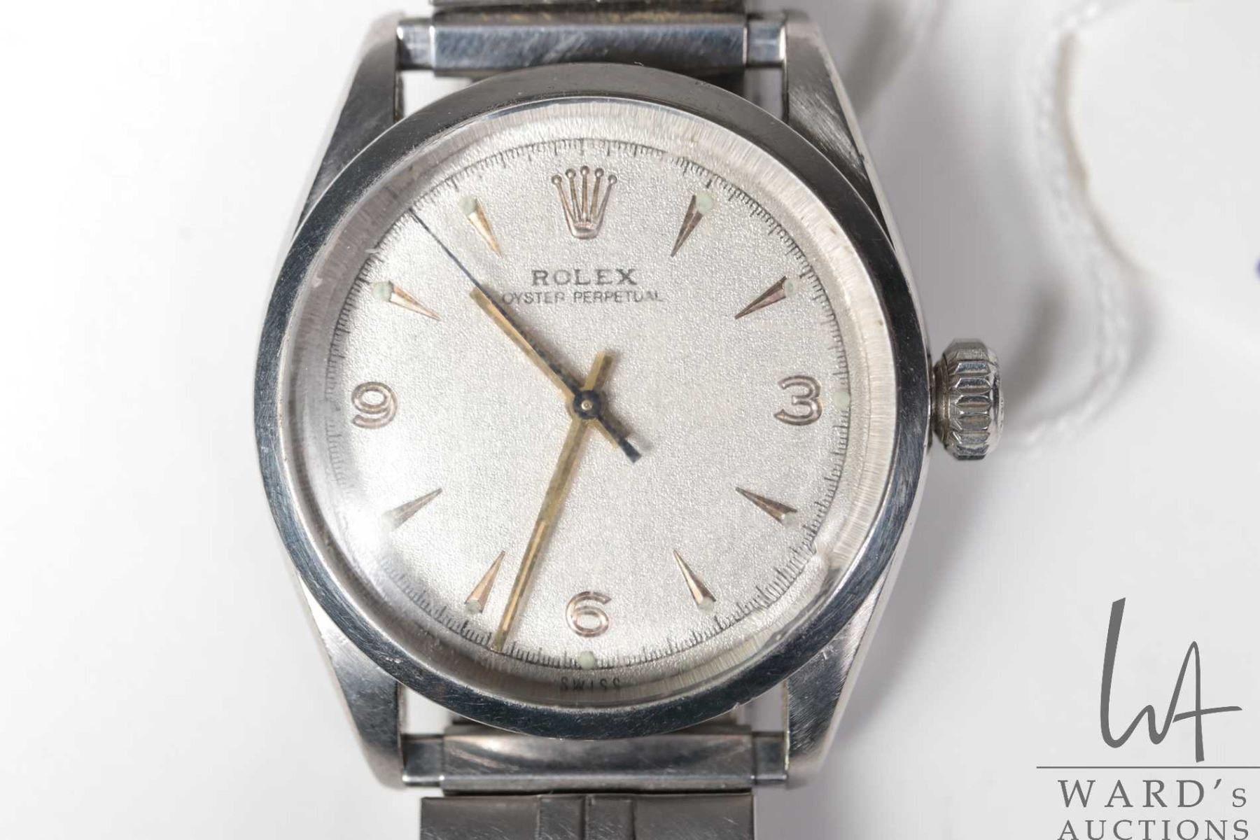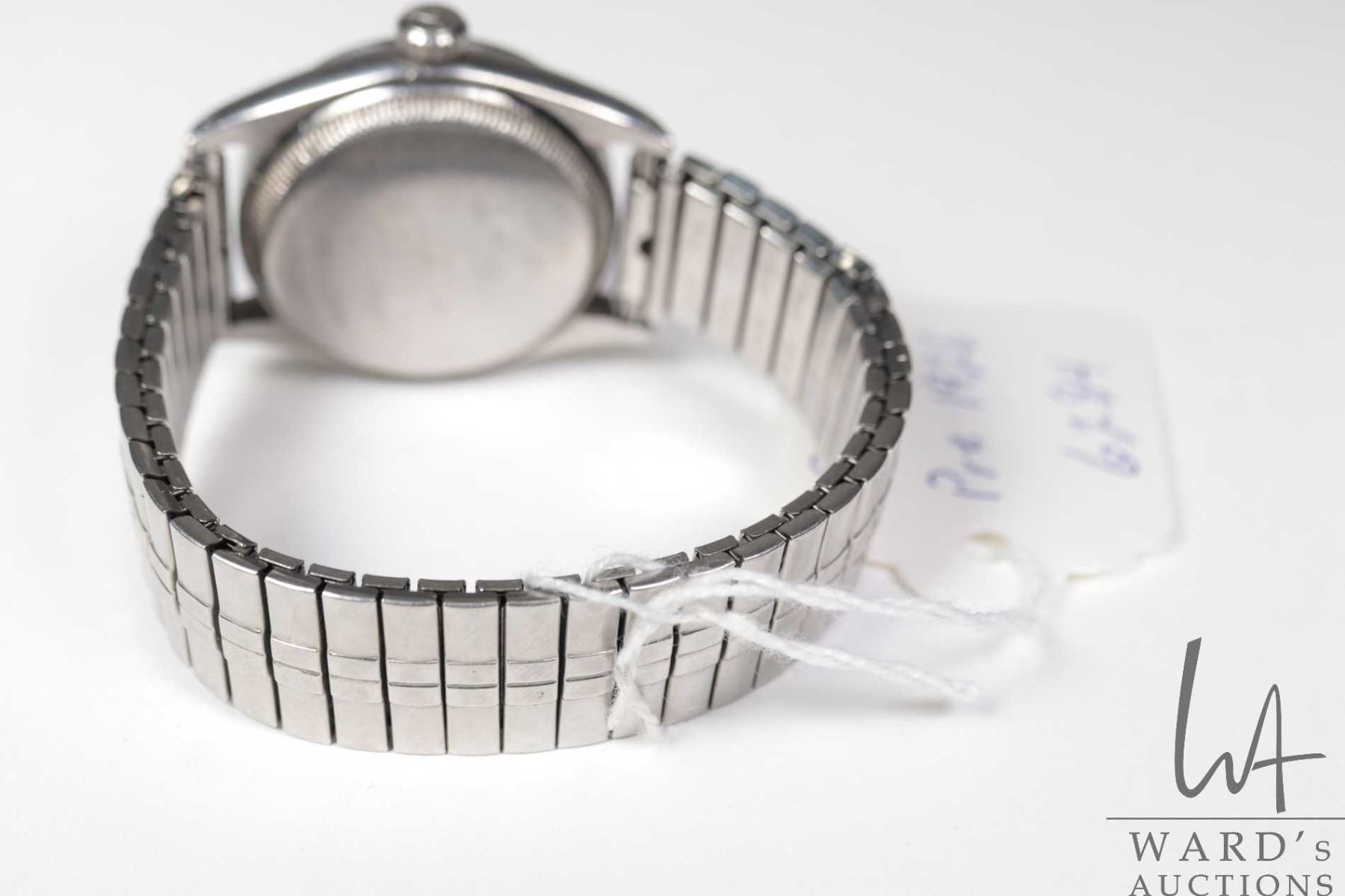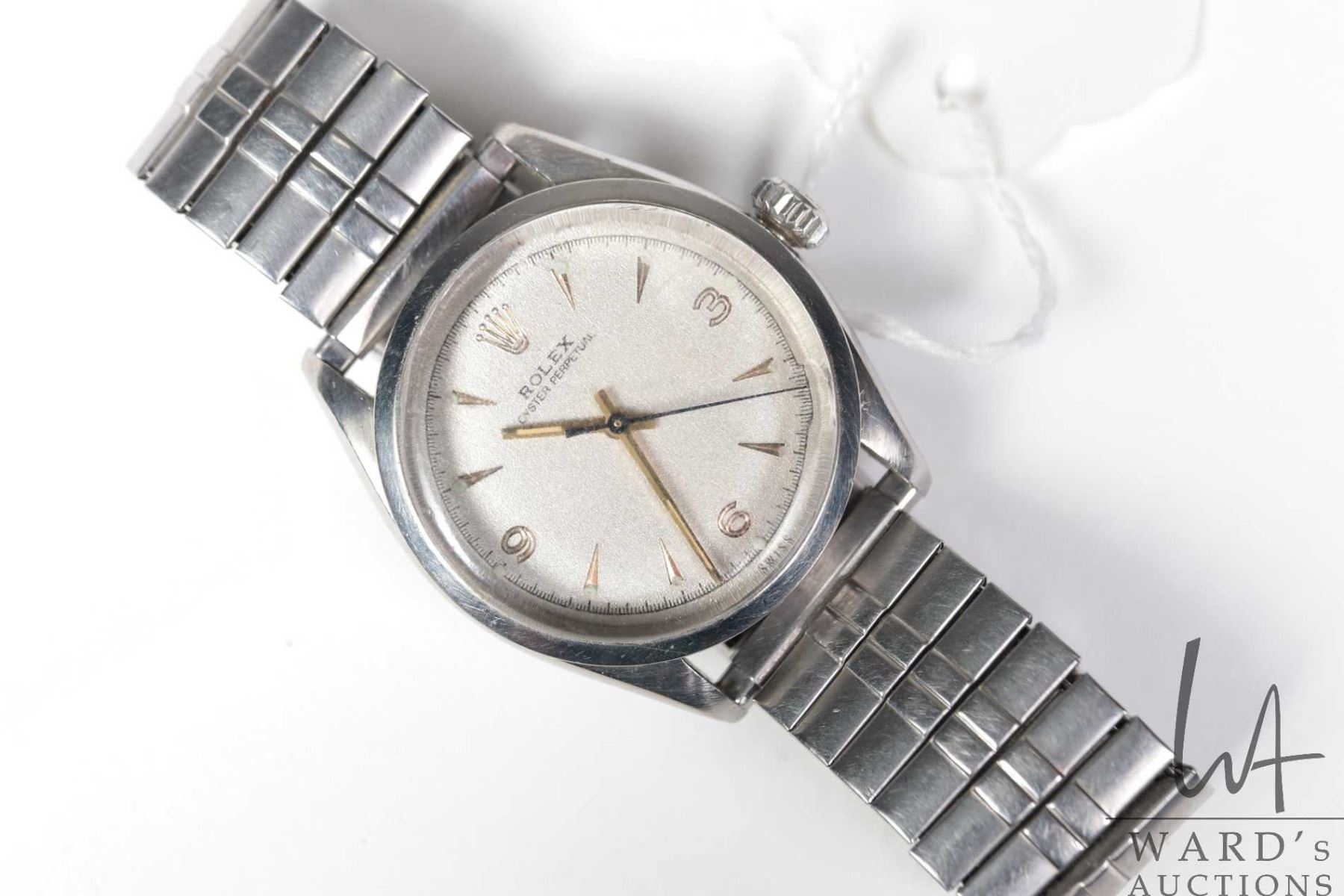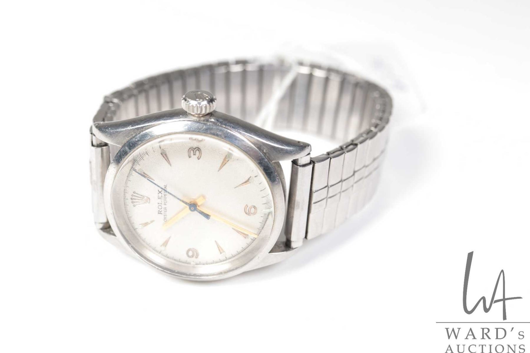 Vintage Rolex Oyster Perpetual wrist watch, in stainless steel case, self- winding system, serial no. 935194, circa 1953, includes non Rolex flex steel bracelet. Retail replacement value $ 3000.00