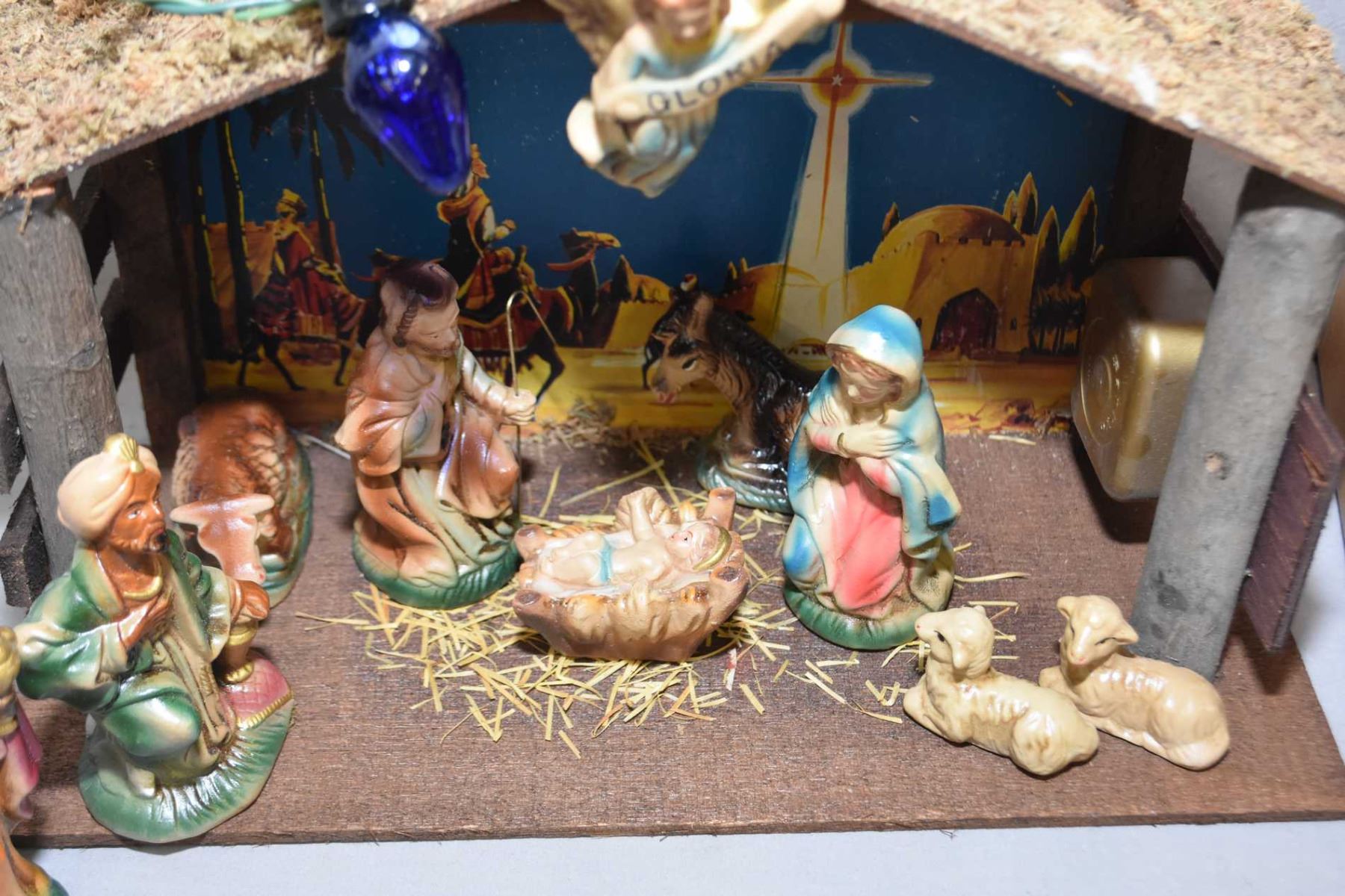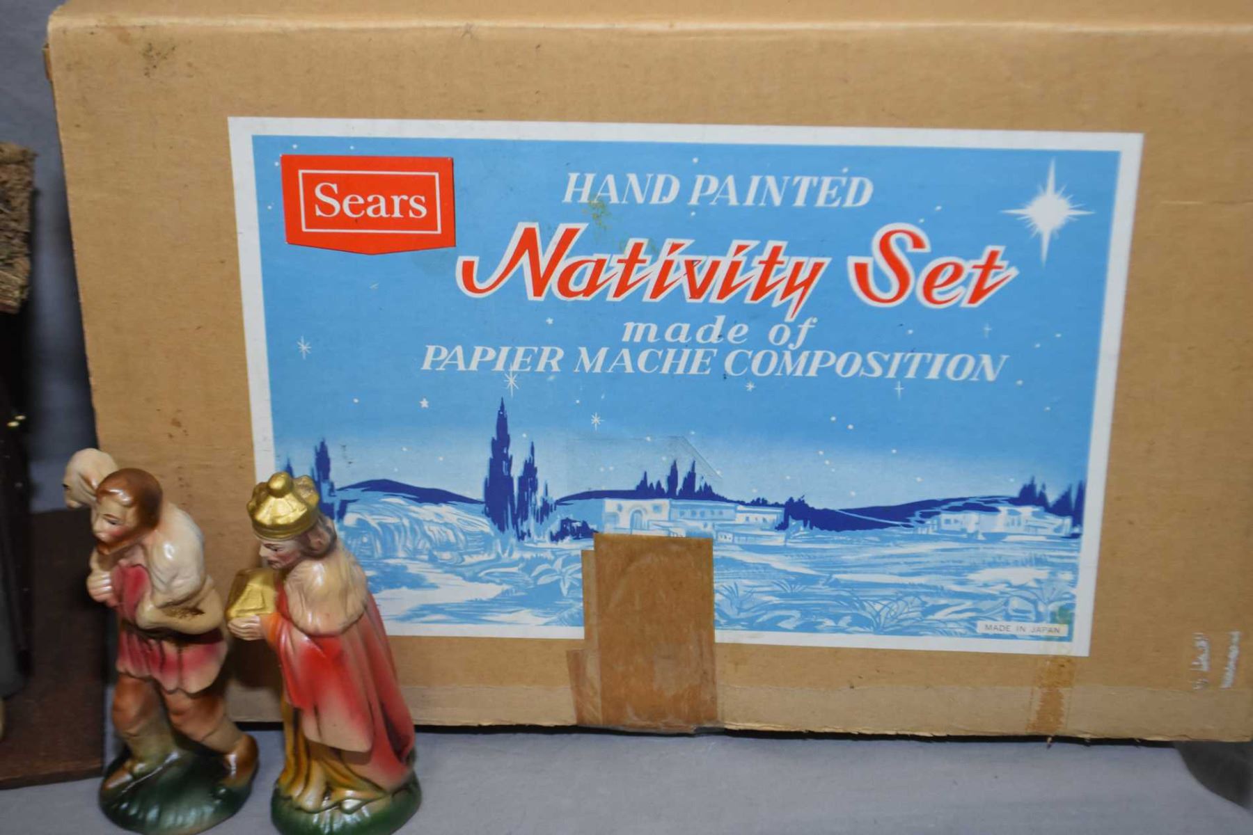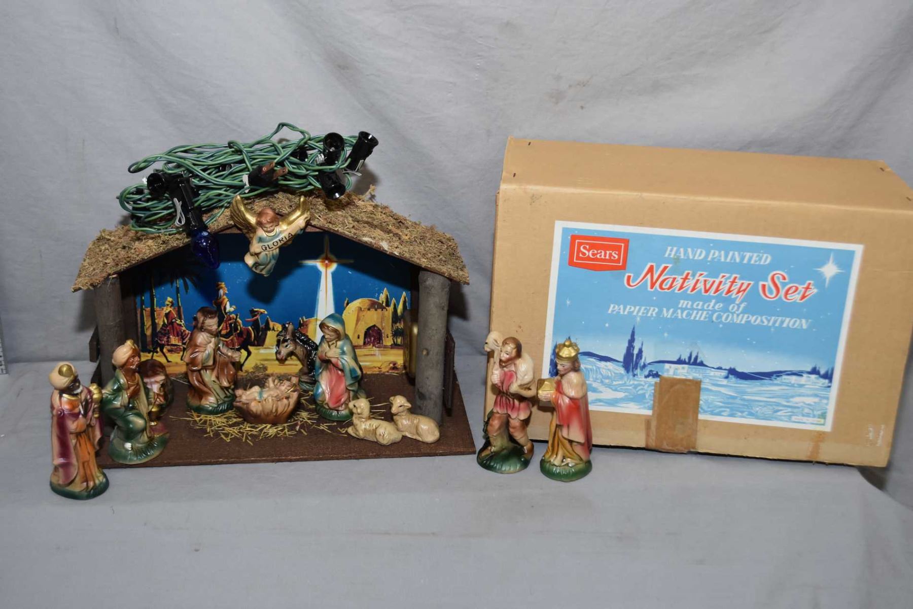 Vintage Sear nativity with papier mache figures, musical stable, Christmas lights and original box