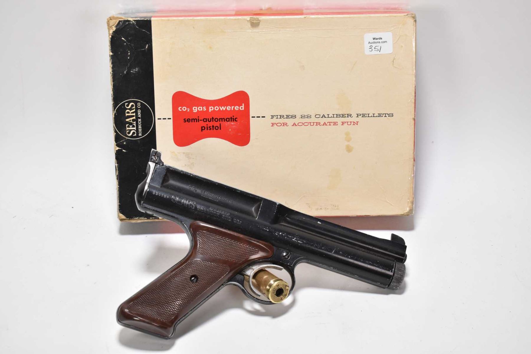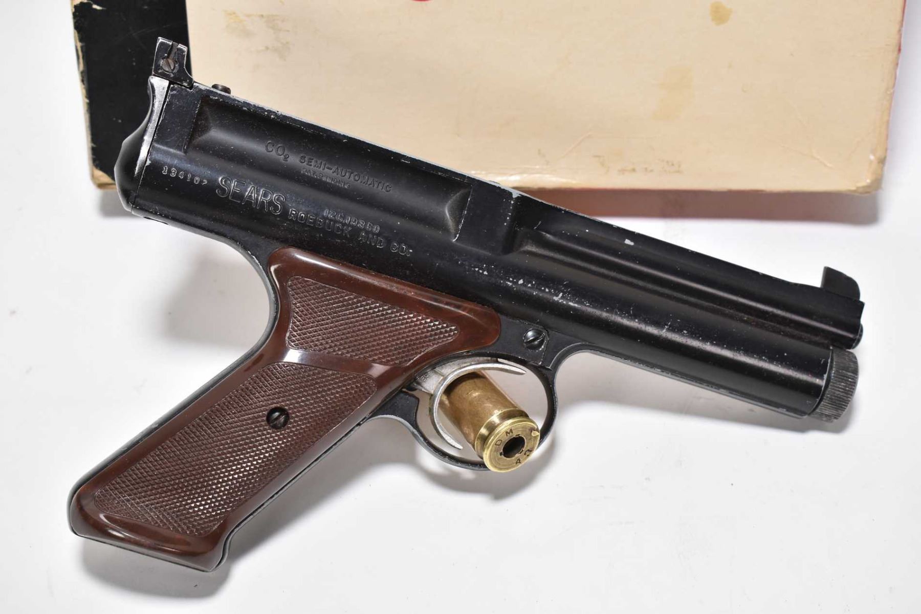 Vintage Sears Roebuck and Co. Co2 gas powered semi-automatic pistol with original box. .22 cal. 495 fps. No Pal required