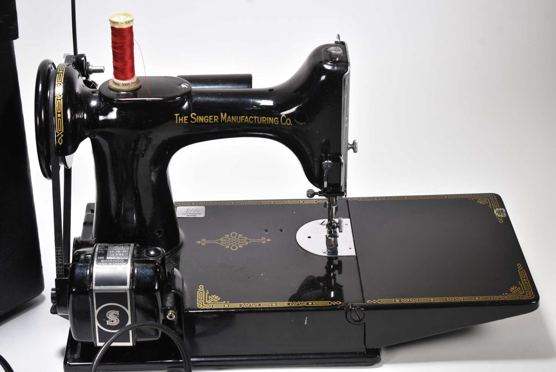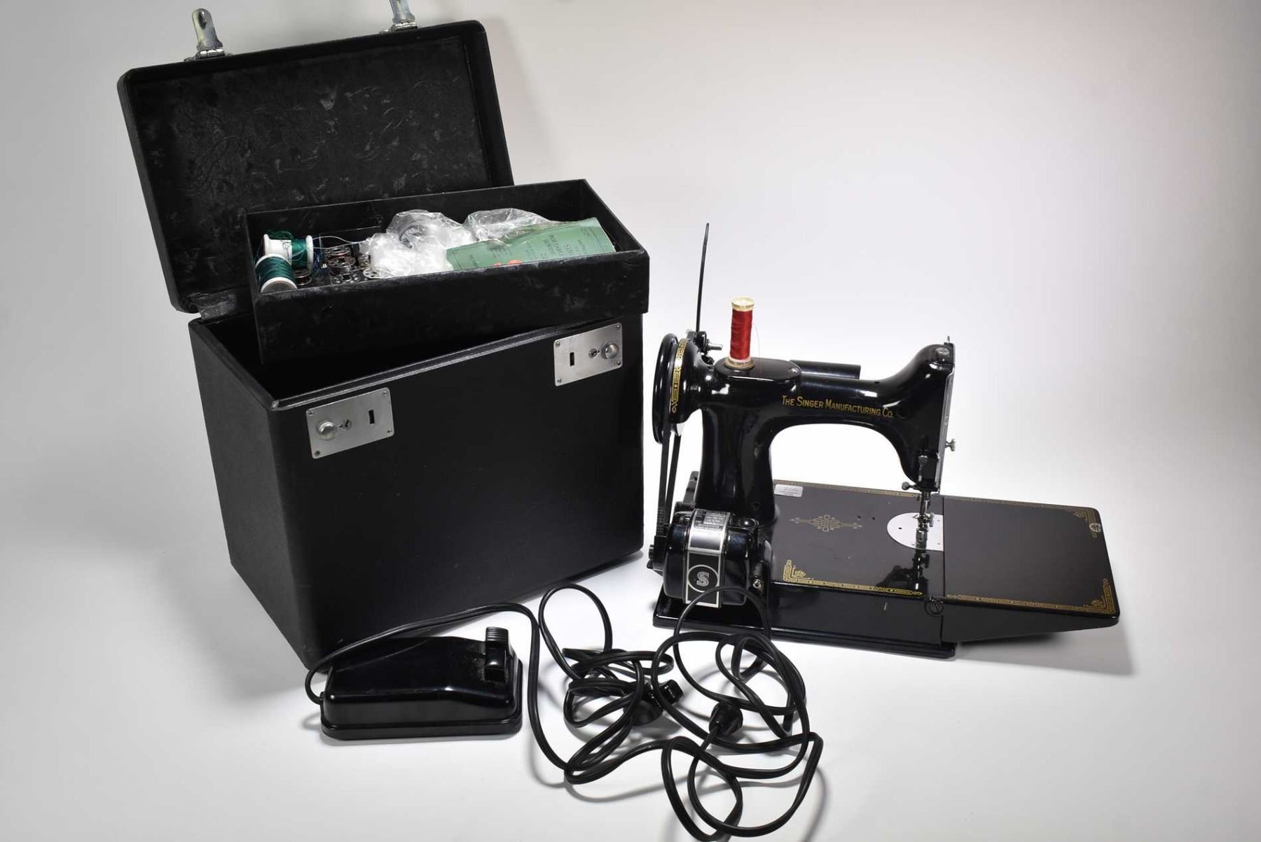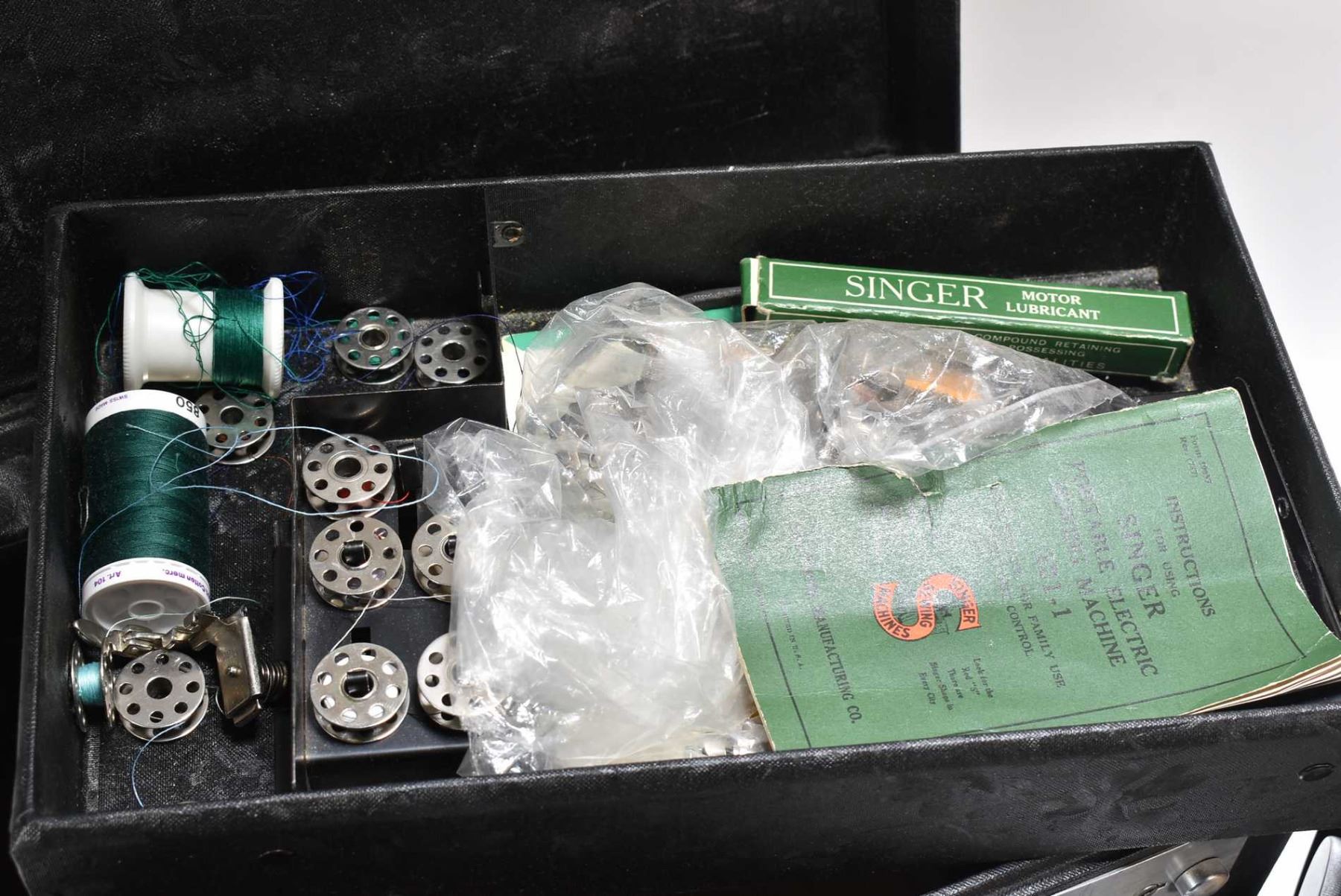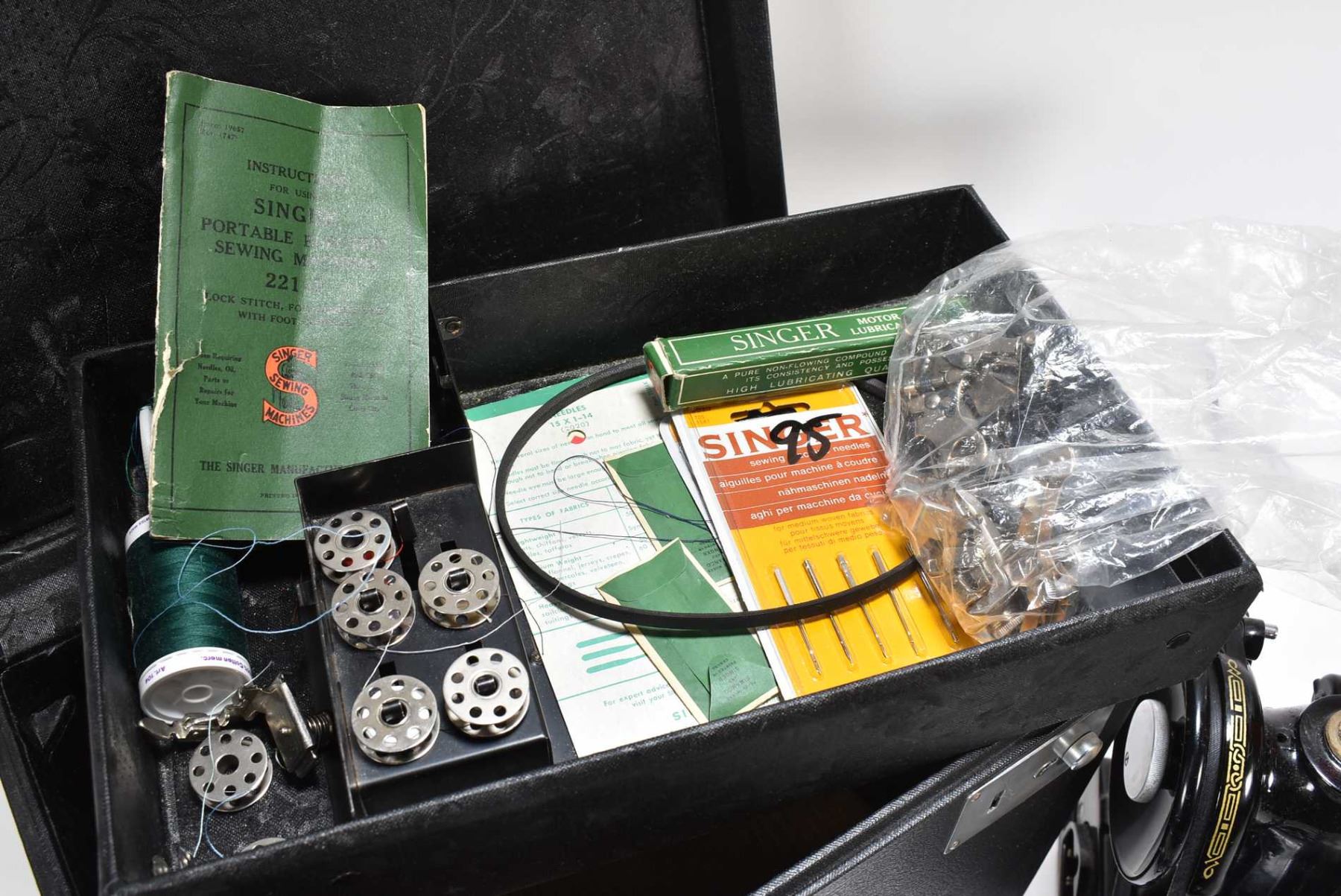 Vintage Singer Featherweight portable sewing machine with fitted carrying case, twelve bobbins, spare needles, spare belt, six sewing feet, instruction manual, Singer motor lubricant etc.