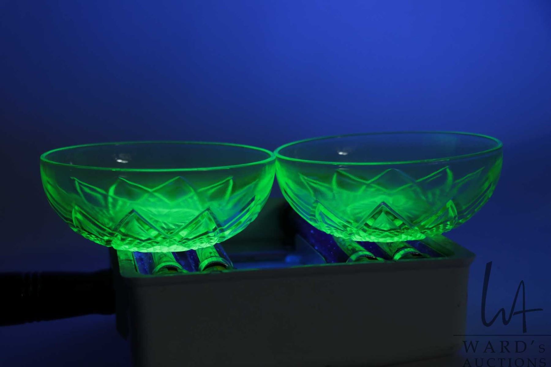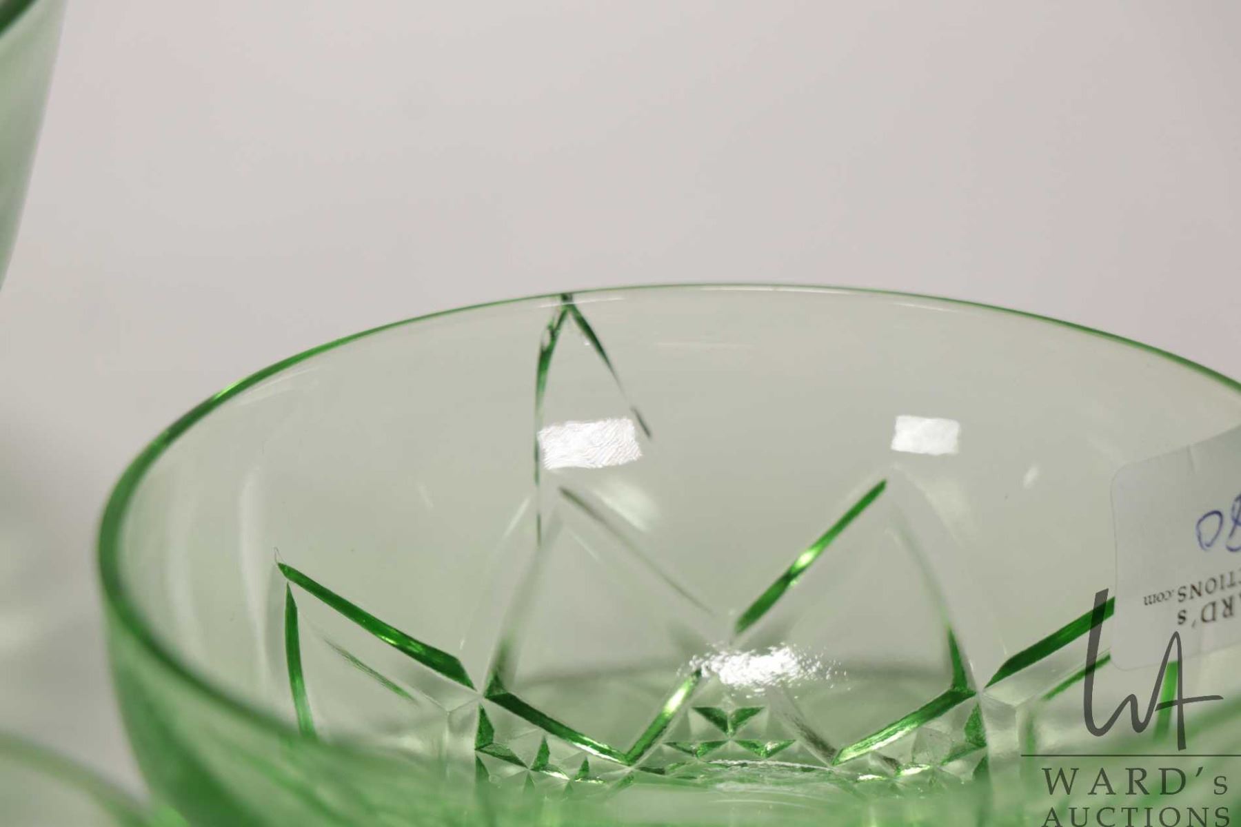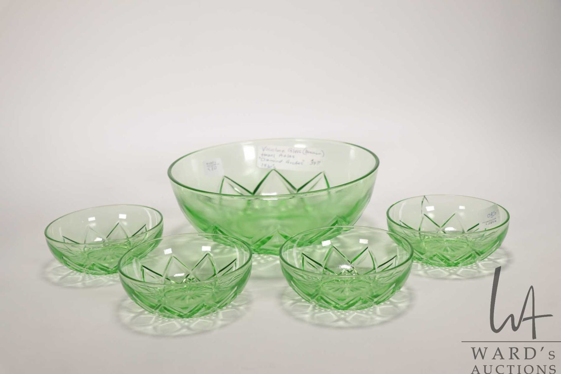 Vintage Uranium glass dessert set including serving bowl and four nappies, note: one nappy is cracked