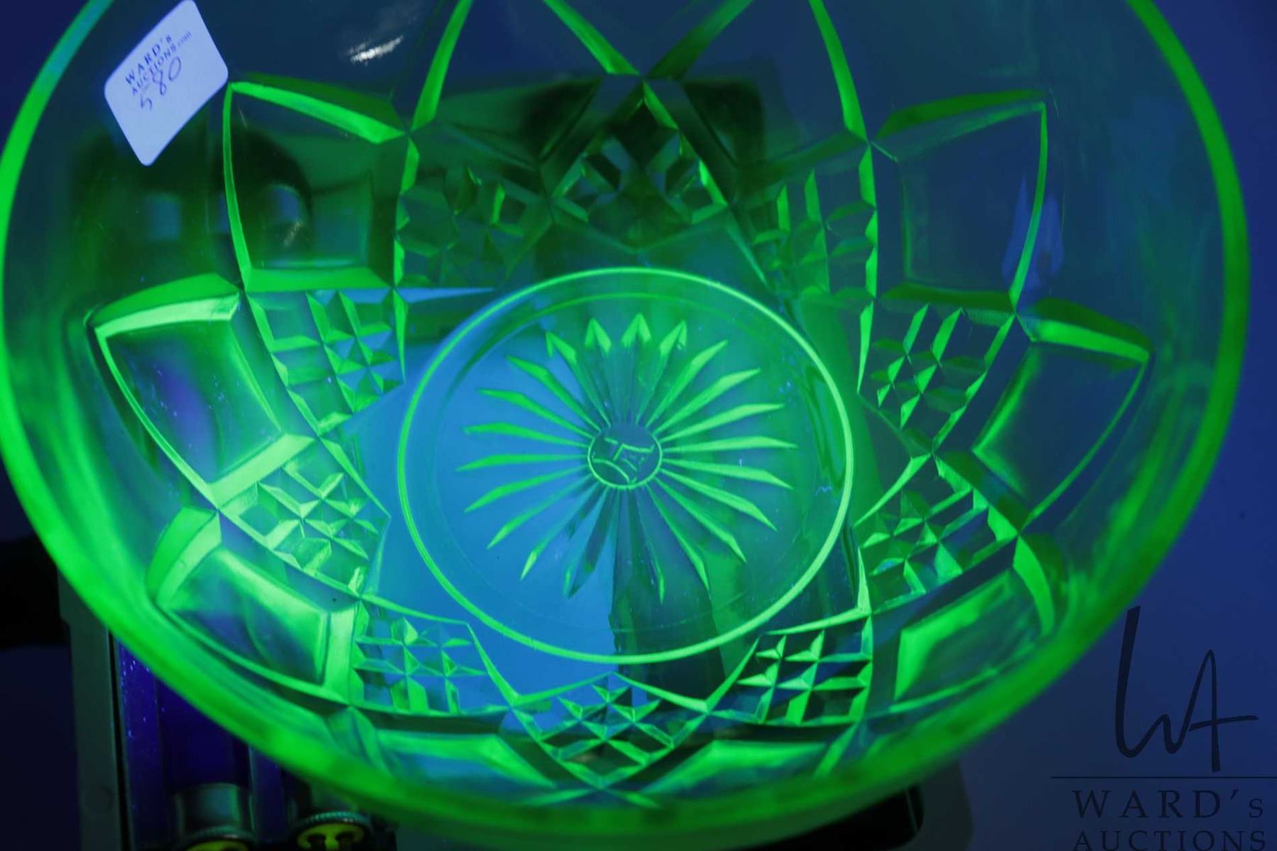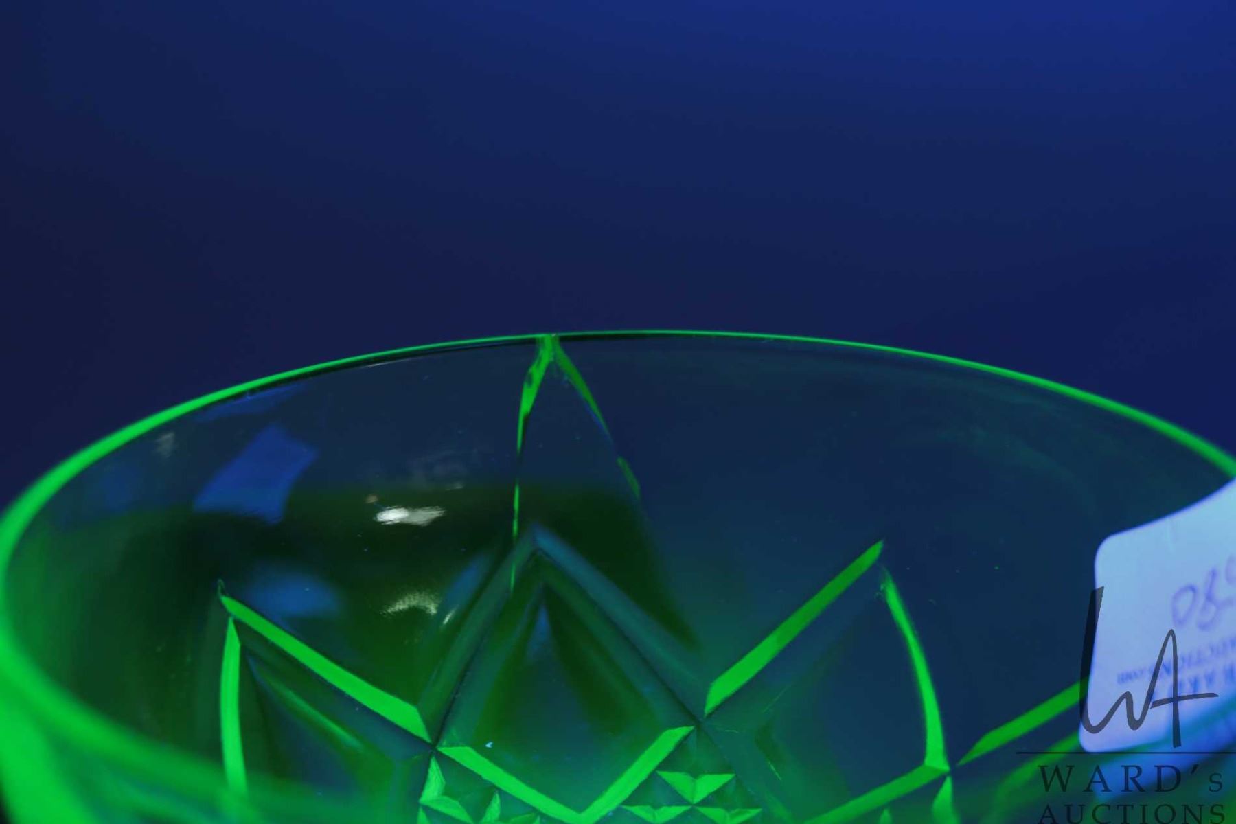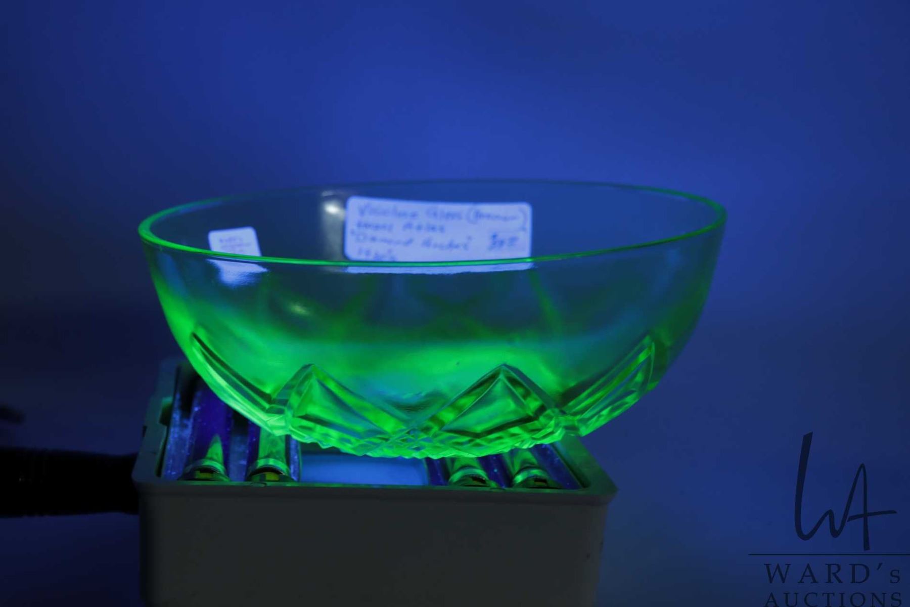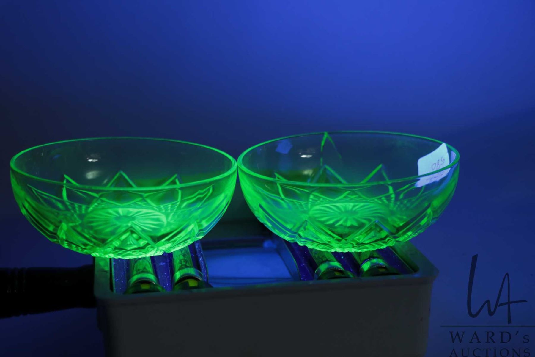 Vintage Uranium glass dessert set including serving bowl and four nappies, note: one nappy is cracked