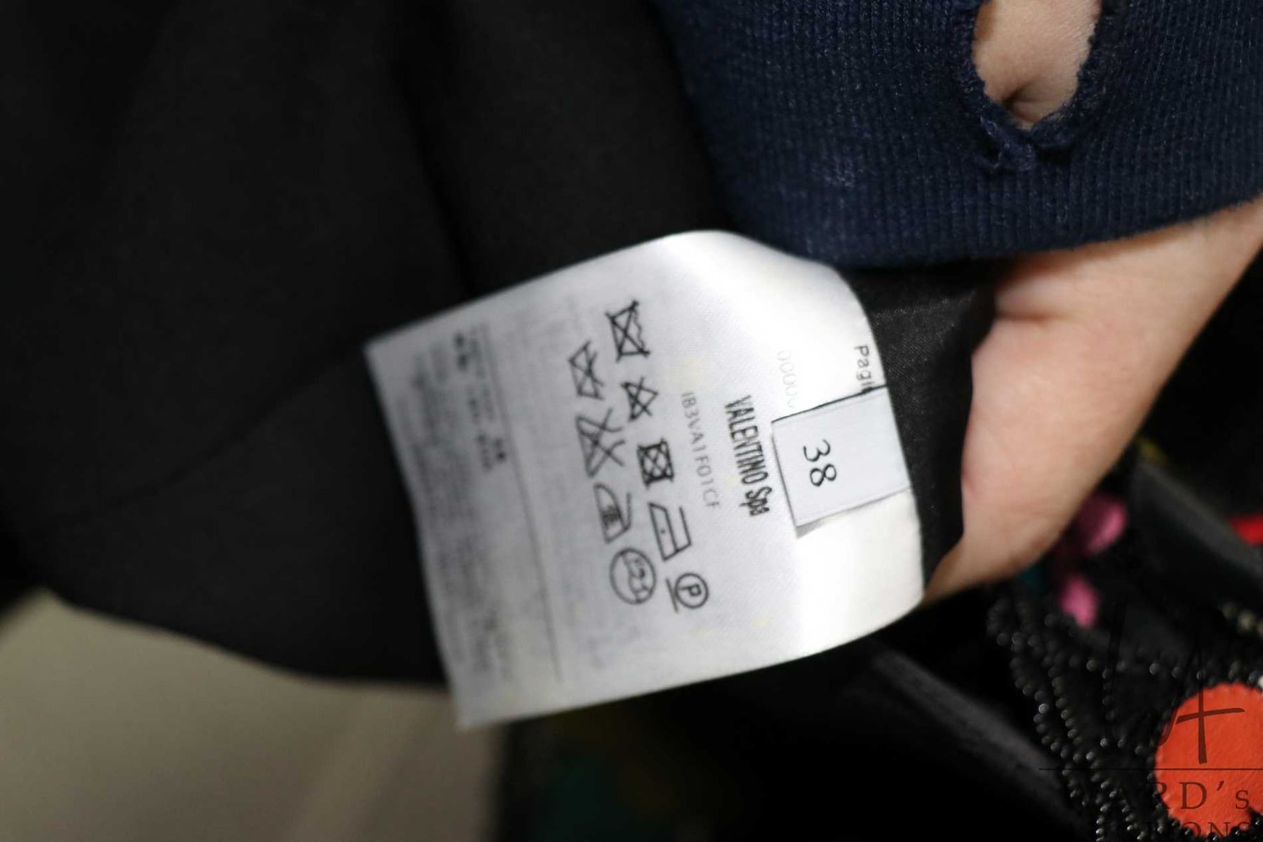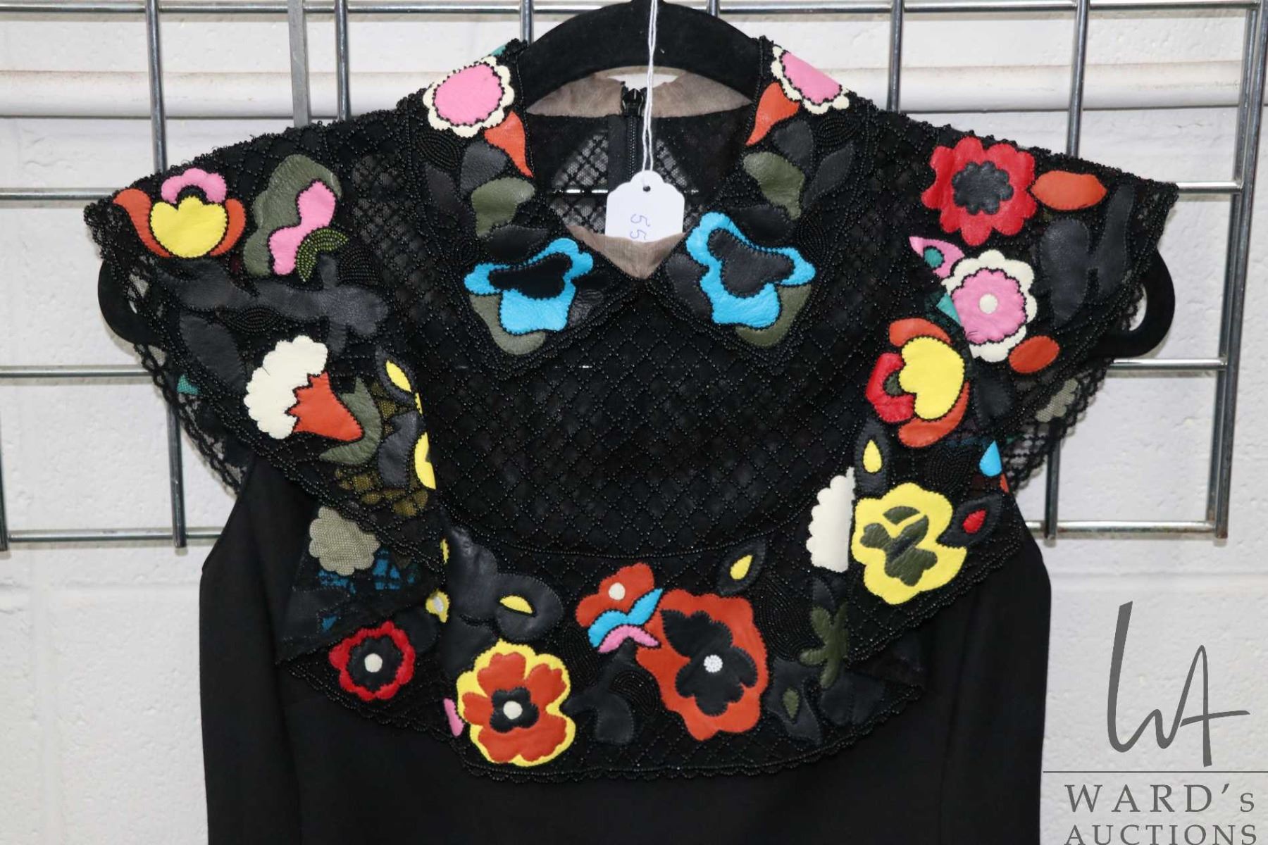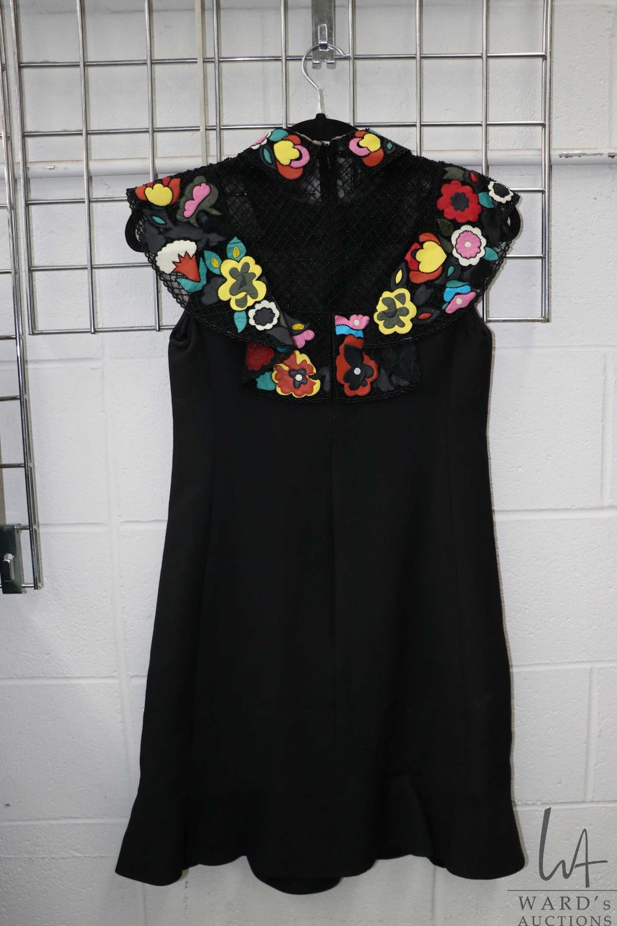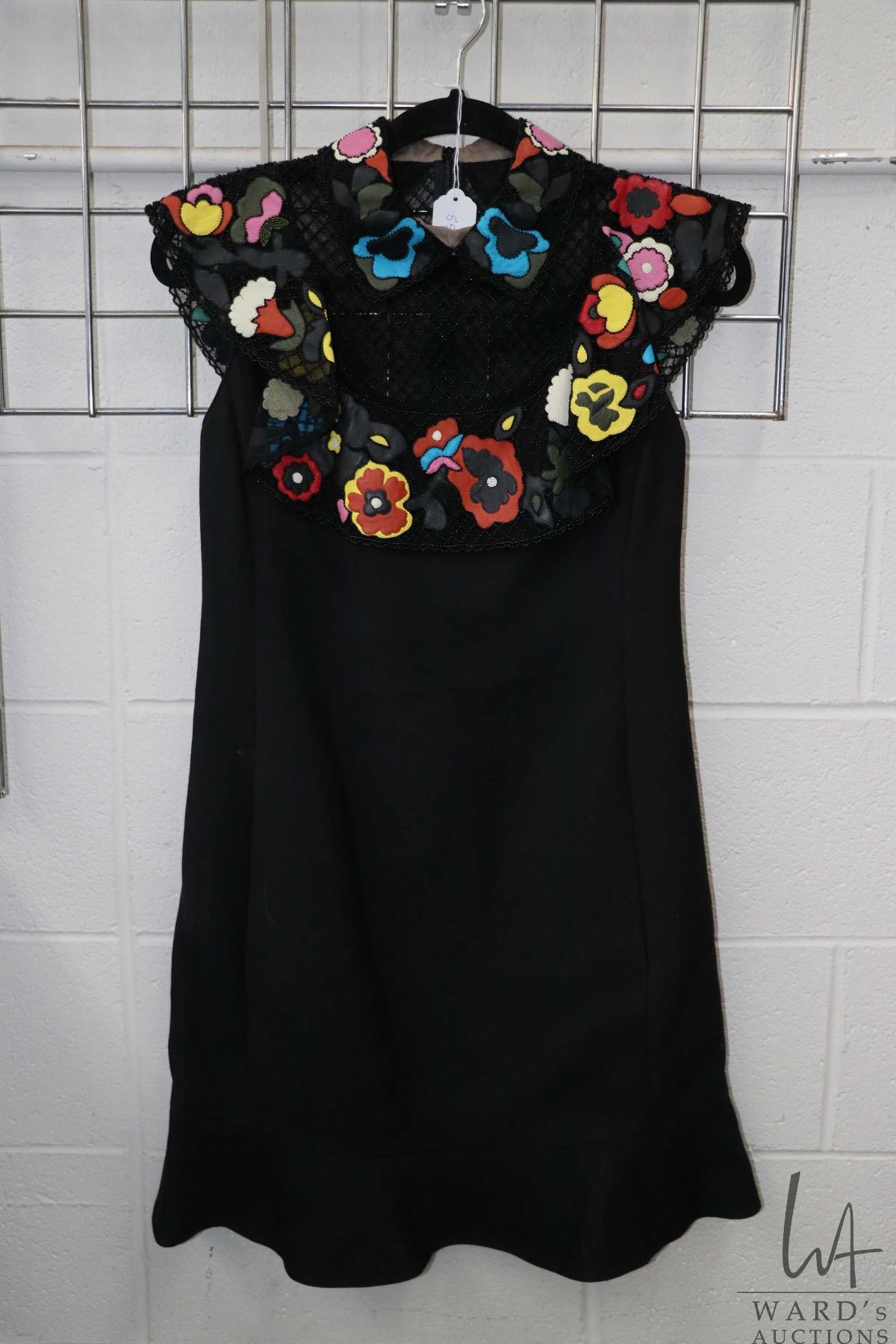 Vintage Valentino beaded floral cocktail dress with leather embellished flowers, slightly ruffled hem, side pockets, appears to be light weight black wool with black crepe lining, size small Note: buyers must satisfy themselves as to authenticity. Feel free to contact auction house regarding images that you require that may have been overlooked during original cataloguing and photography