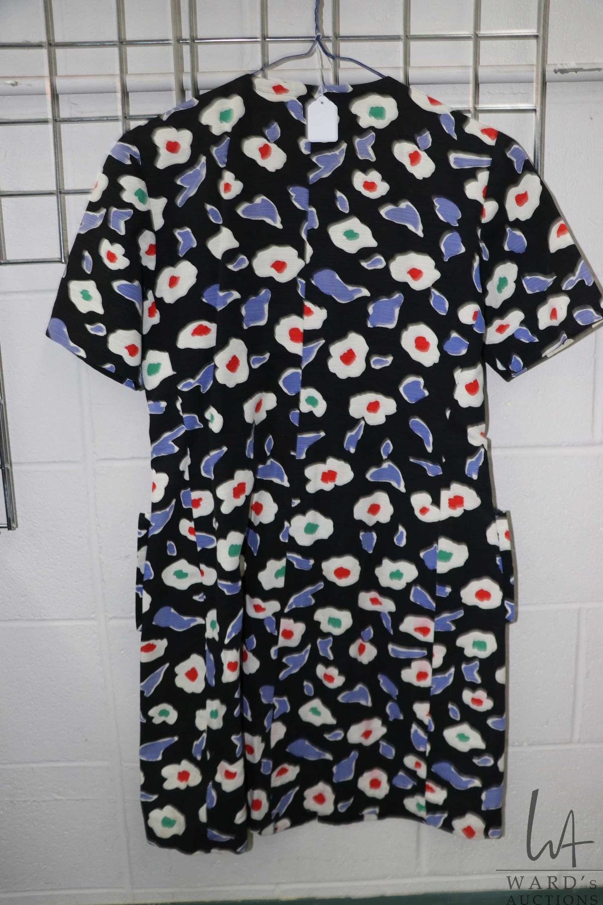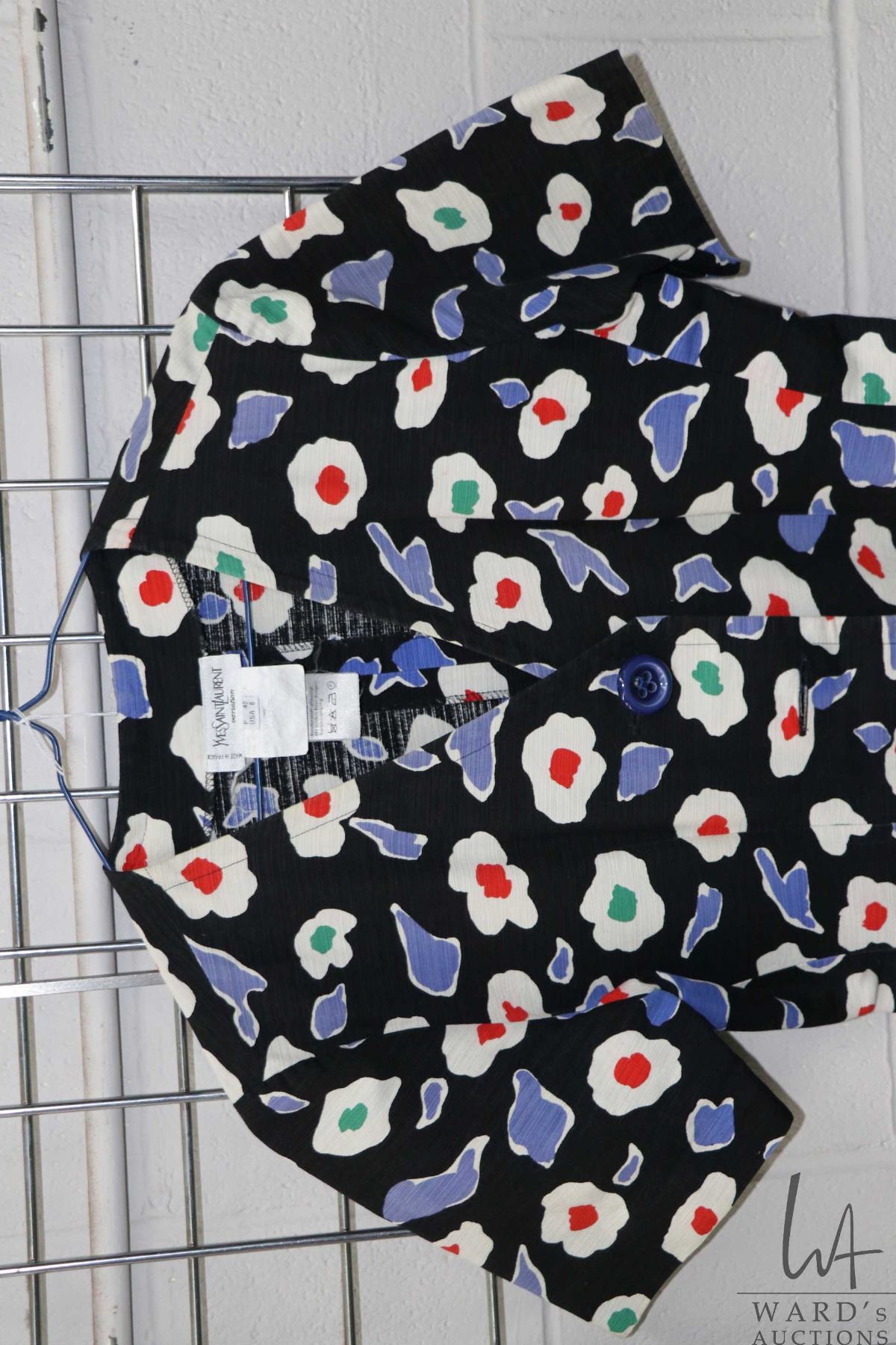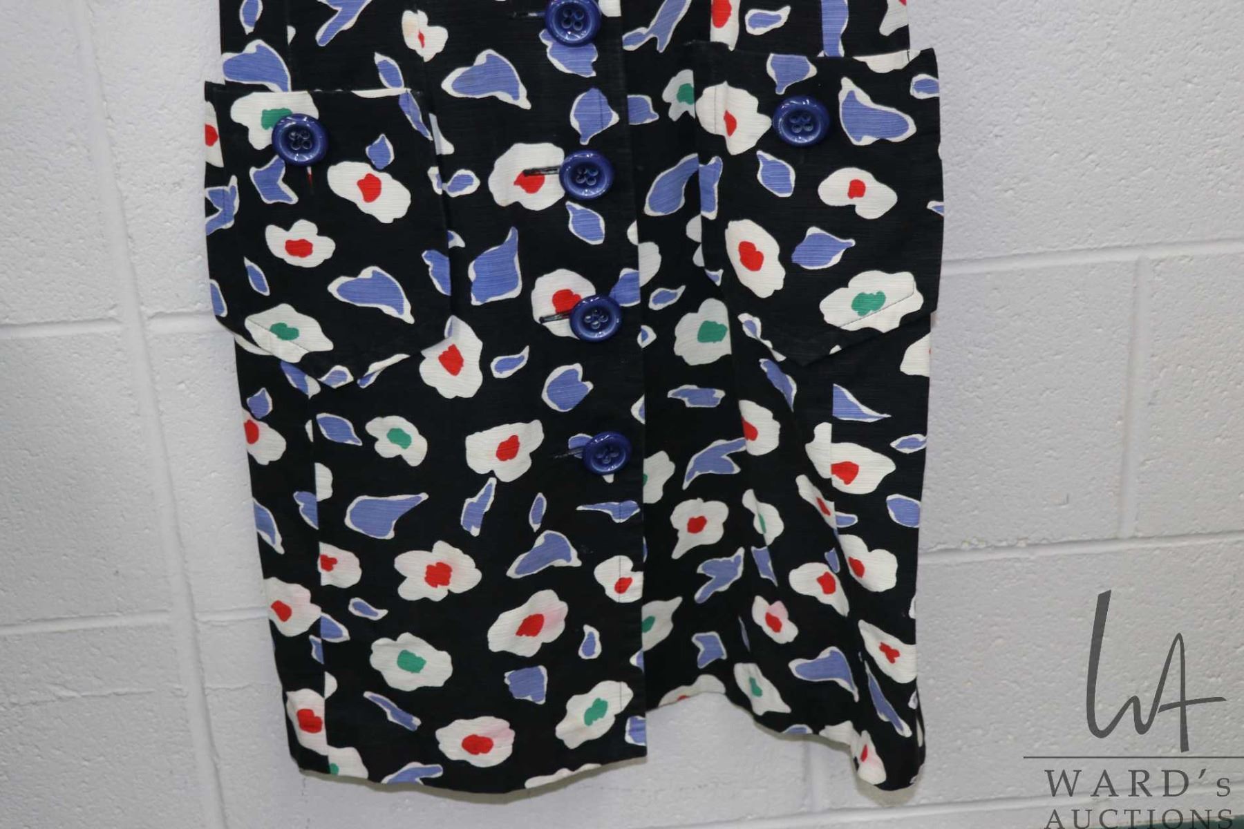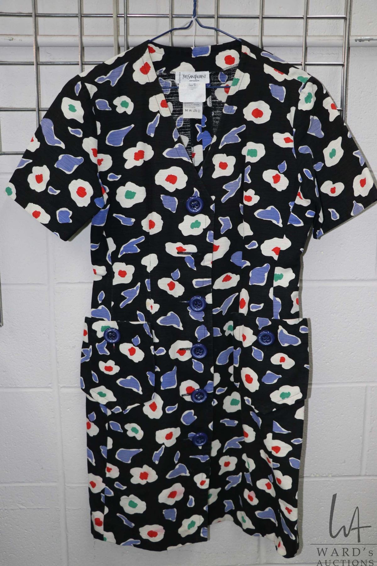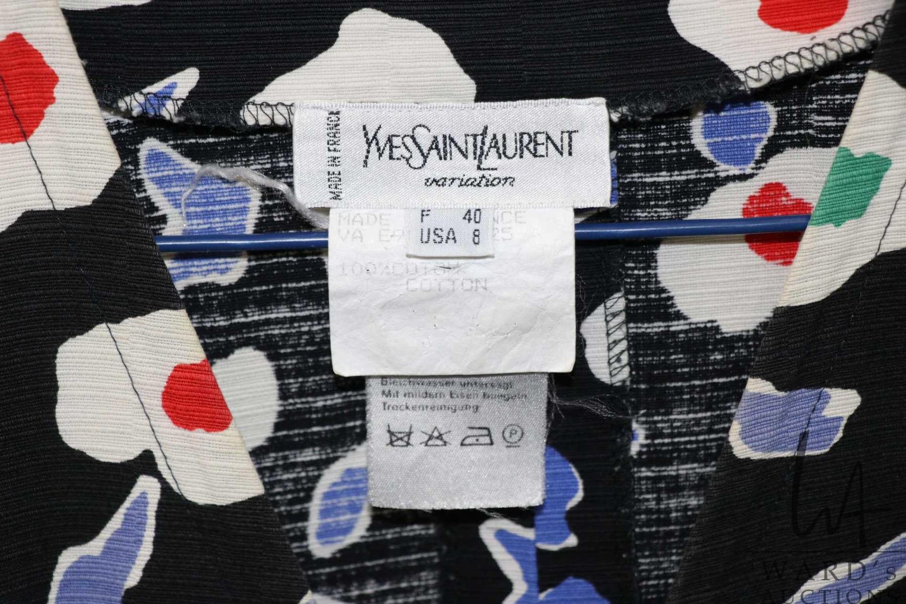 Vintage Yves Saint Laurent 100% cotton dress, French size 40, US size 8, note: some light stains and colour runs, needs cleaning Note: buyers must satisfy themselves as to authenticity. Feel free to contact auction house regarding images that you require that may have been overlooked during original cataloguing and photography