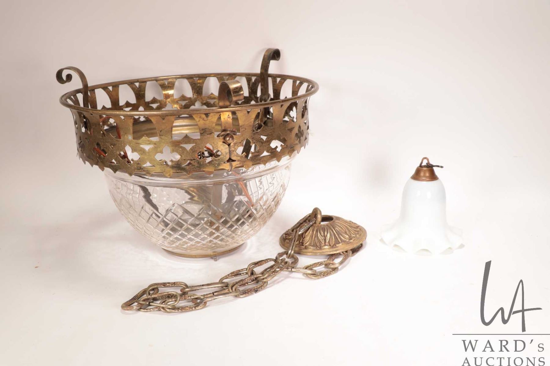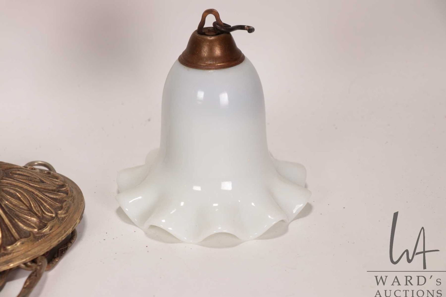 Vintage/ antique brass and molded glass ceiling fixture and a milk glass decorative bell shaped lamp part