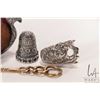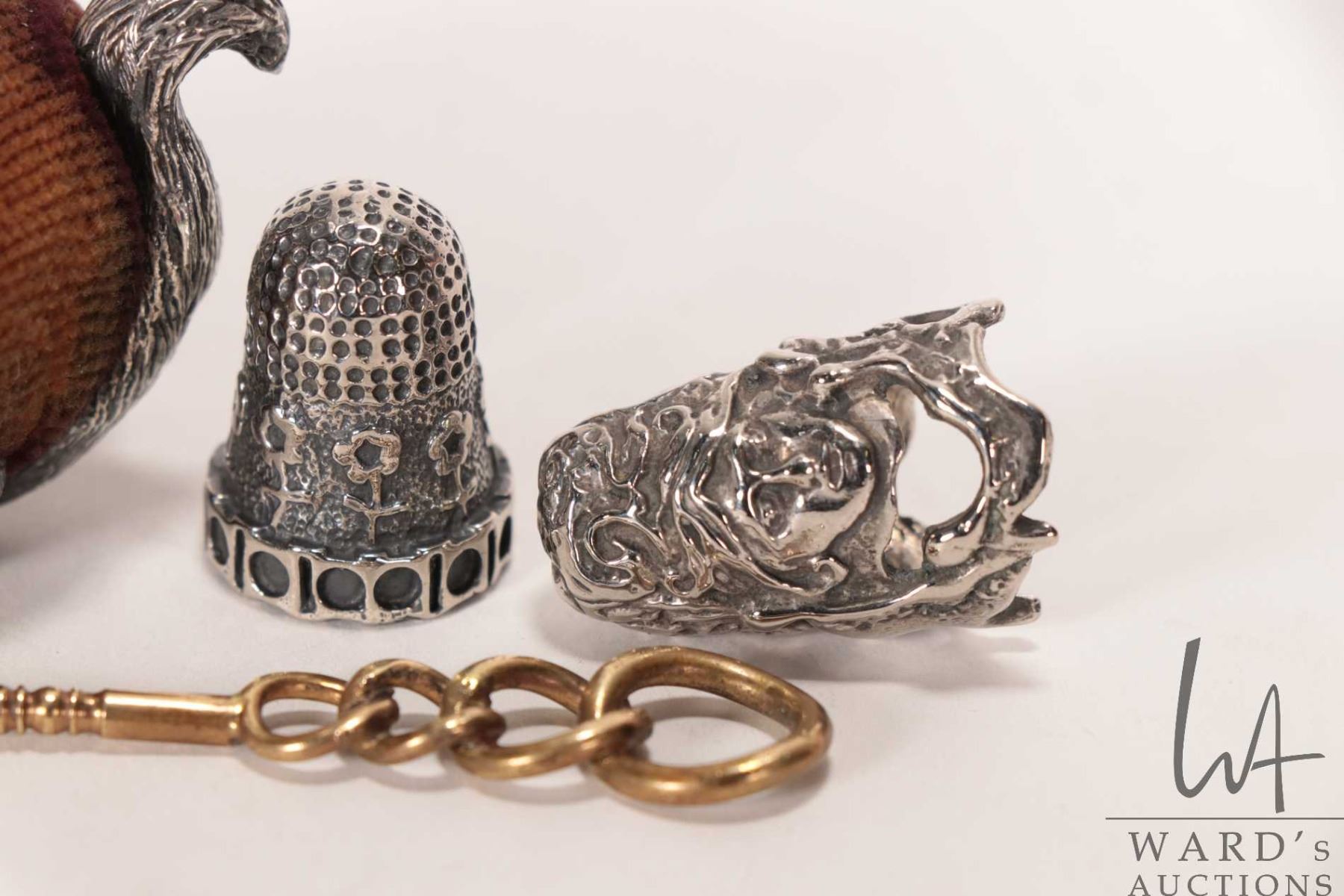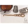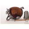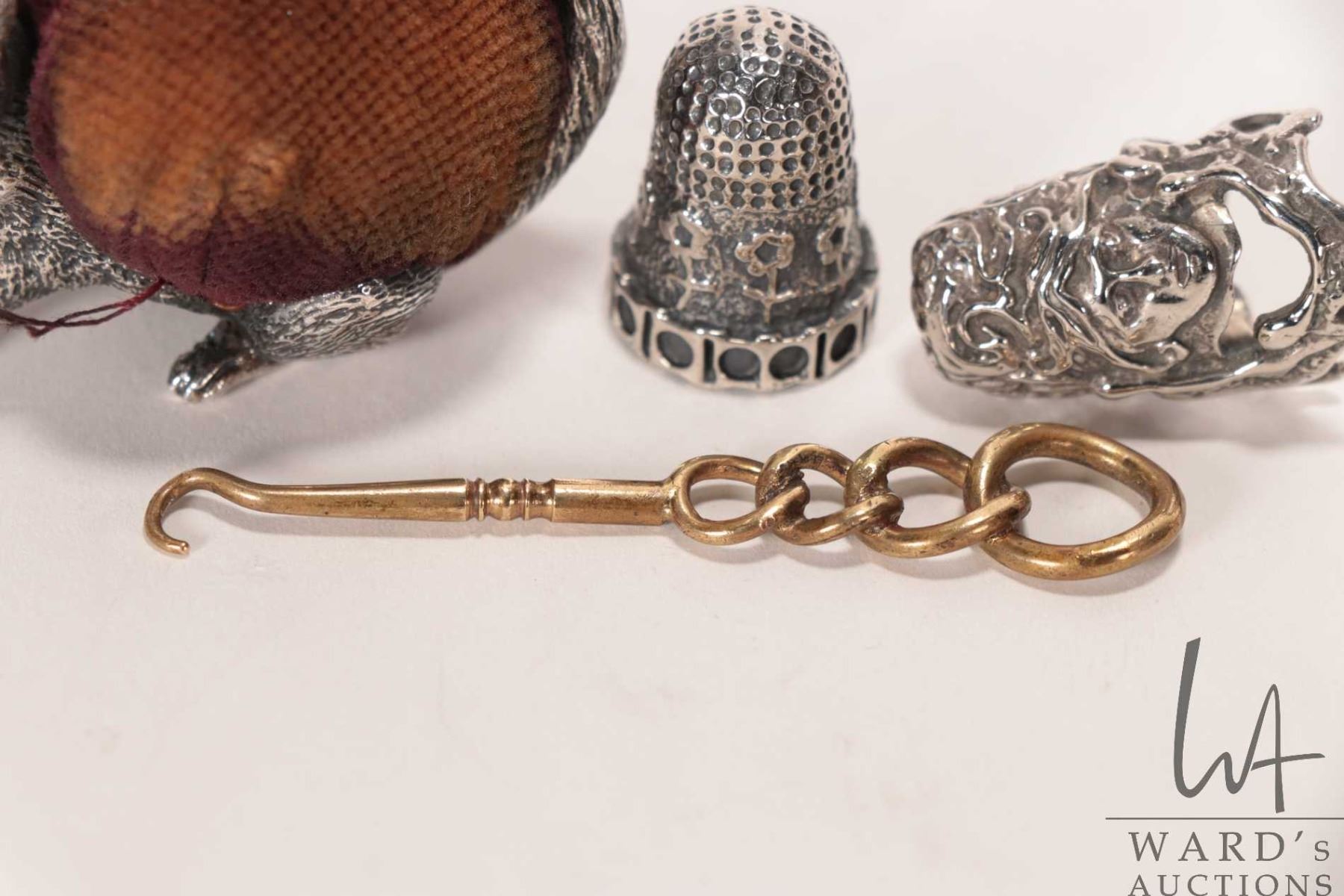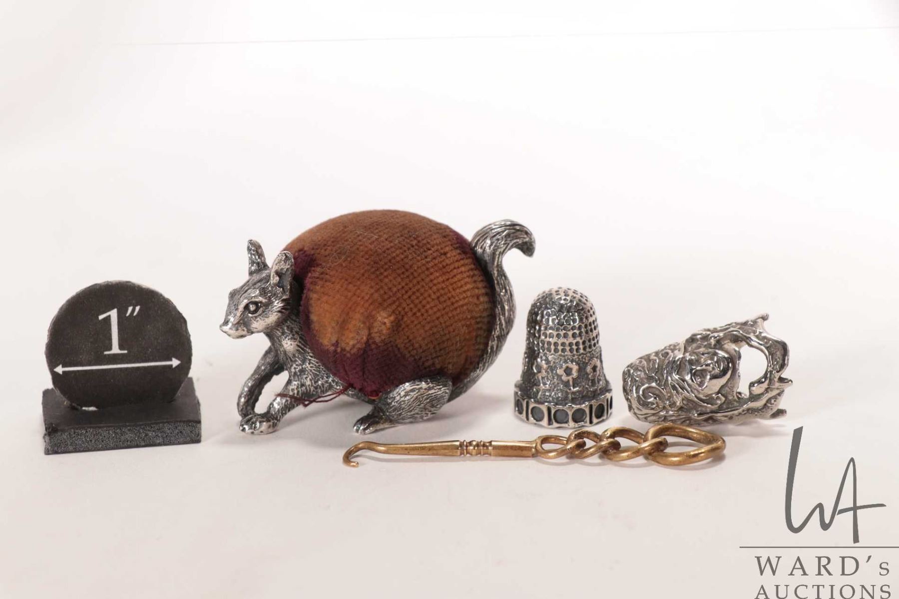 Vintage/ antique squirrel pin cushion and two thimbles marked 925 plus a brass button hook