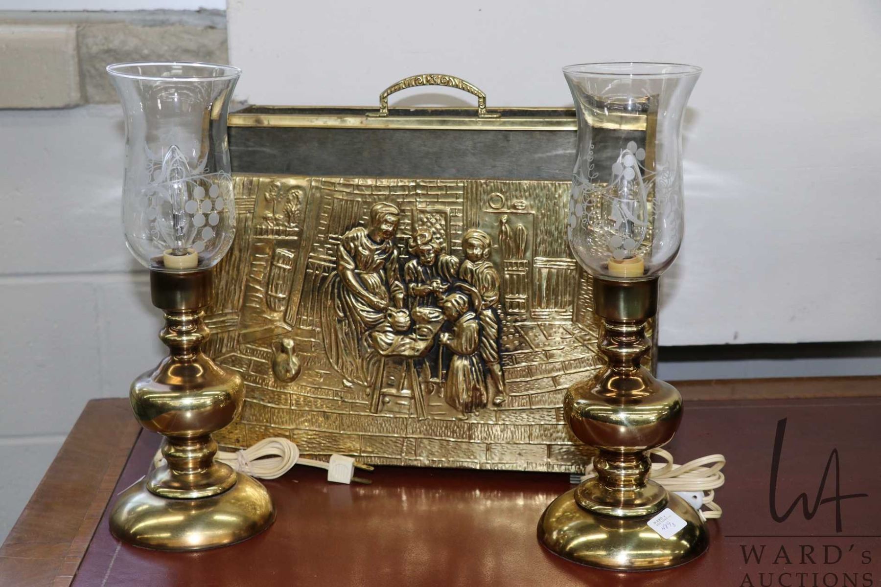 Vintage bas relief brass magazine holder and two bedside lamps with glass hurricane style shades