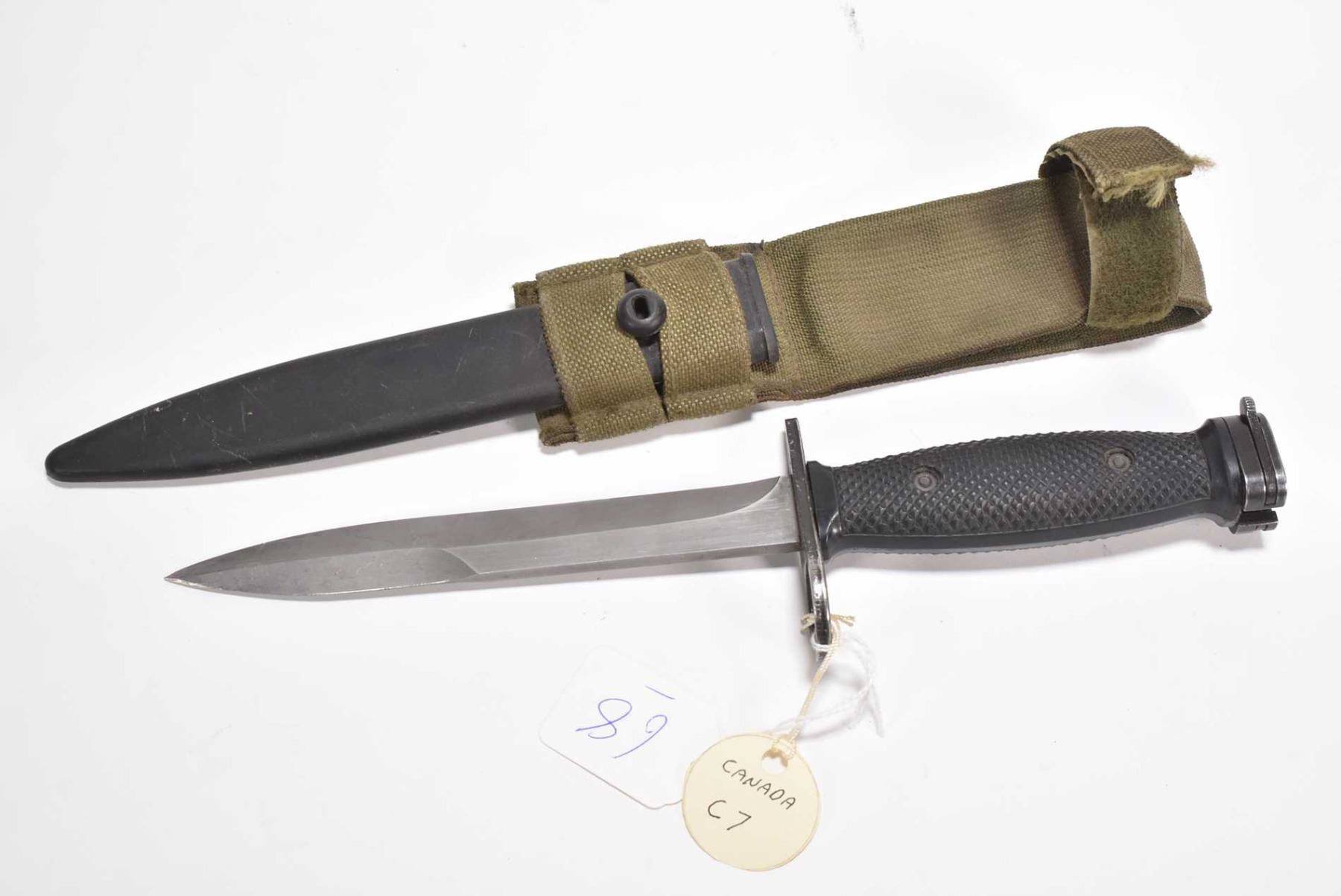 Vintage bayonet with scabbard marked by consignor " Canada C-7" stamped on hilt C-7 Mella with 6 3/4" blade