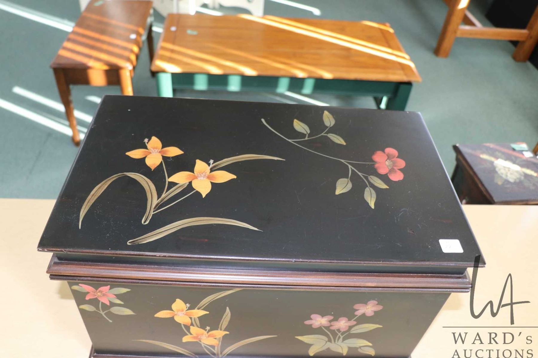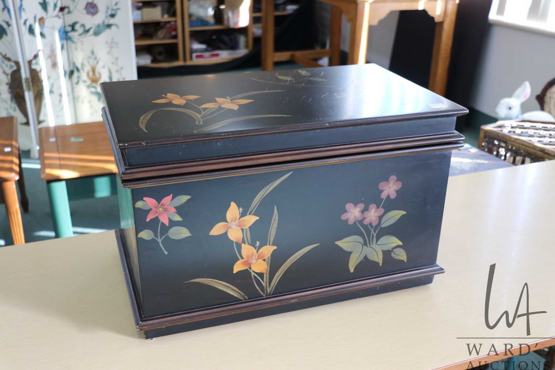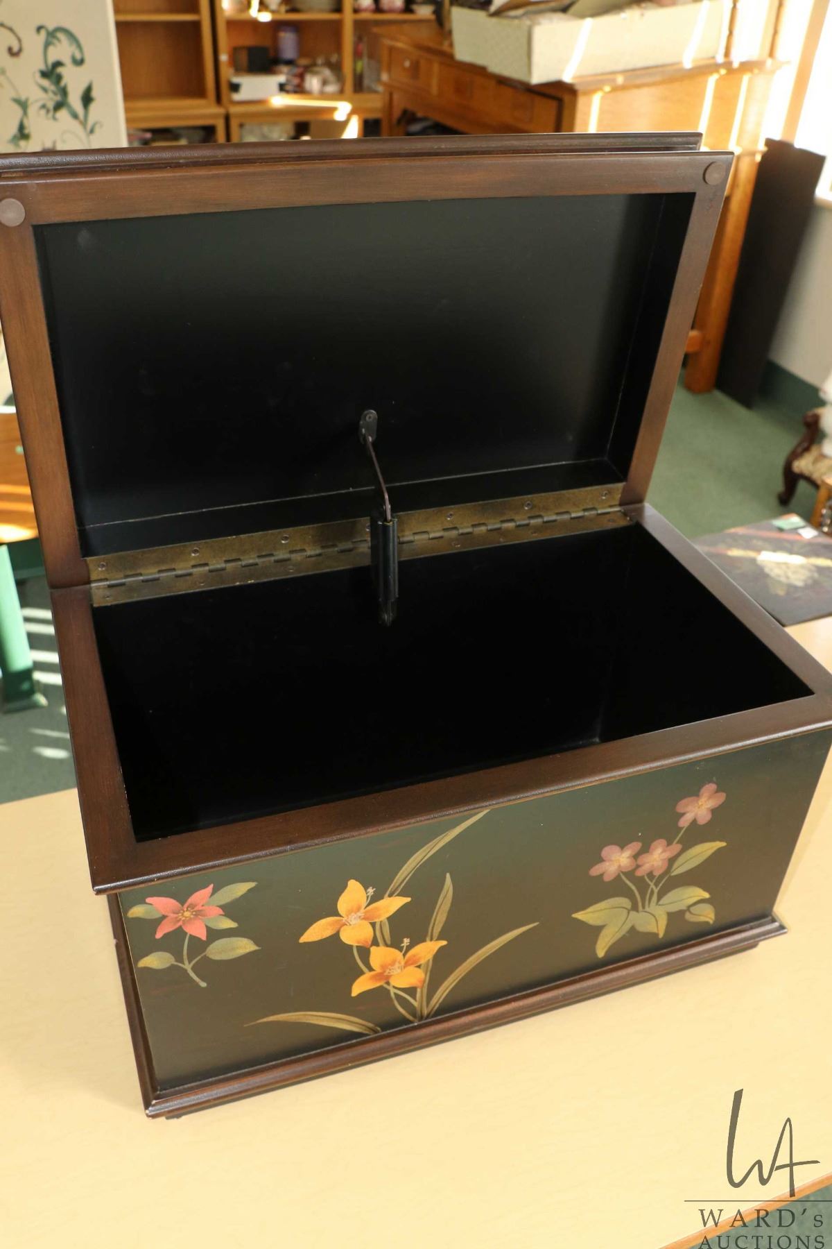 Vintage black lacquer style lidded chest with Chinoserie florals, 12 1/2" H X 20" L X 12" D