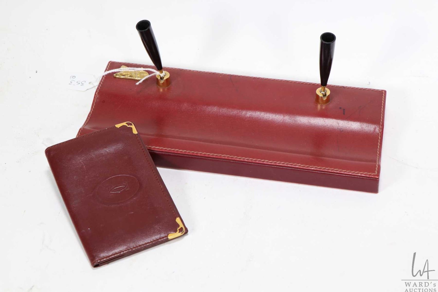 Vintage burgundy leather Cartier card holder and a Celine Paris leather desk top pen holder