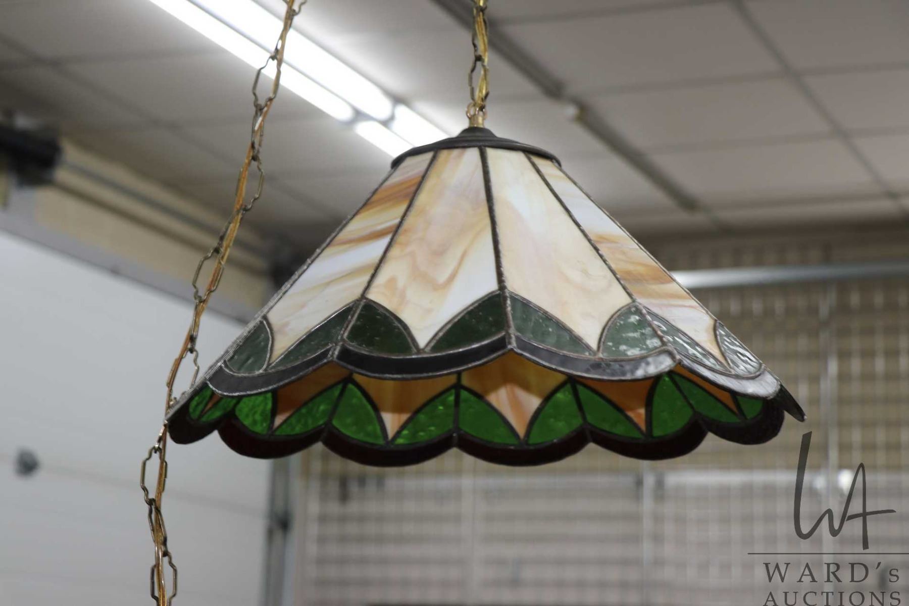 Vintage ceiling fixture with mottled brown, green and amberina stain glass, 19" in diameter. Note: Not available for shipping. Local pickup only