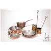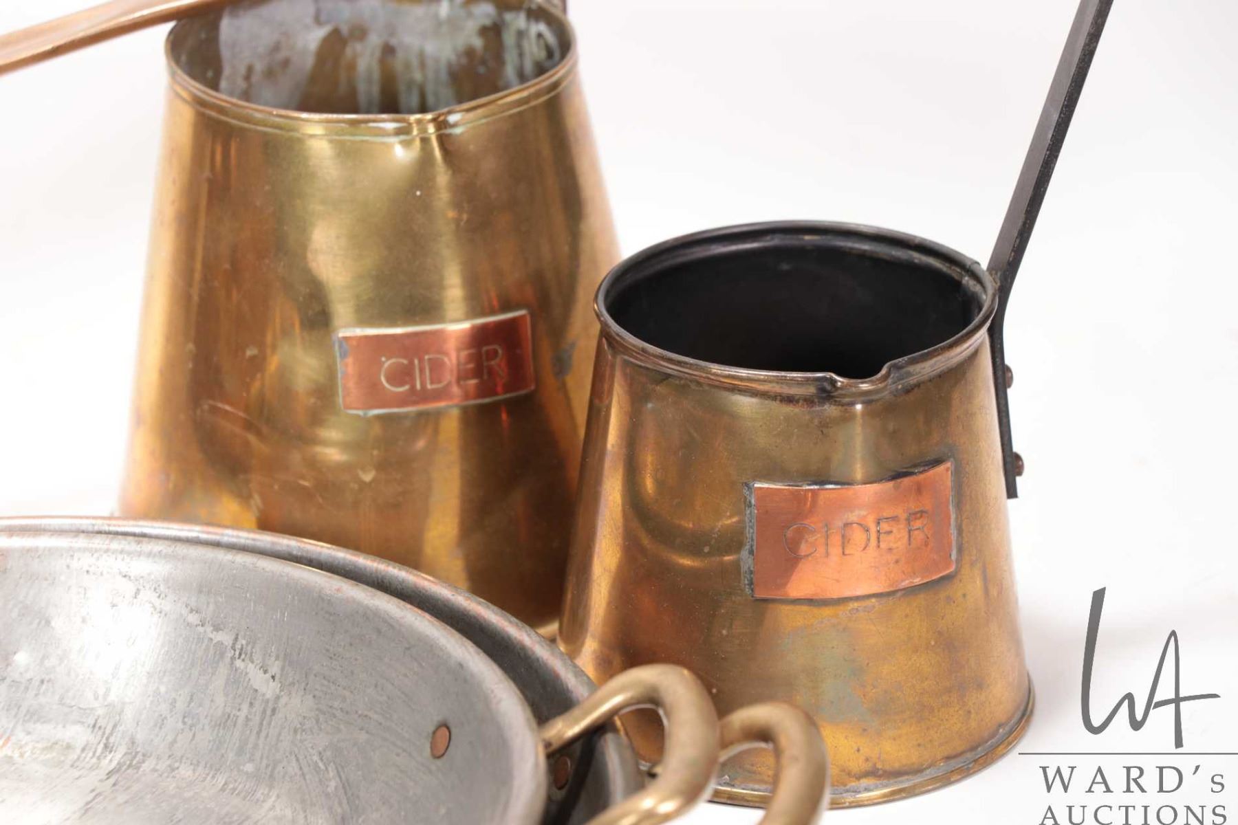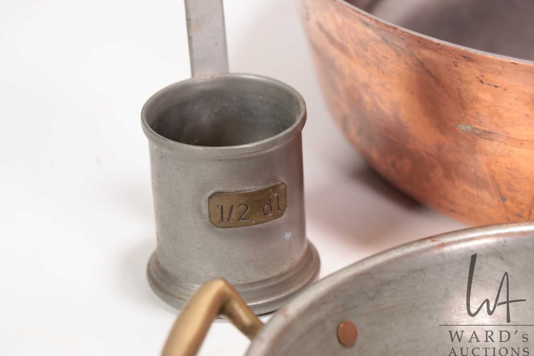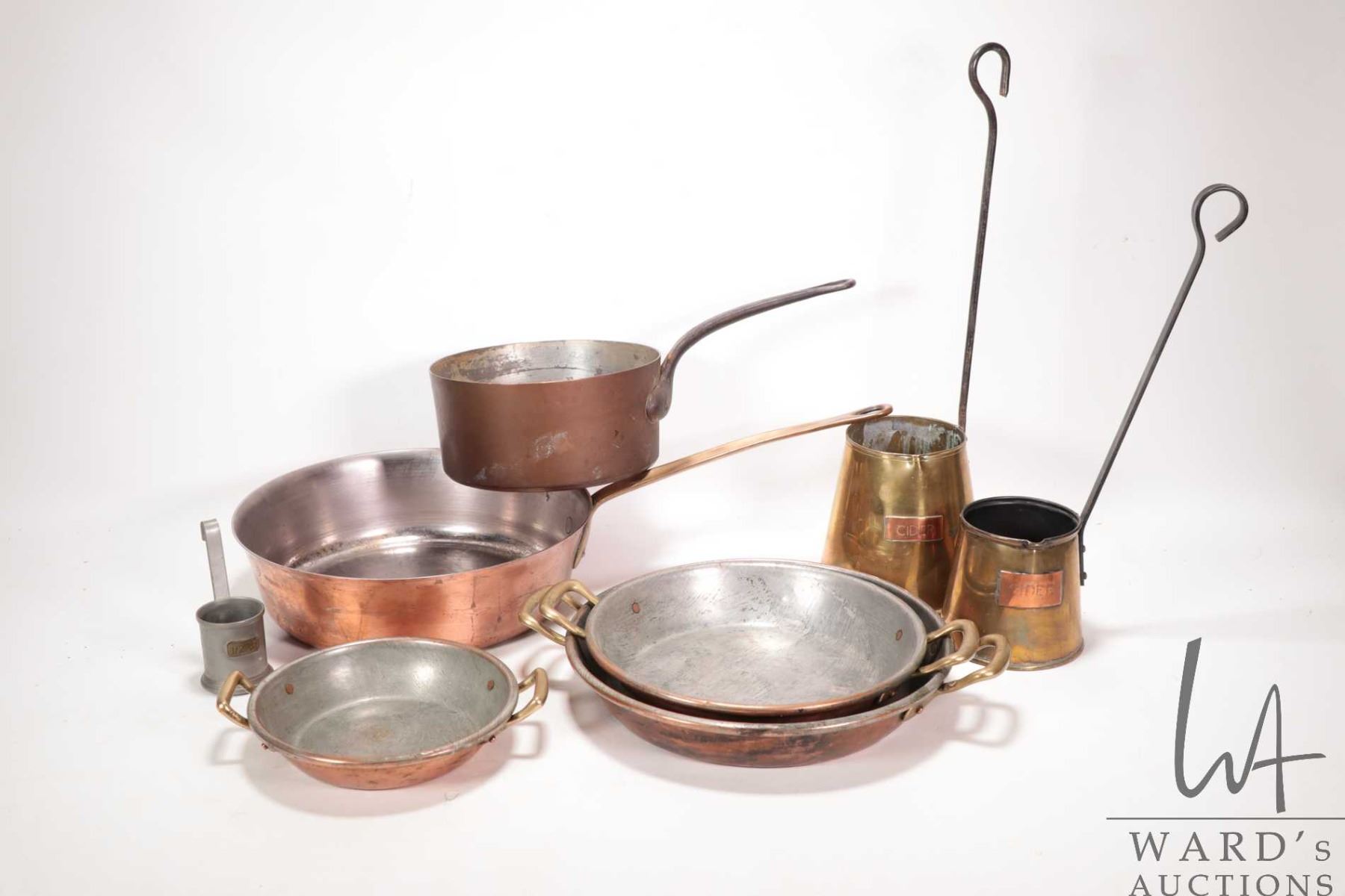 Vintage copper and tin lined 10" pan with brass handle, a 6 1/2" sauce pan with cast metal handle plus set of three graduated copper double handled pans, two brass cider dippers and a small pewter 1/2 dl. dipper