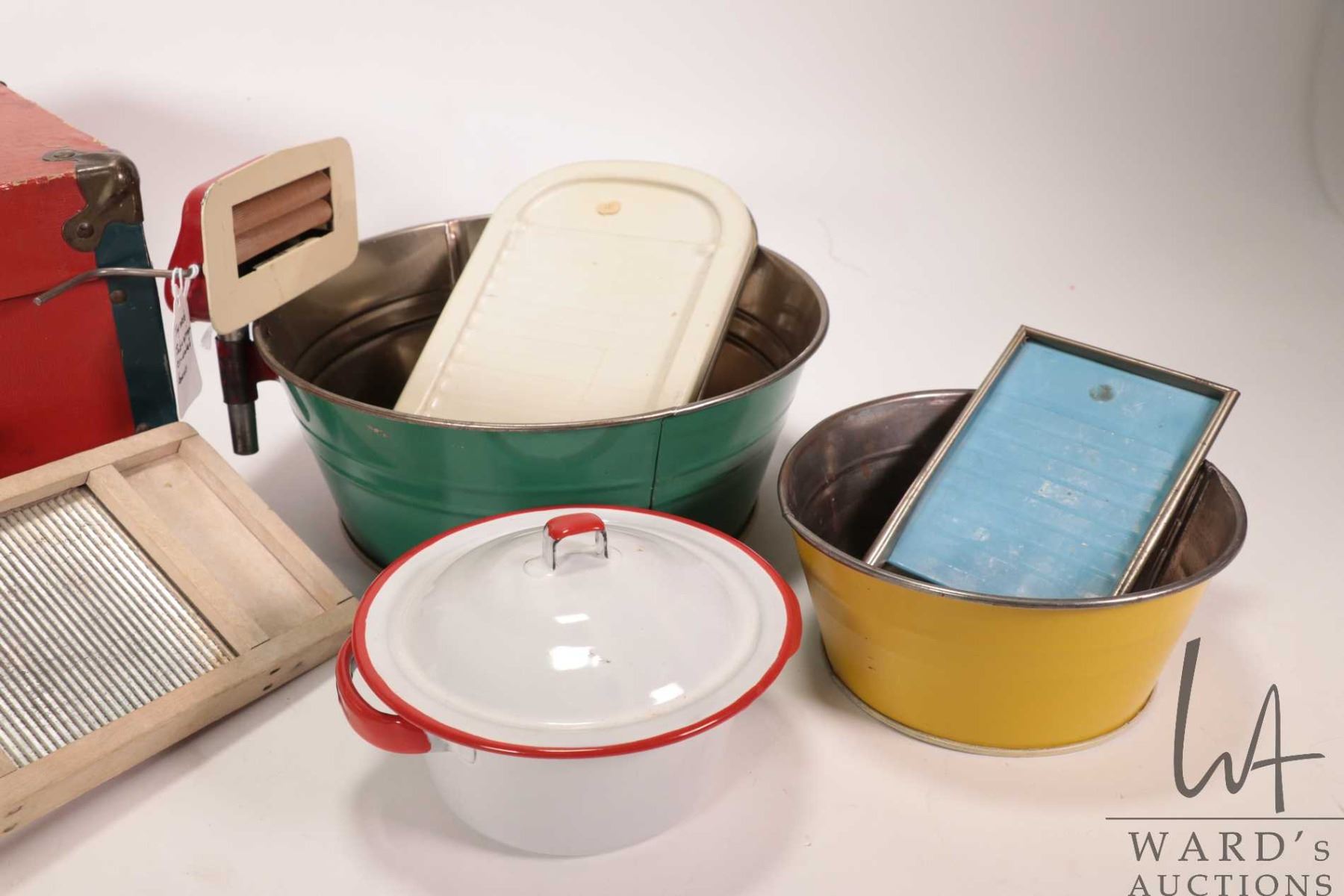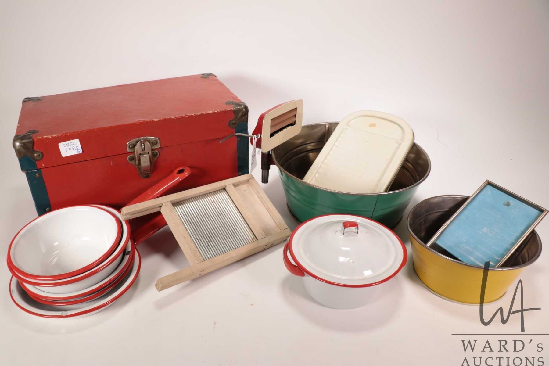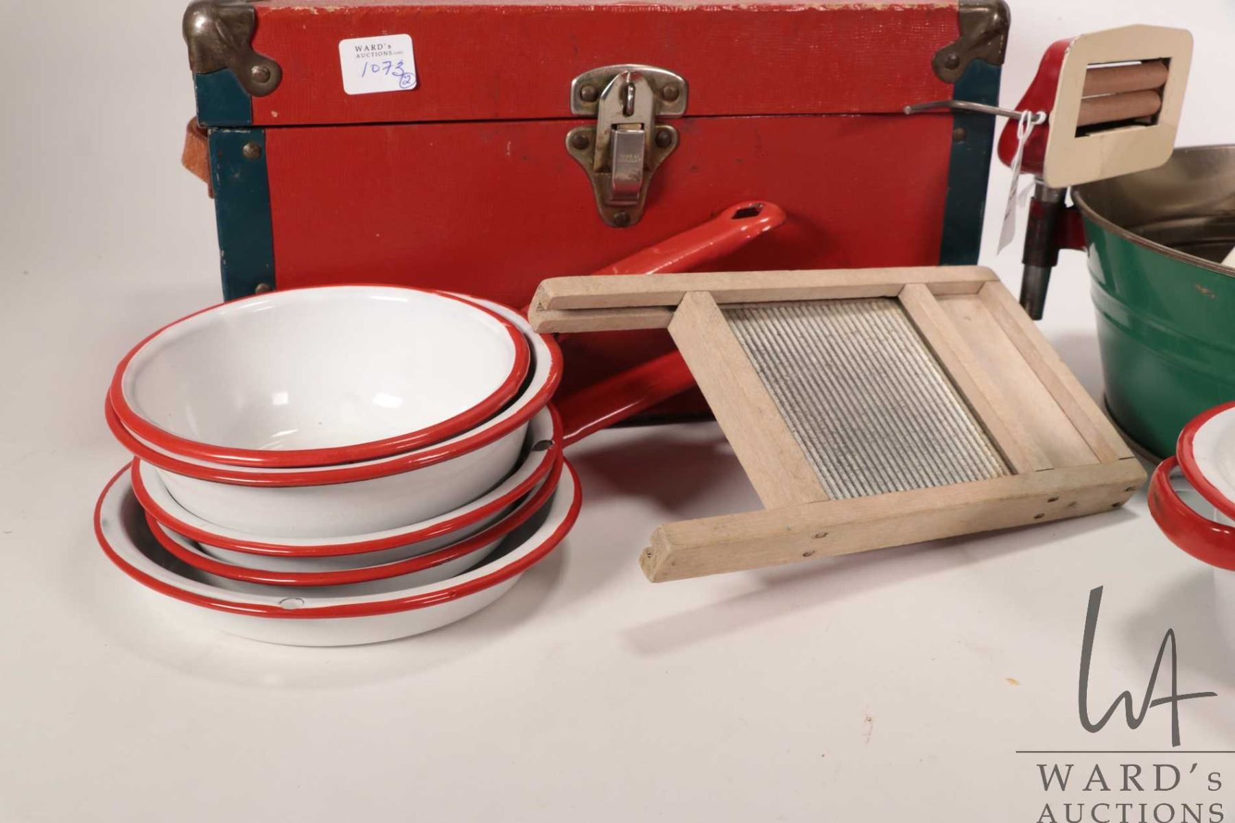 Vintage doll trunk and a toy wash tub with wringer and washboard plus child's toy enamel pots and pans