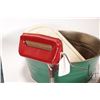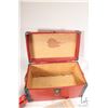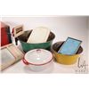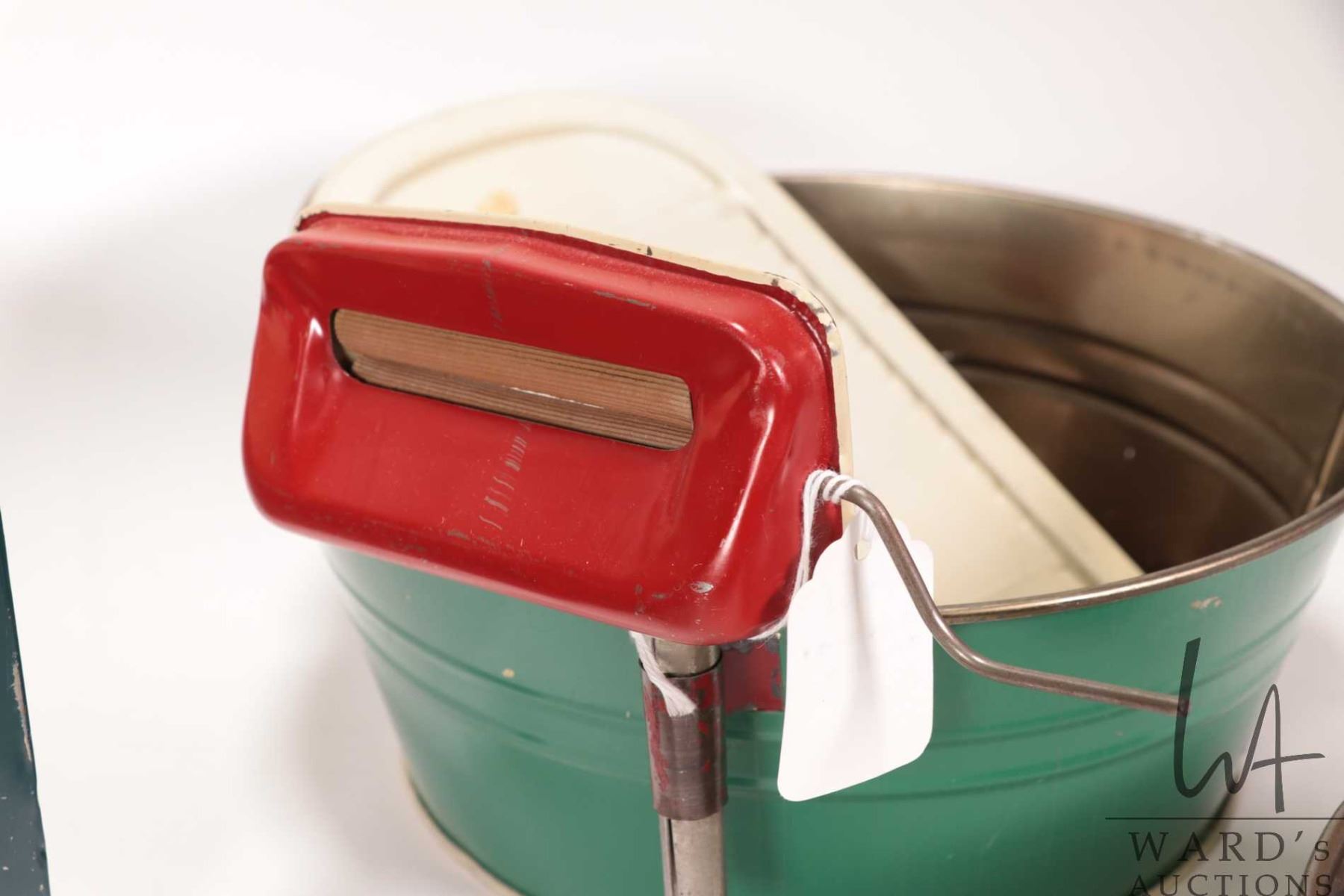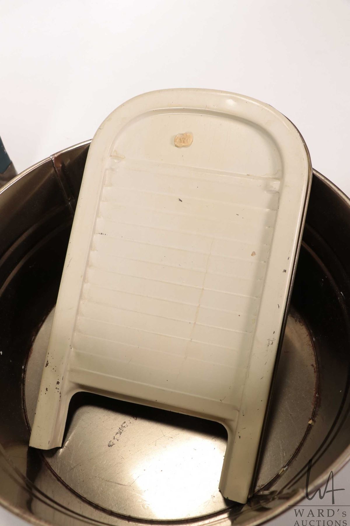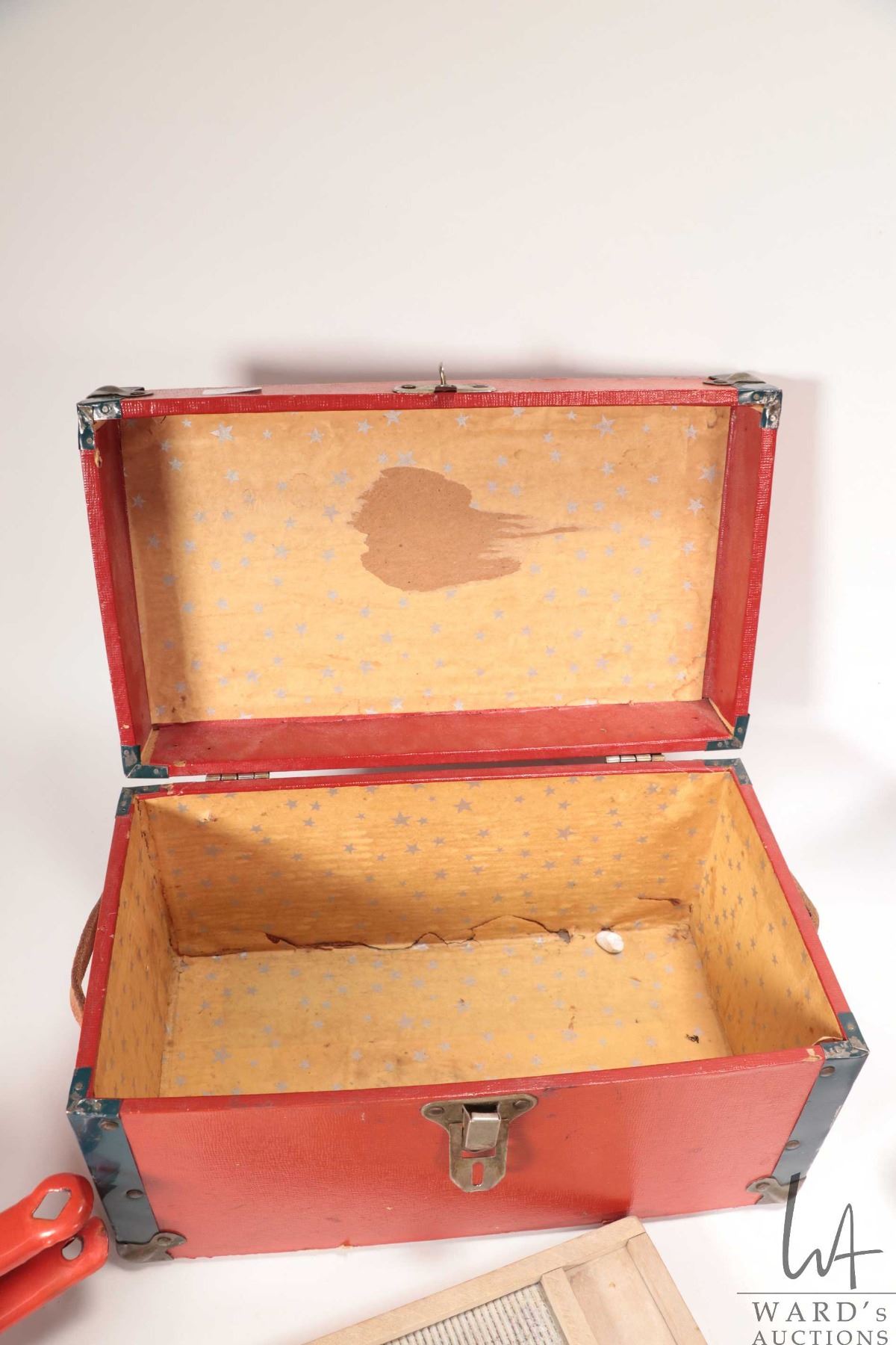 Vintage doll trunk and a toy wash tub with wringer and washboard plus child's toy enamel pots and pans