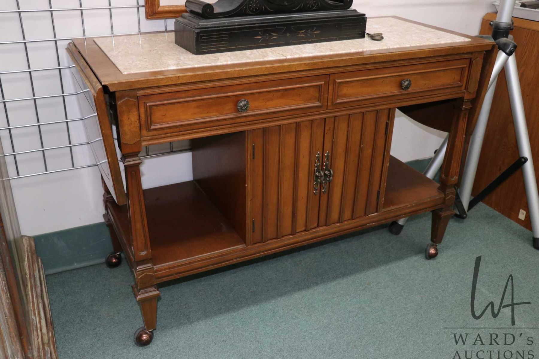 Vintage drop side server with two drawers, one fitted for flatware, heat protective insert top on ca