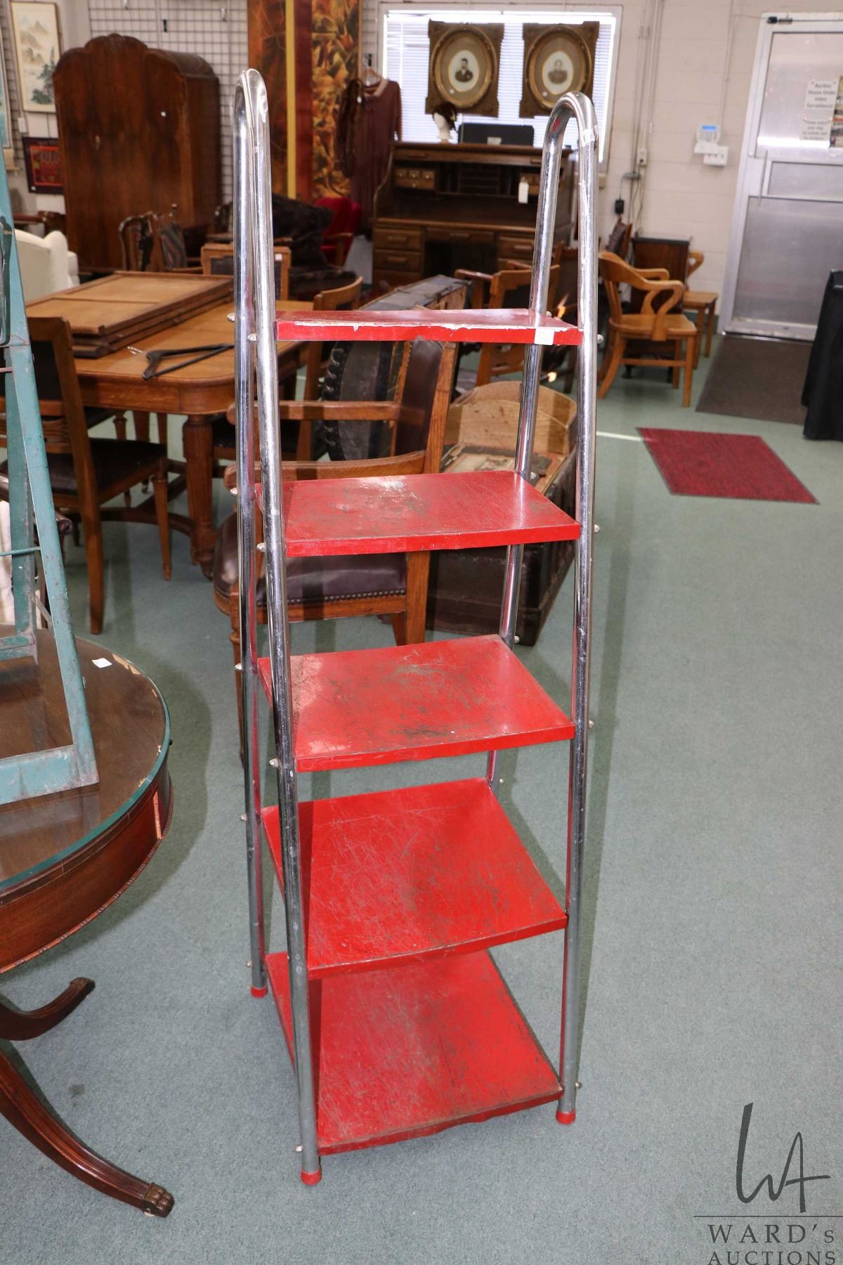Vintage five tier chrome and red enamel gas station display stand, 57" in height