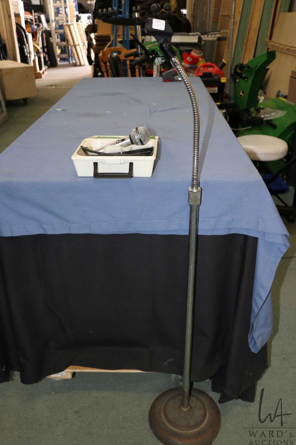 Vintage floor standing goose neck microphone stand and a Shure model PE 585 High Impedence Unisphere A microphone with cord and case, not tested