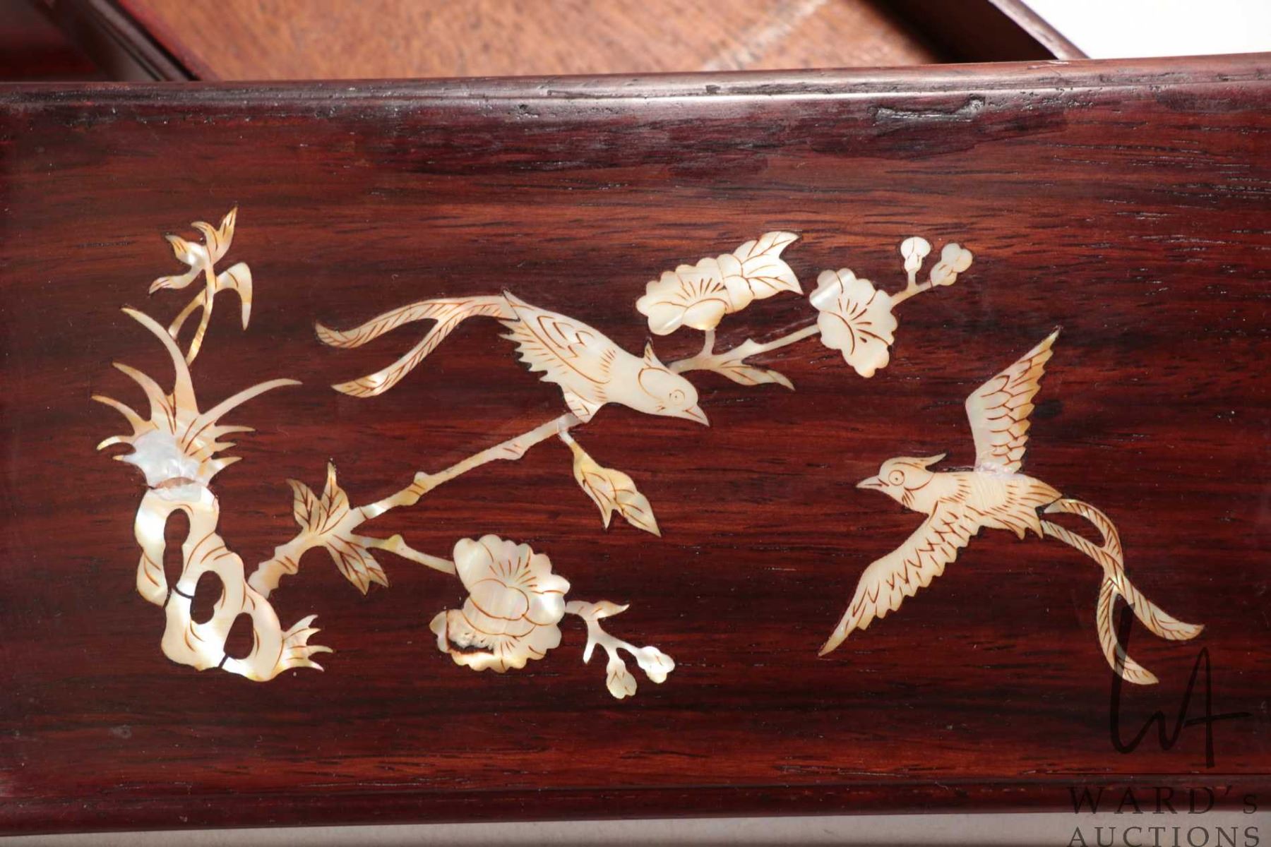 Vintage four layer rose wood storage box with mother of pearl inlay and a Cloisonne enamel and portr