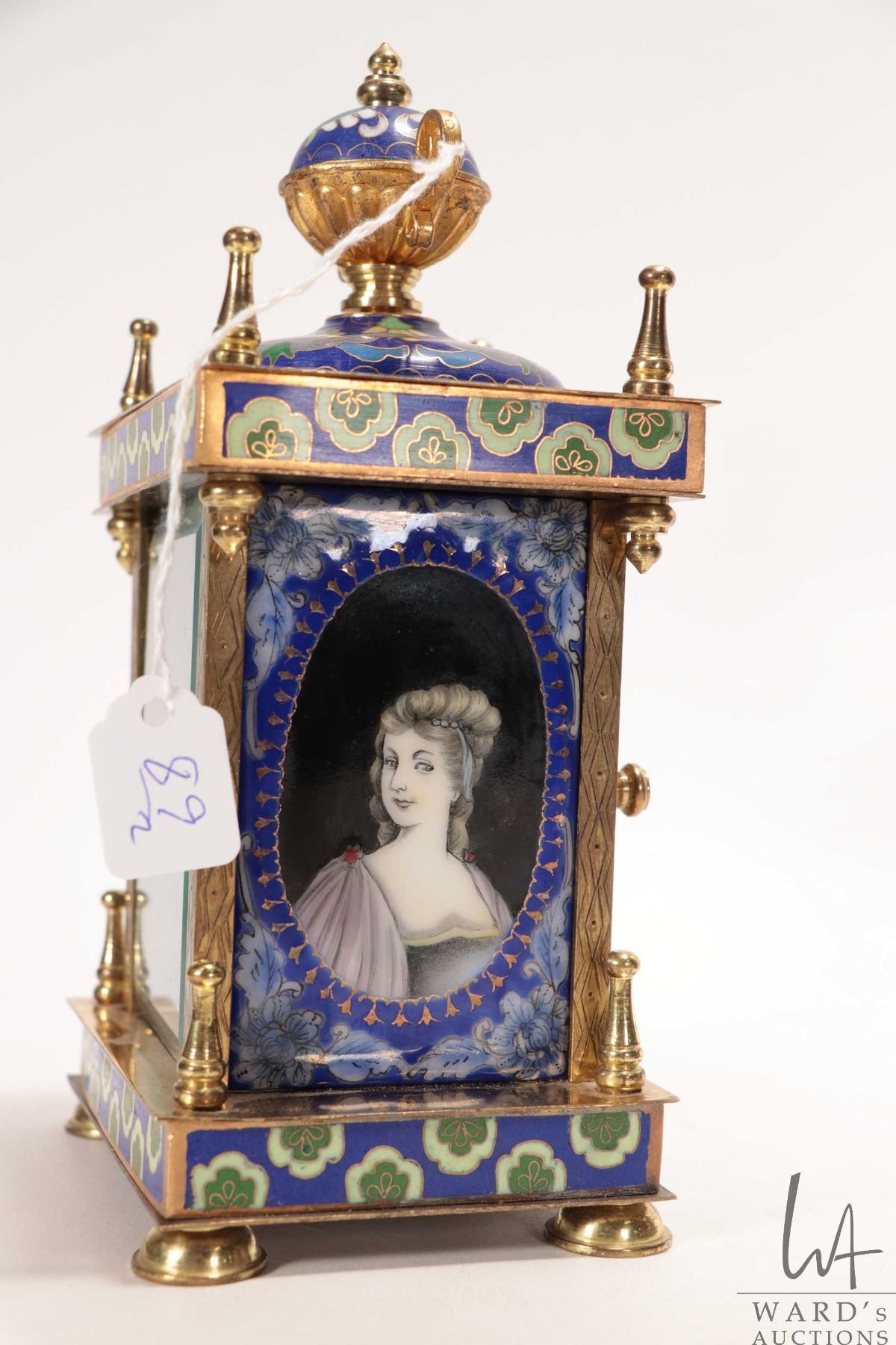 Vintage four layer rose wood storage box with mother of pearl inlay and a Cloisonne enamel and portrait mantle quartz clock, not working at time of cataloguing