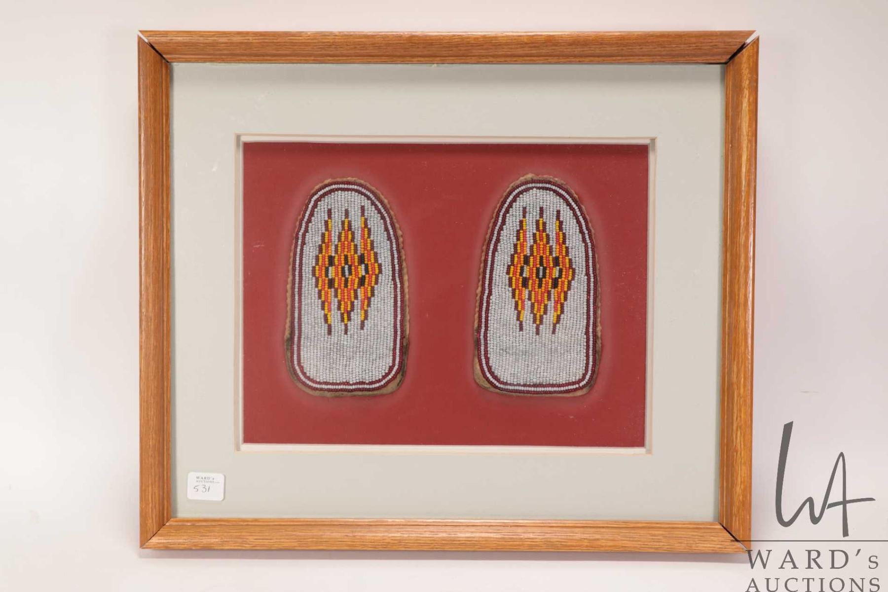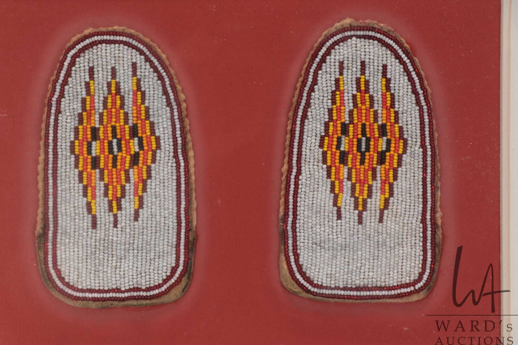 Vintage framed Indigenous beadwork moccasin covers, overall dimensions including frame 14" X 16 1/2"