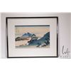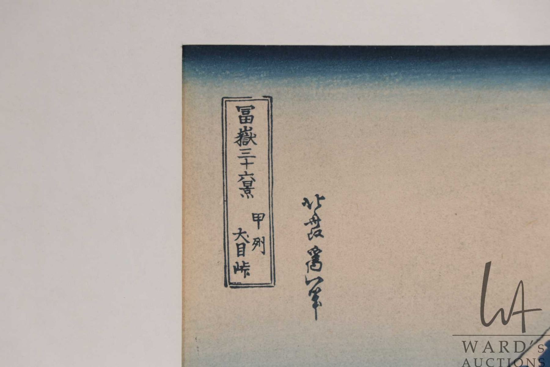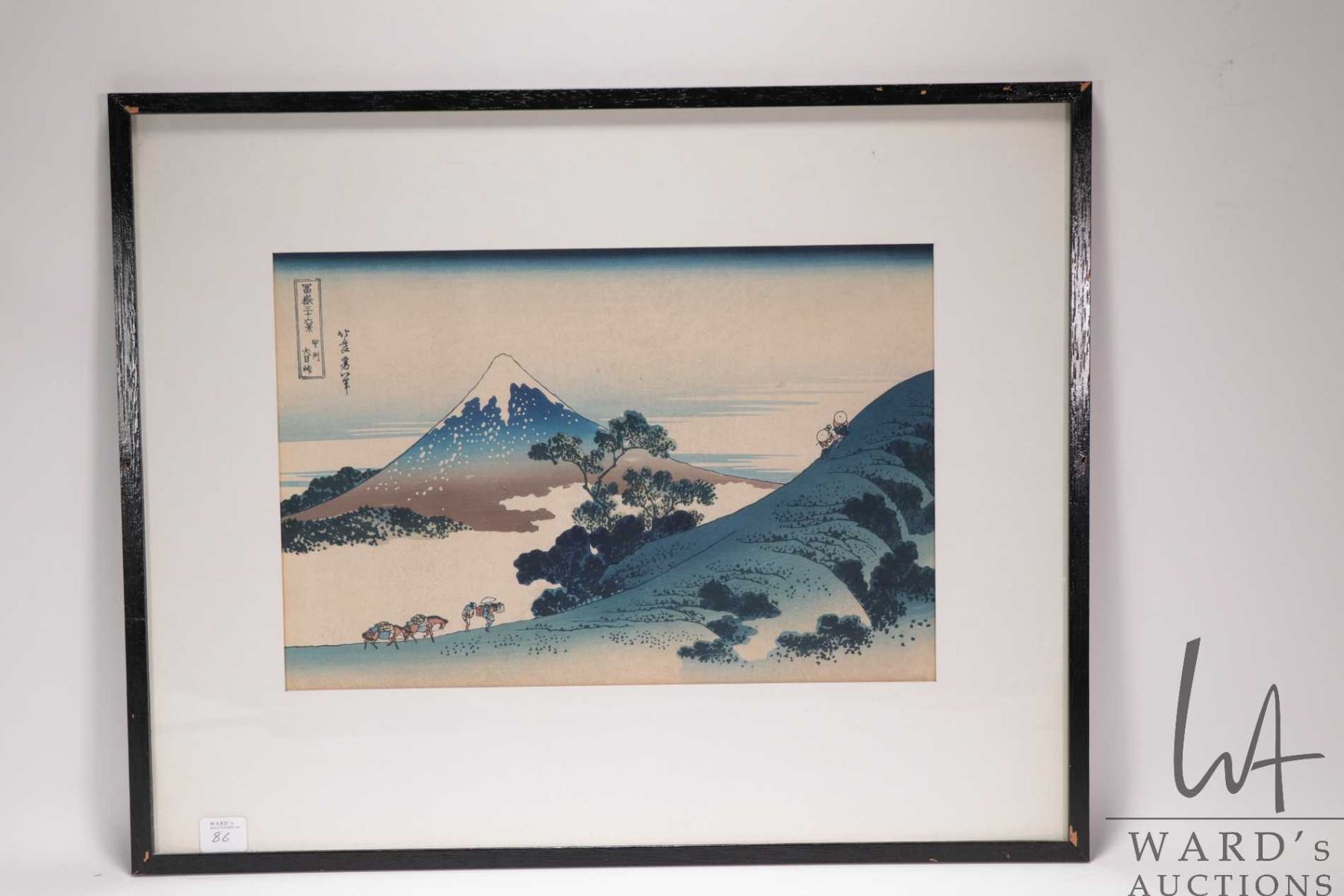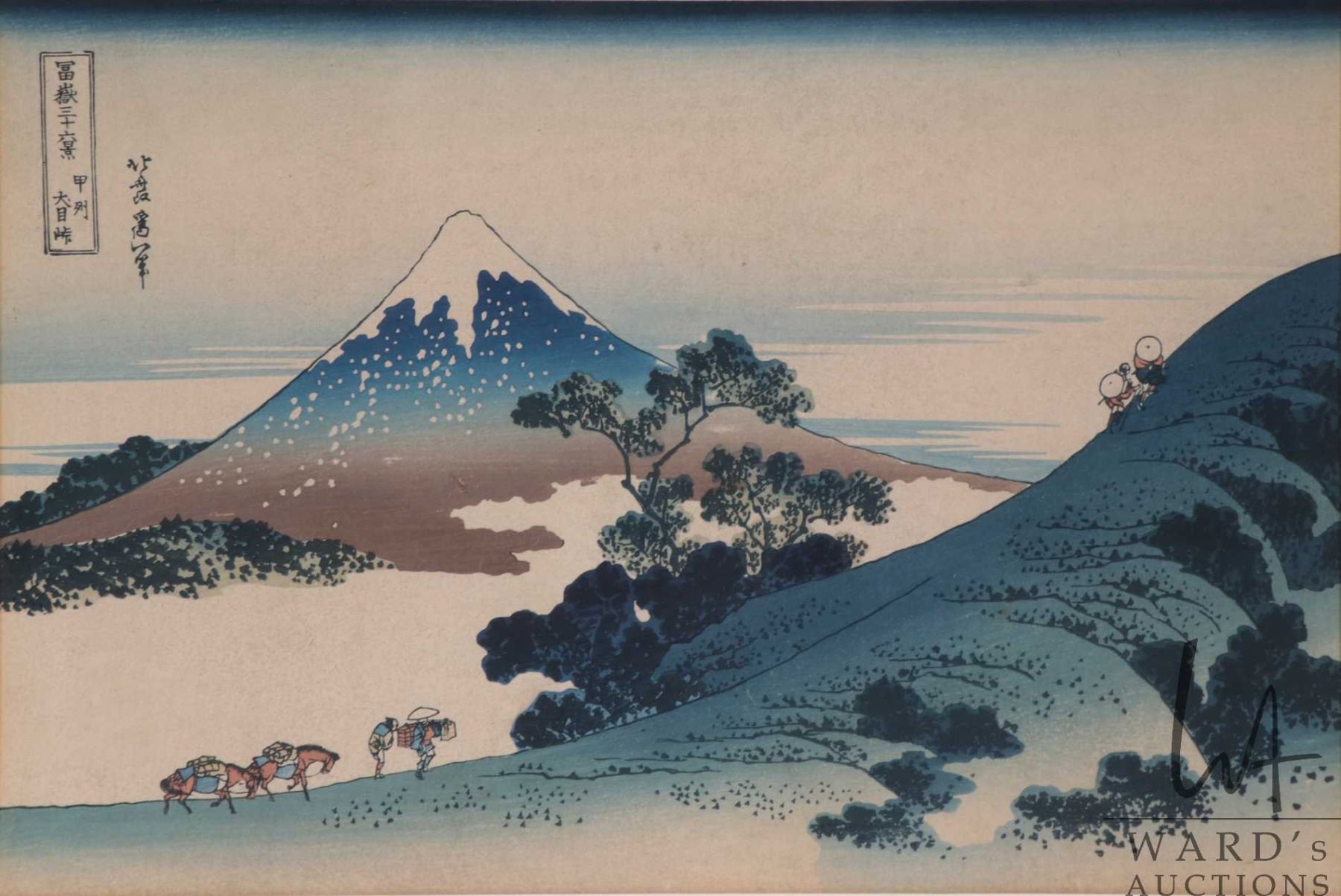 Vintage framed Japanese wood block print "Inume Pass in Kai Province" no. 7 in the series of prints from the portfolio "Thirty-six Views of Mount Fuji", a series of landscape wood blocks by Japanese artist Hokusai (1760-1849) which were originally printed in 1830-1832. This is believed to be a mid century reprint. Note: Artwork cannot be insured and is often too large to ship. Local pickup.