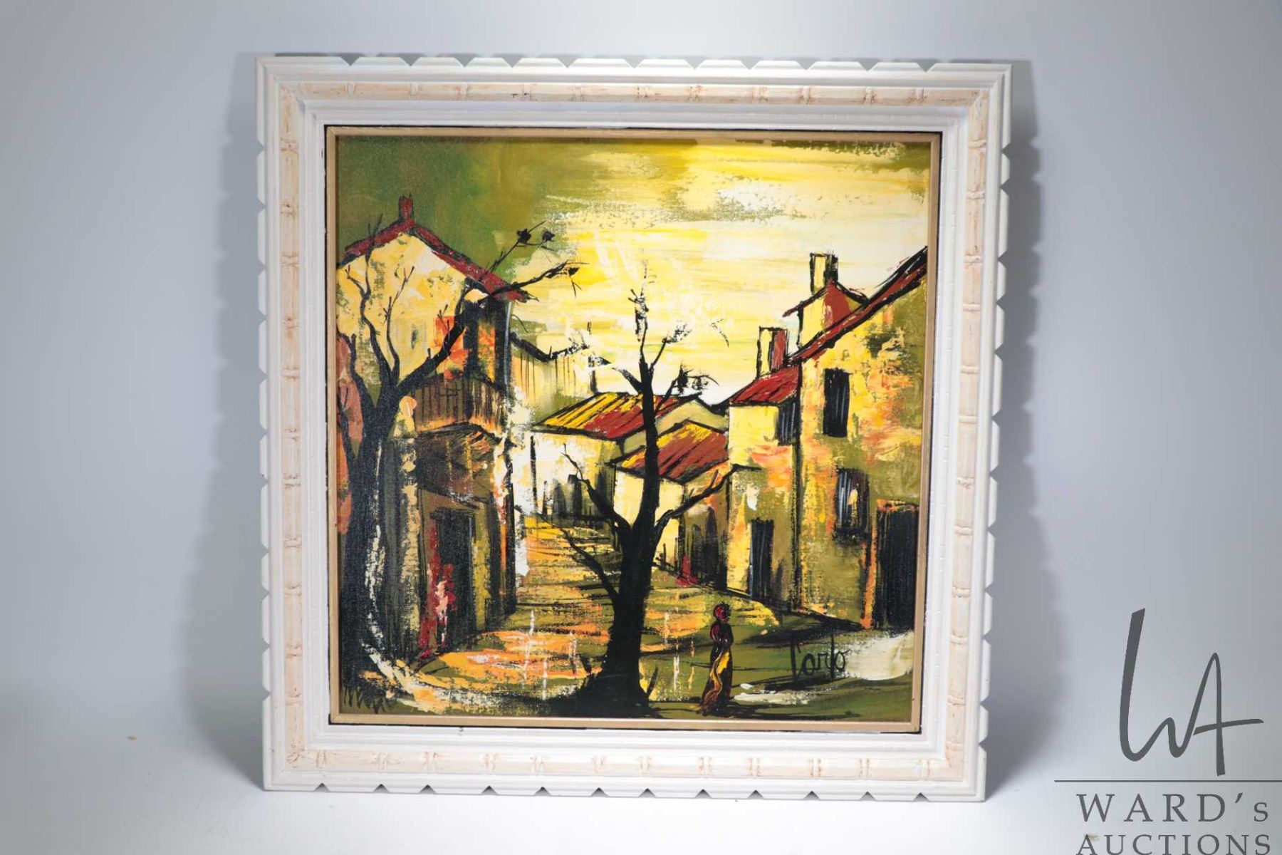 Vintage framed oil on canvas pallet painted street scene, signed by artist Carlo, 24" X 24". Note: Not available for shipping. Local pickup only