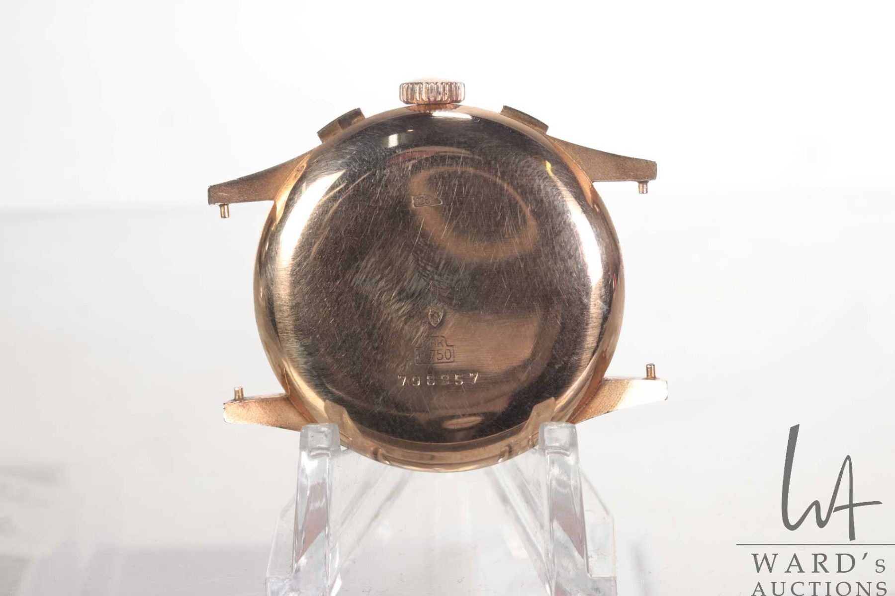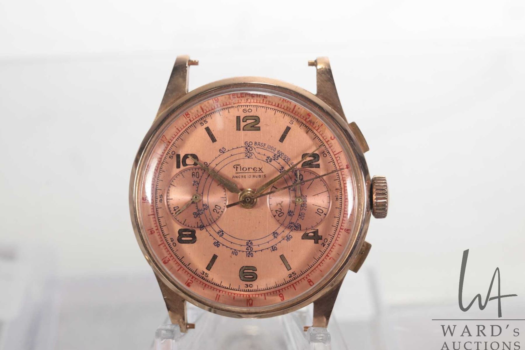 Vintage gent's Florex Swiss made,17 jewel chronograph wrist watch with rose gold metal dial in 18kt yellow gold 38mm case, also marked 750, circa 1950-1960, working at time of cataloguing