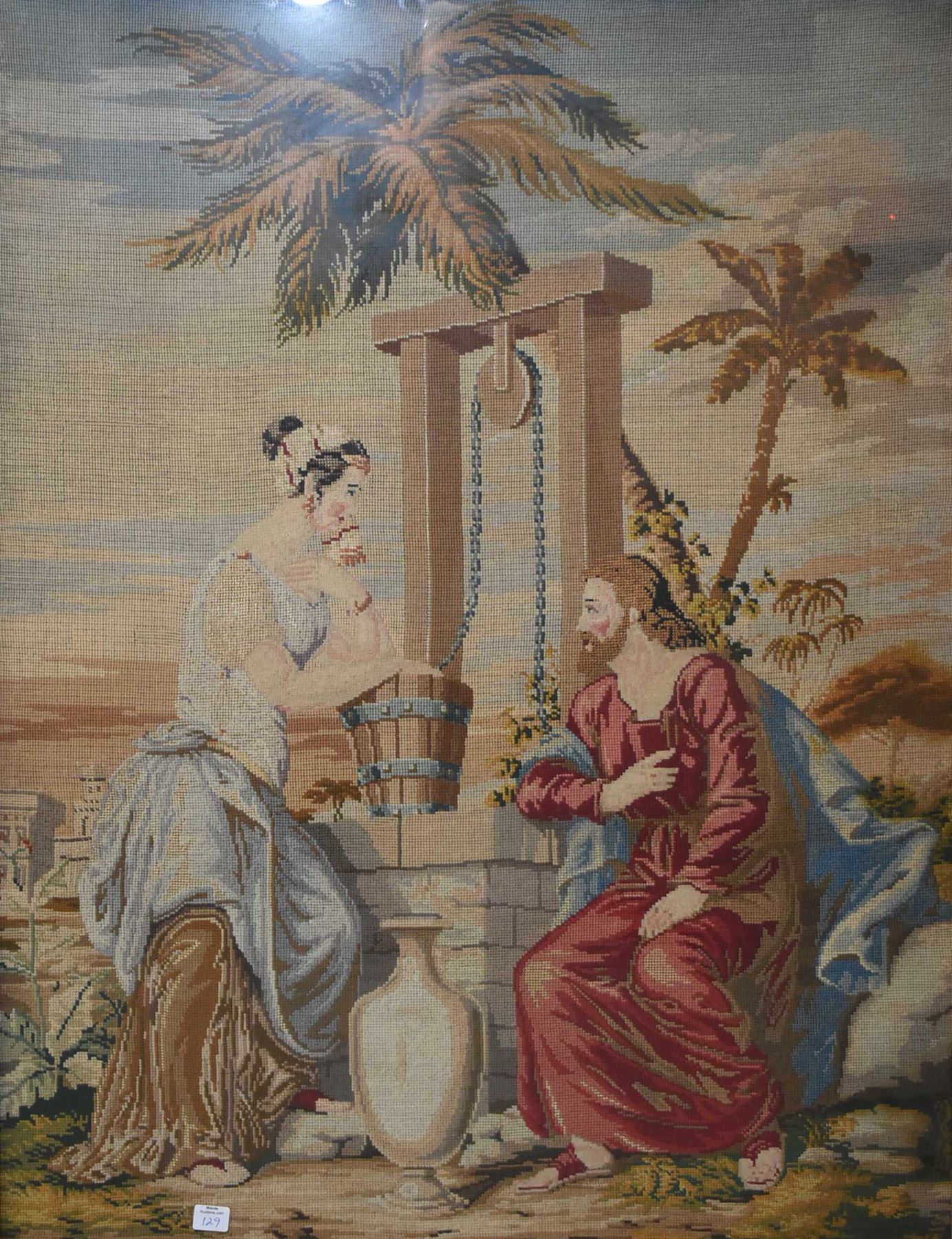 Vintage gilt framed antique needlework, appears to be religious content with figures 37" X 27"