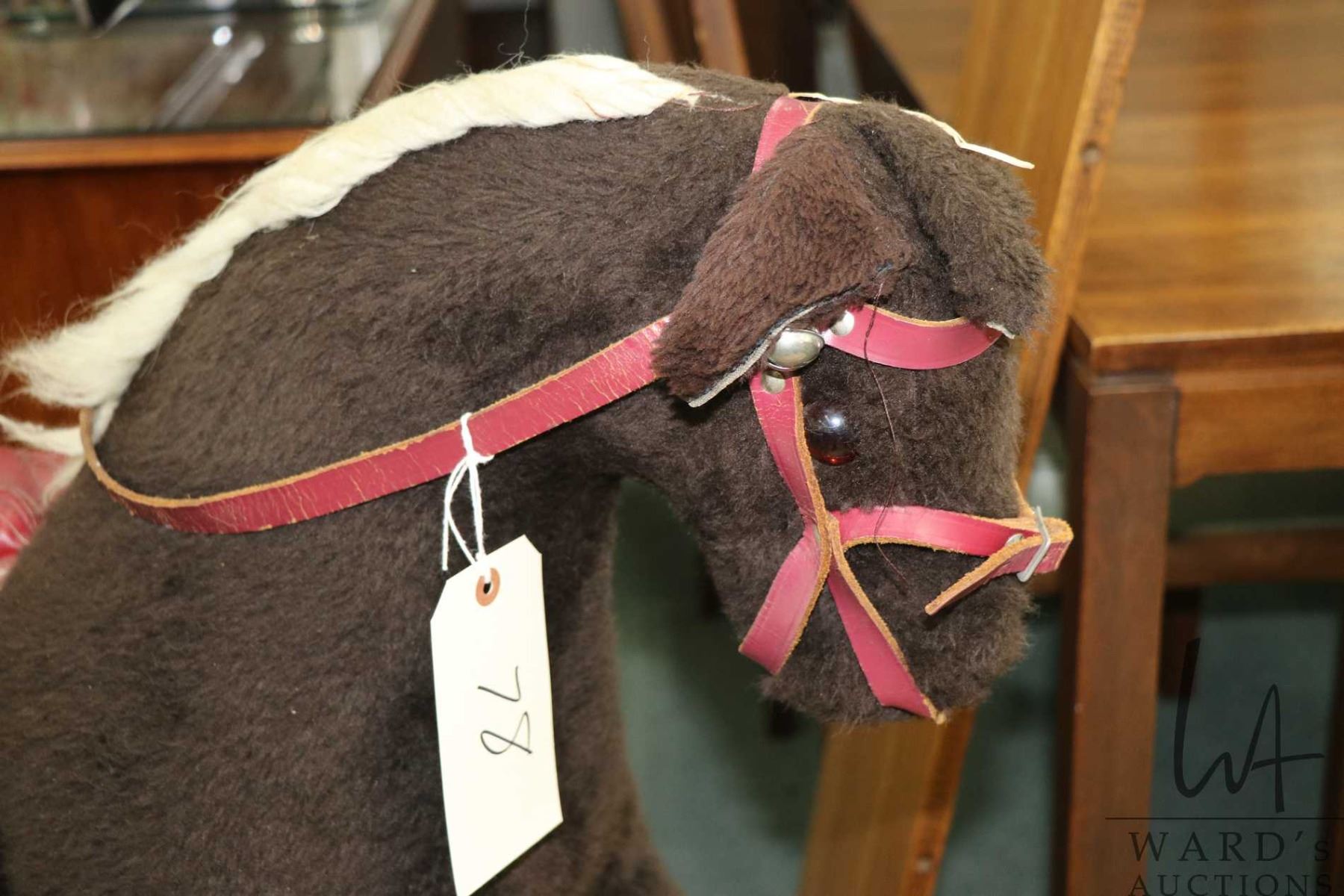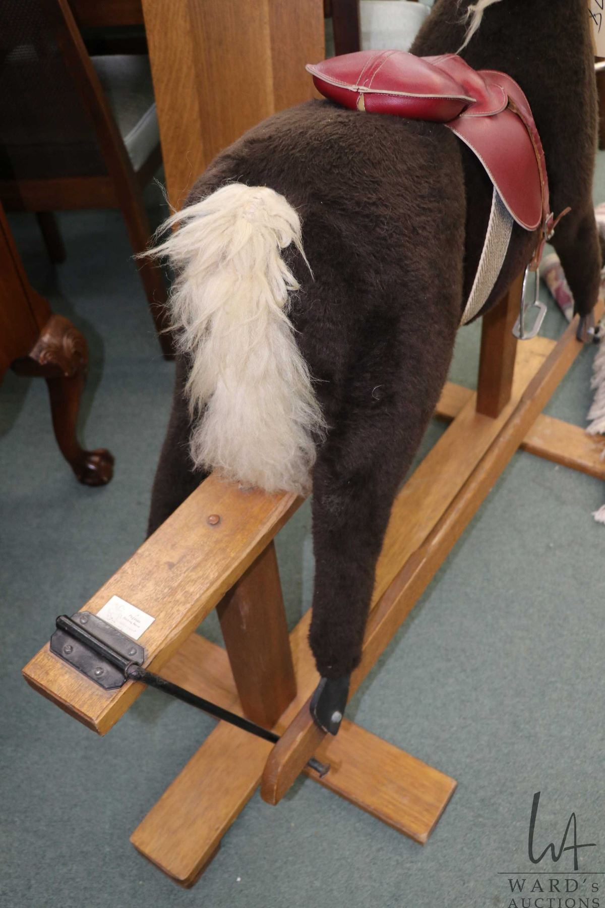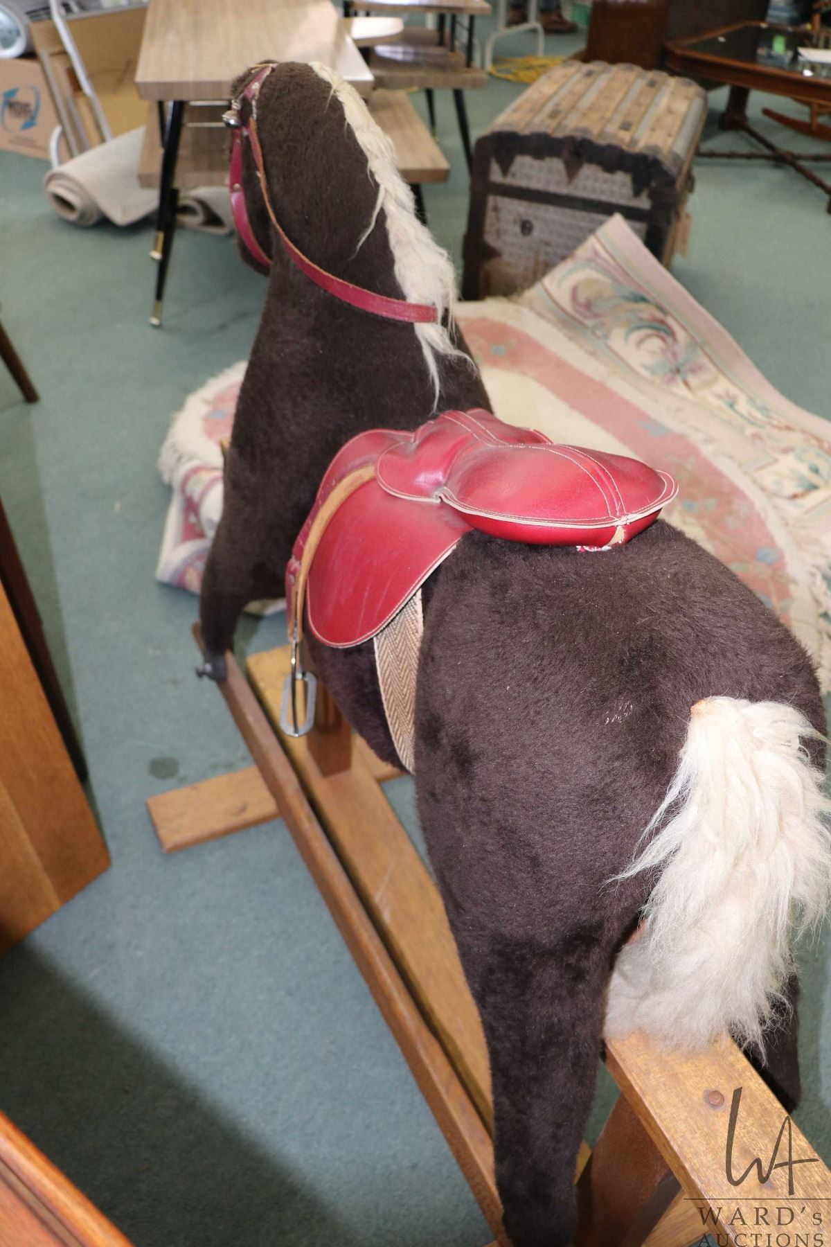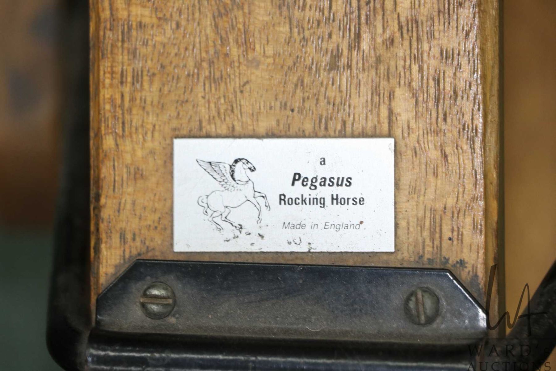 Vintage glider rocking horse marked Pegasus made in England. Complete with leather saddle, metal stirrups and bridal. Overall length 48" inches. Note: Not available for shipping. Local pickup only
