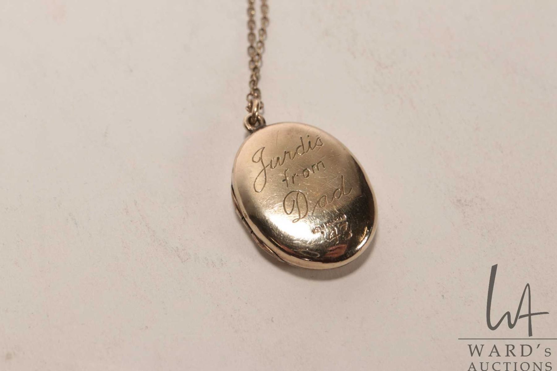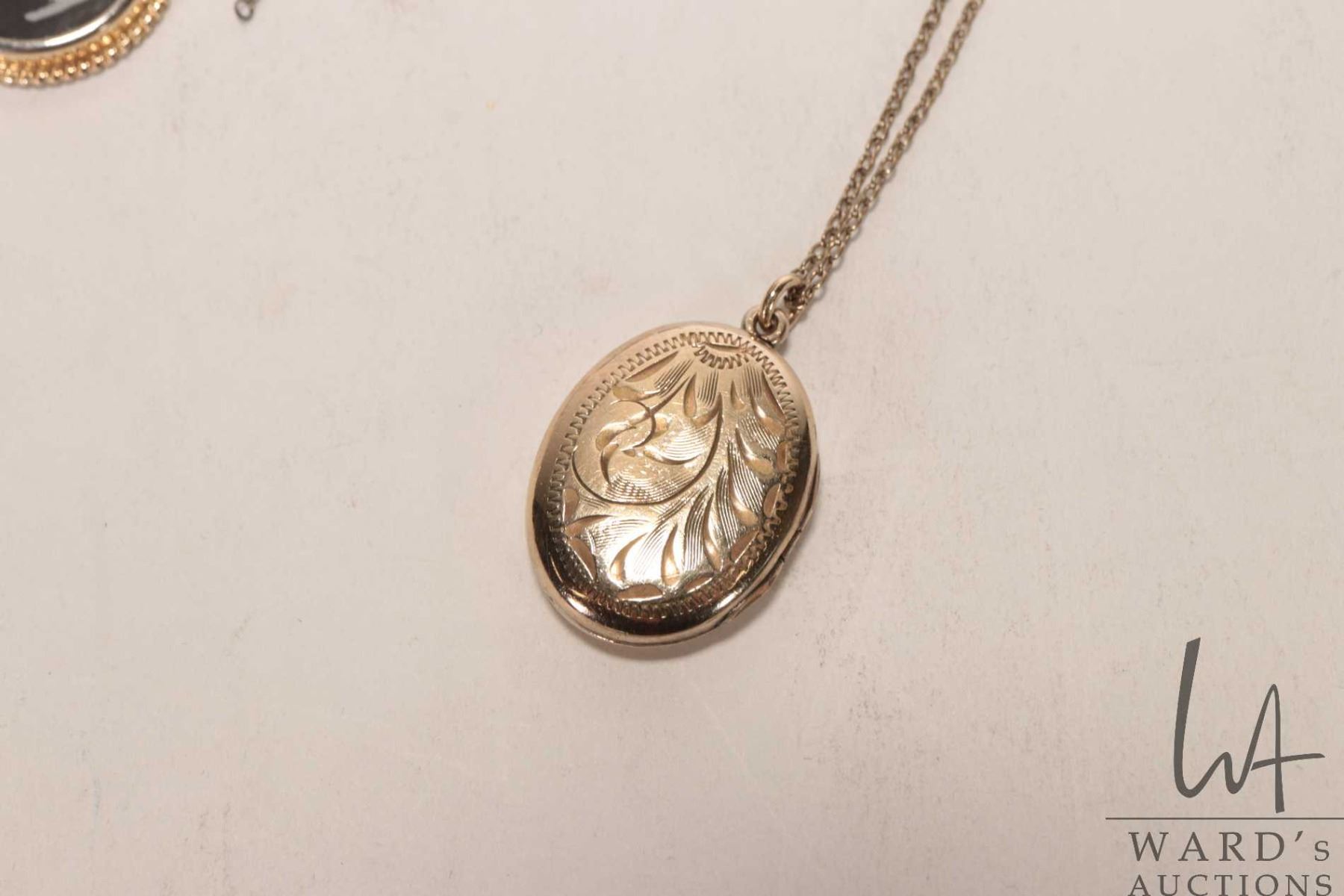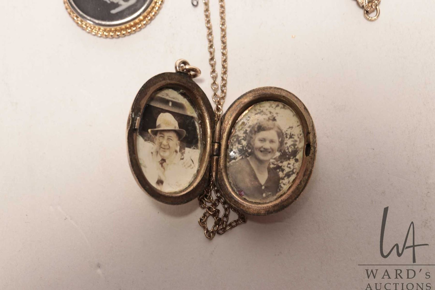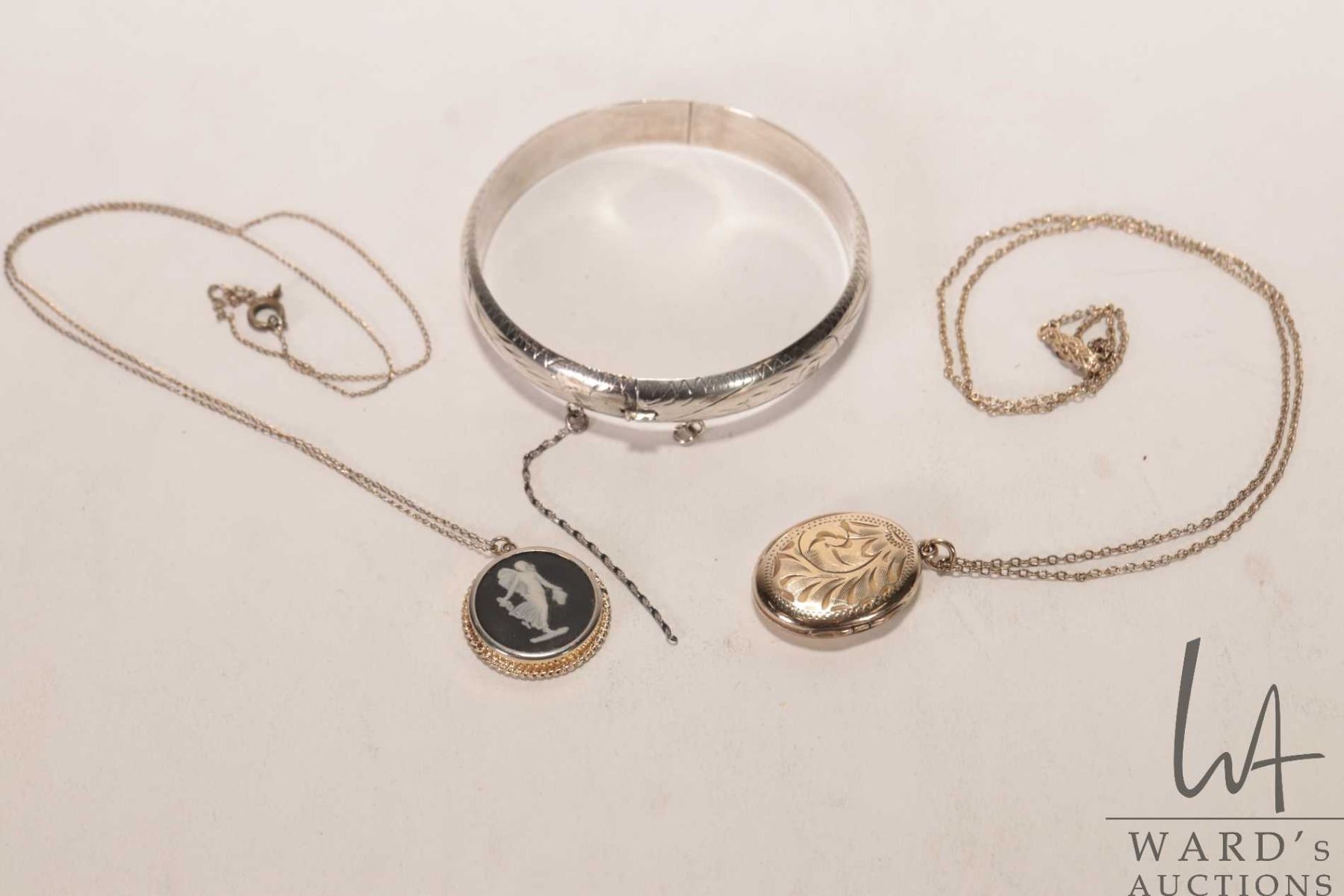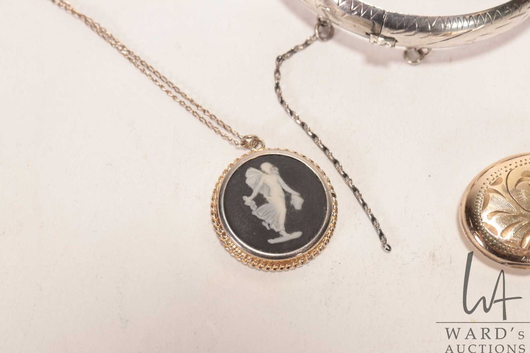 Vintage gold filled and engraved locket, sterling silver engraved hinged bracelet and a Jasperware by Wedgwood pendant and chain