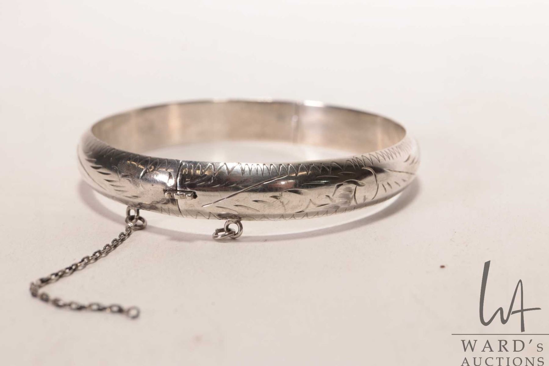 Vintage gold filled and engraved locket, sterling silver engraved hinged bracelet and a Jasperware b