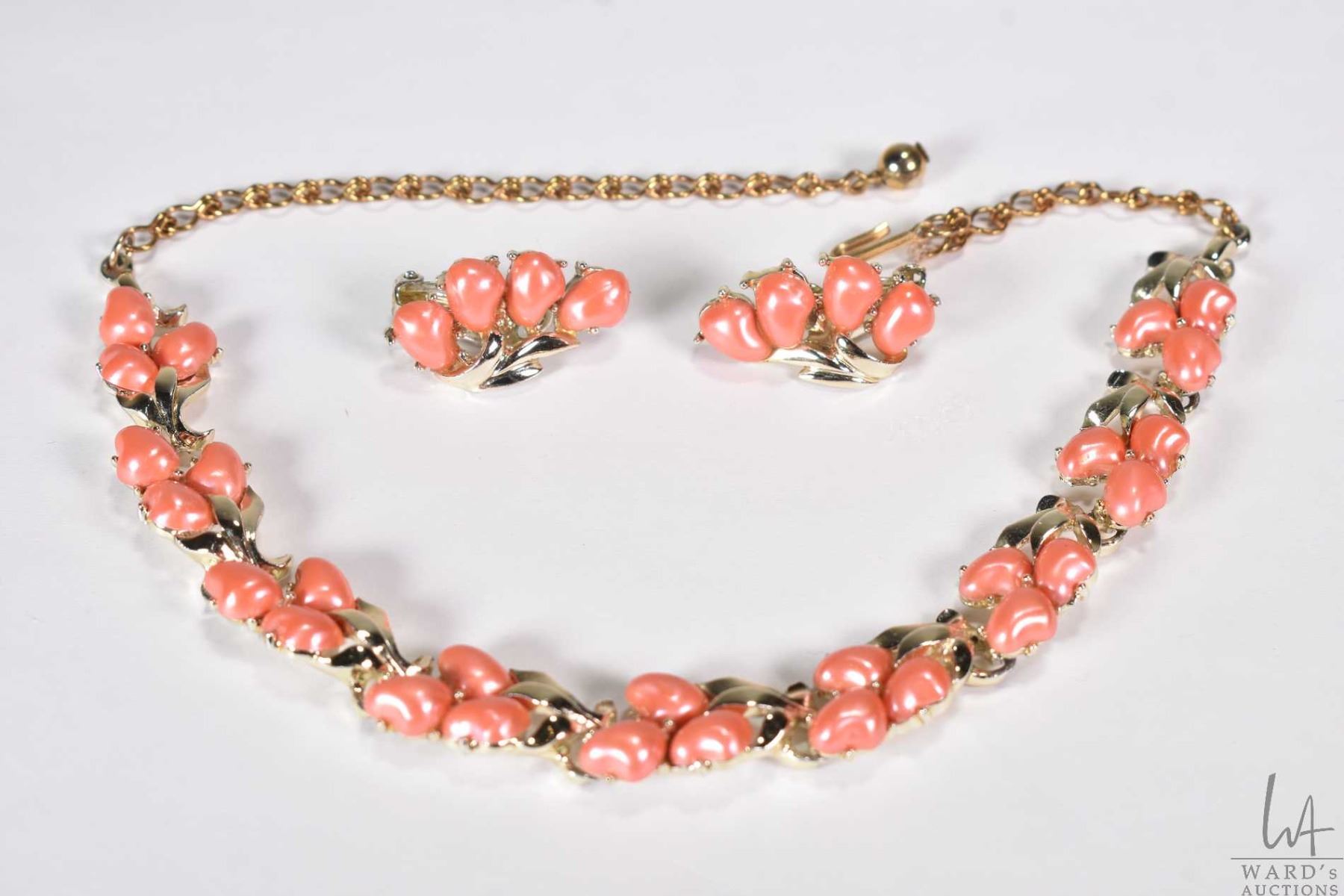 Vintage gold tone BSK ( Benny, Steinberg, Slovit and Kaslo) necklace and matching earrings set with coral coloured pearl like gemstone