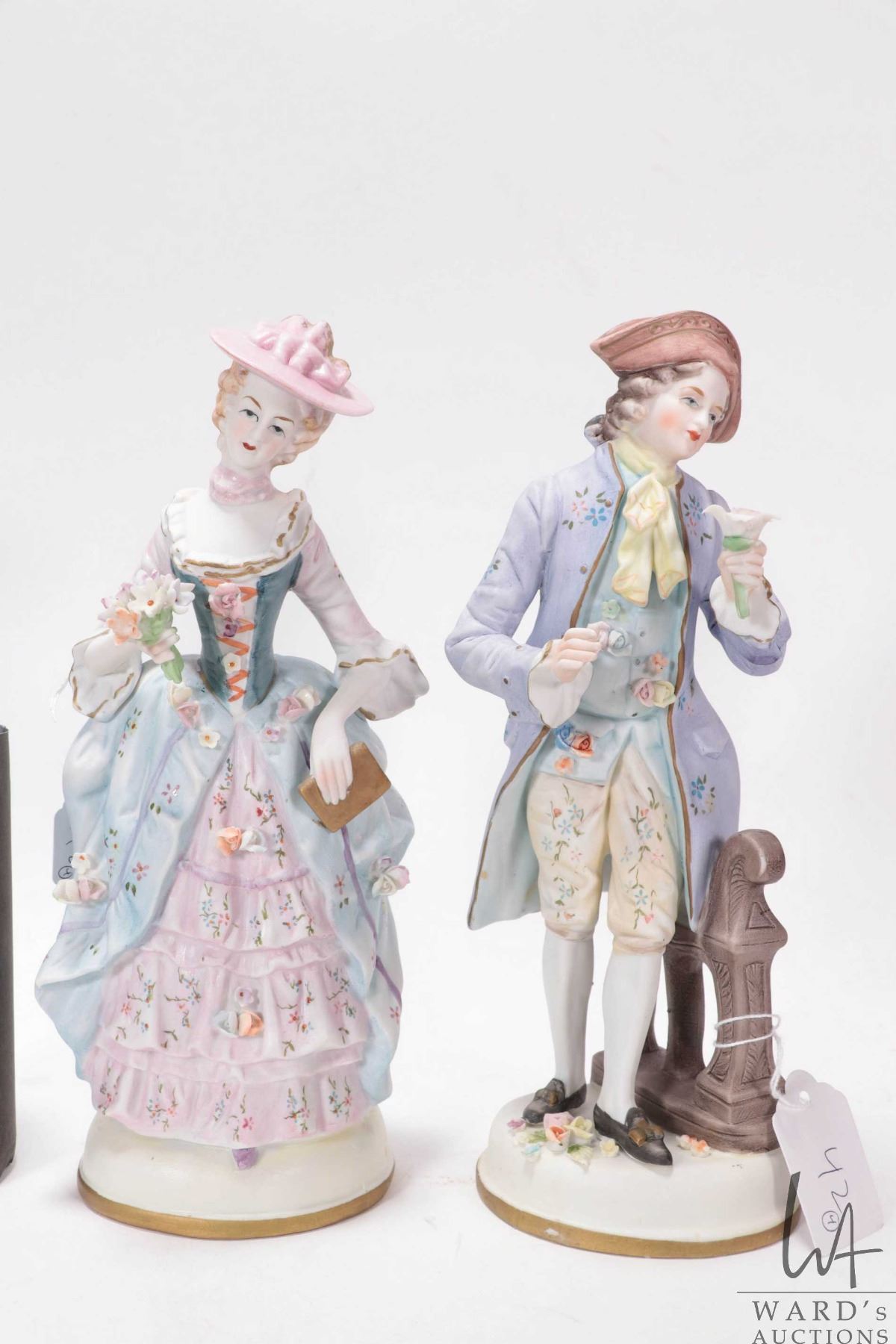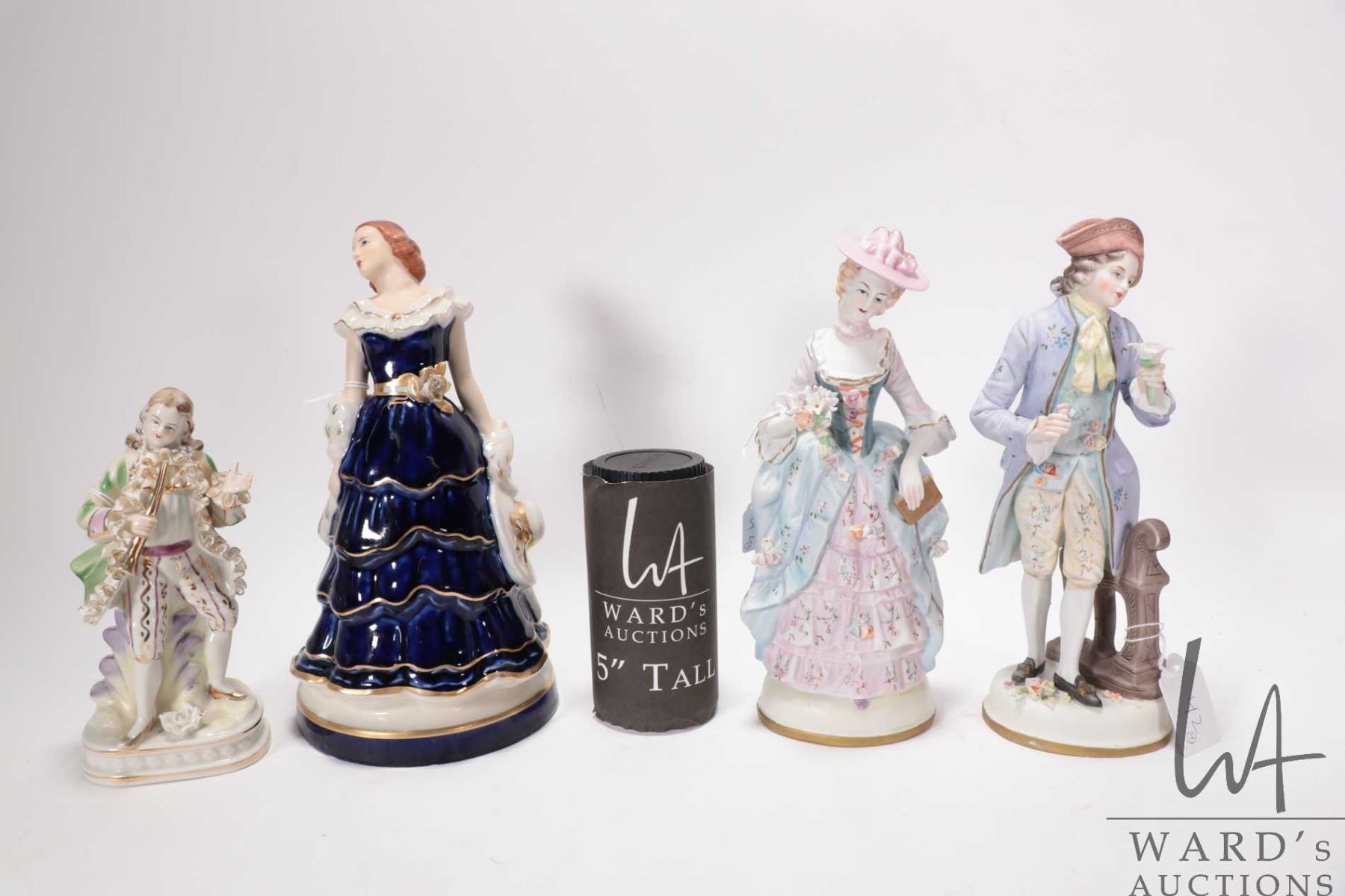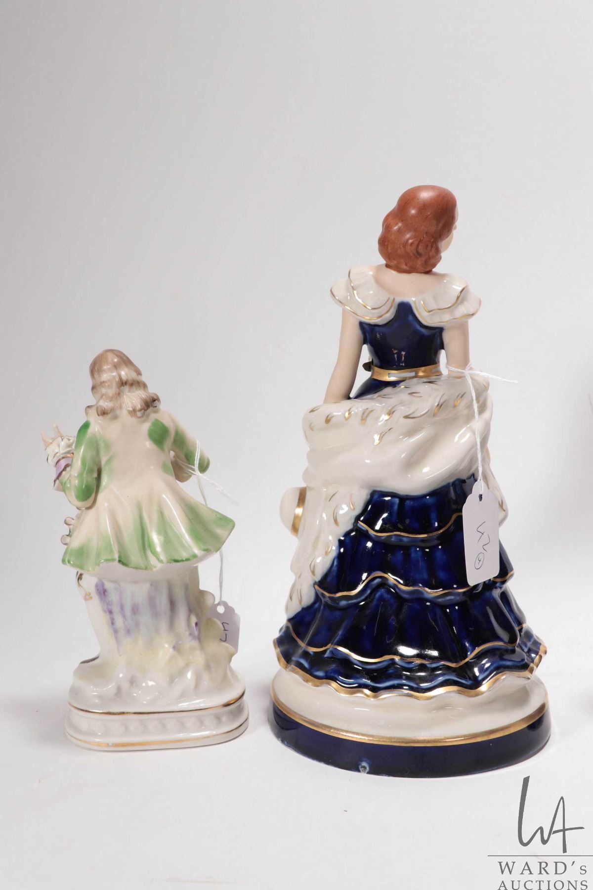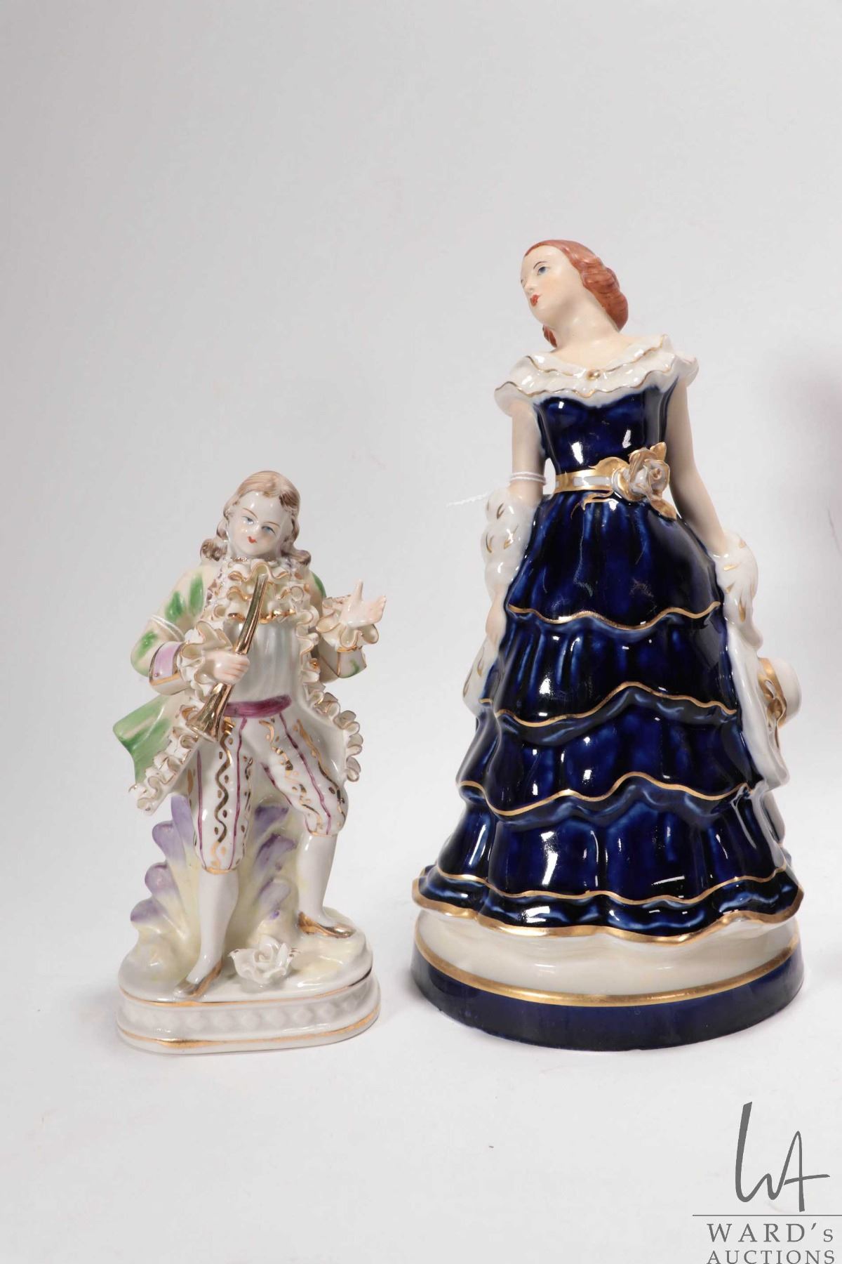 Vintage hand painted figurines including Royal Dux 10" lady, plus a couple and a small trumpeter