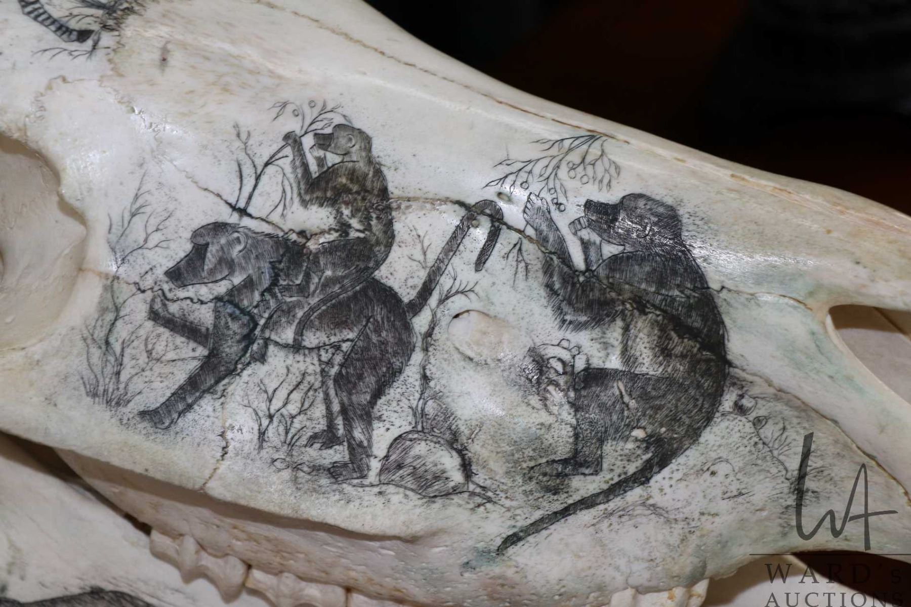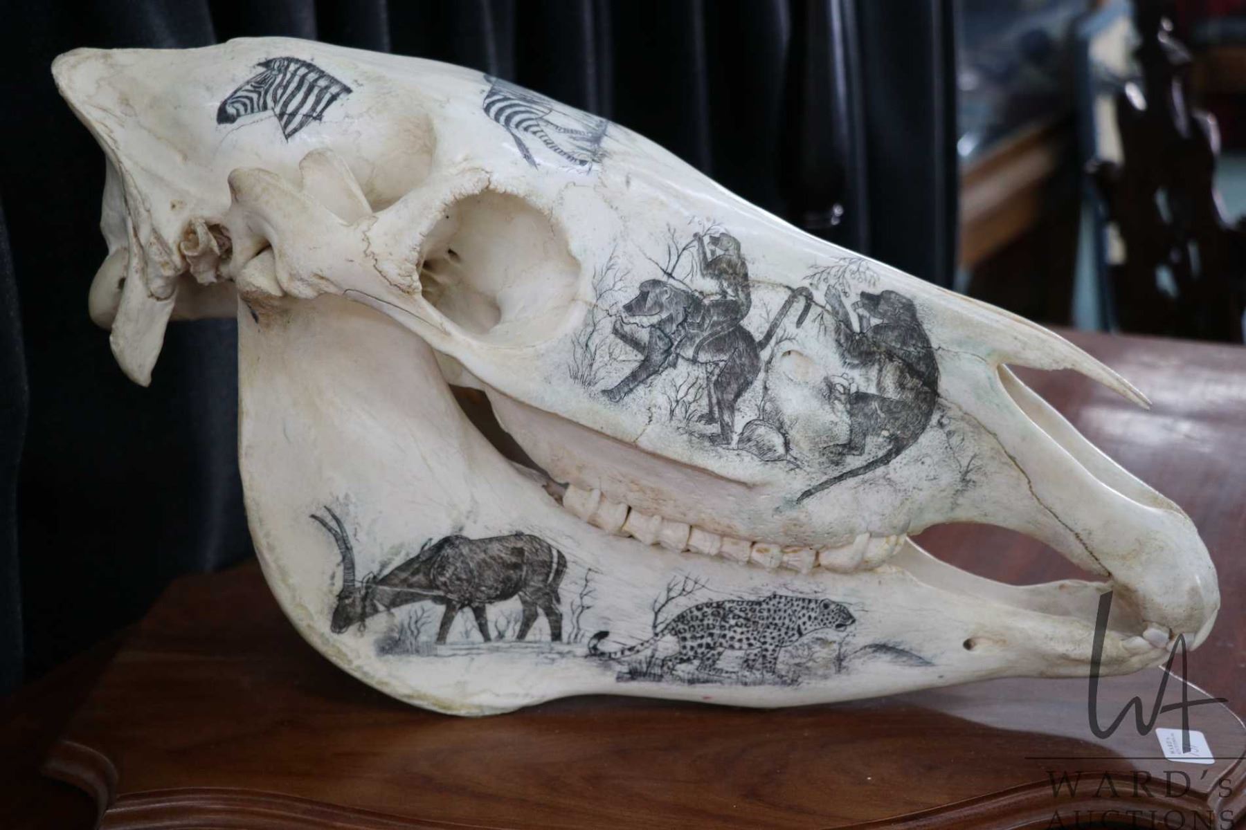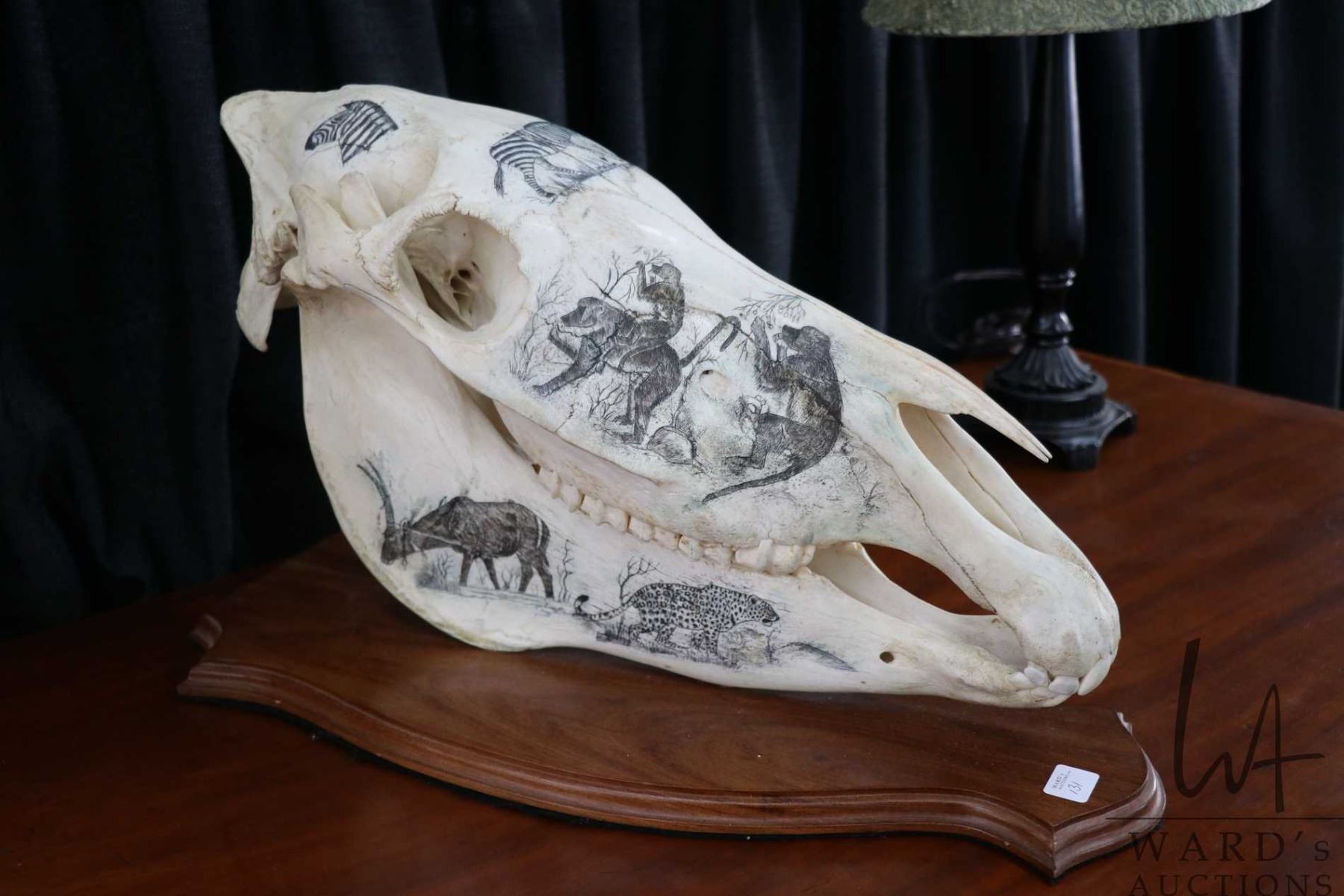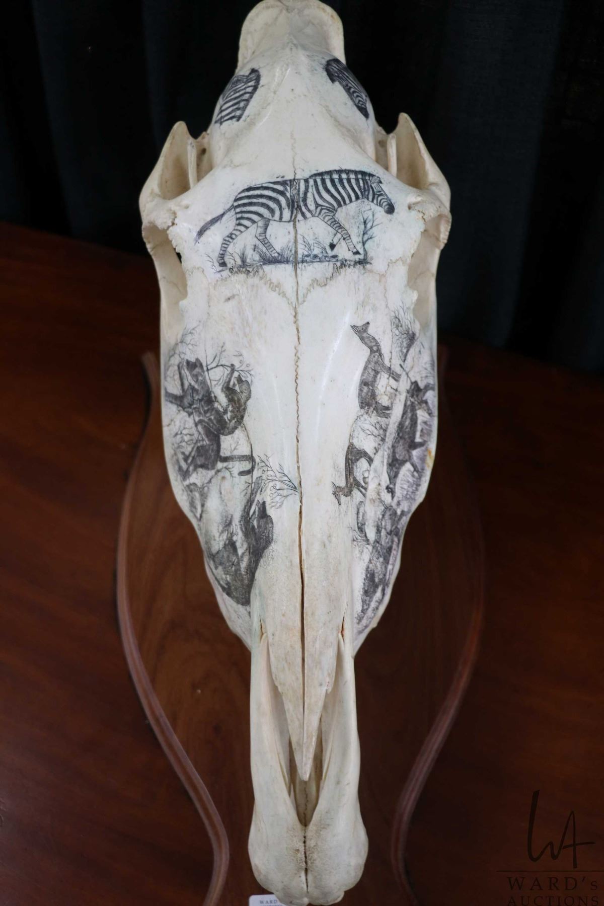 Vintage horse skull with decorative scrimshaw drawing featuring African animals including giraffes, zebras, antelopes, wart hogs, monkeys, big cats etc., mounted on wooden plaque, 18" L X 11" in height
