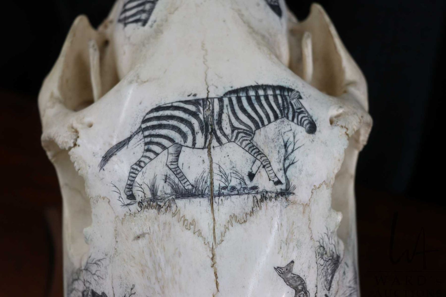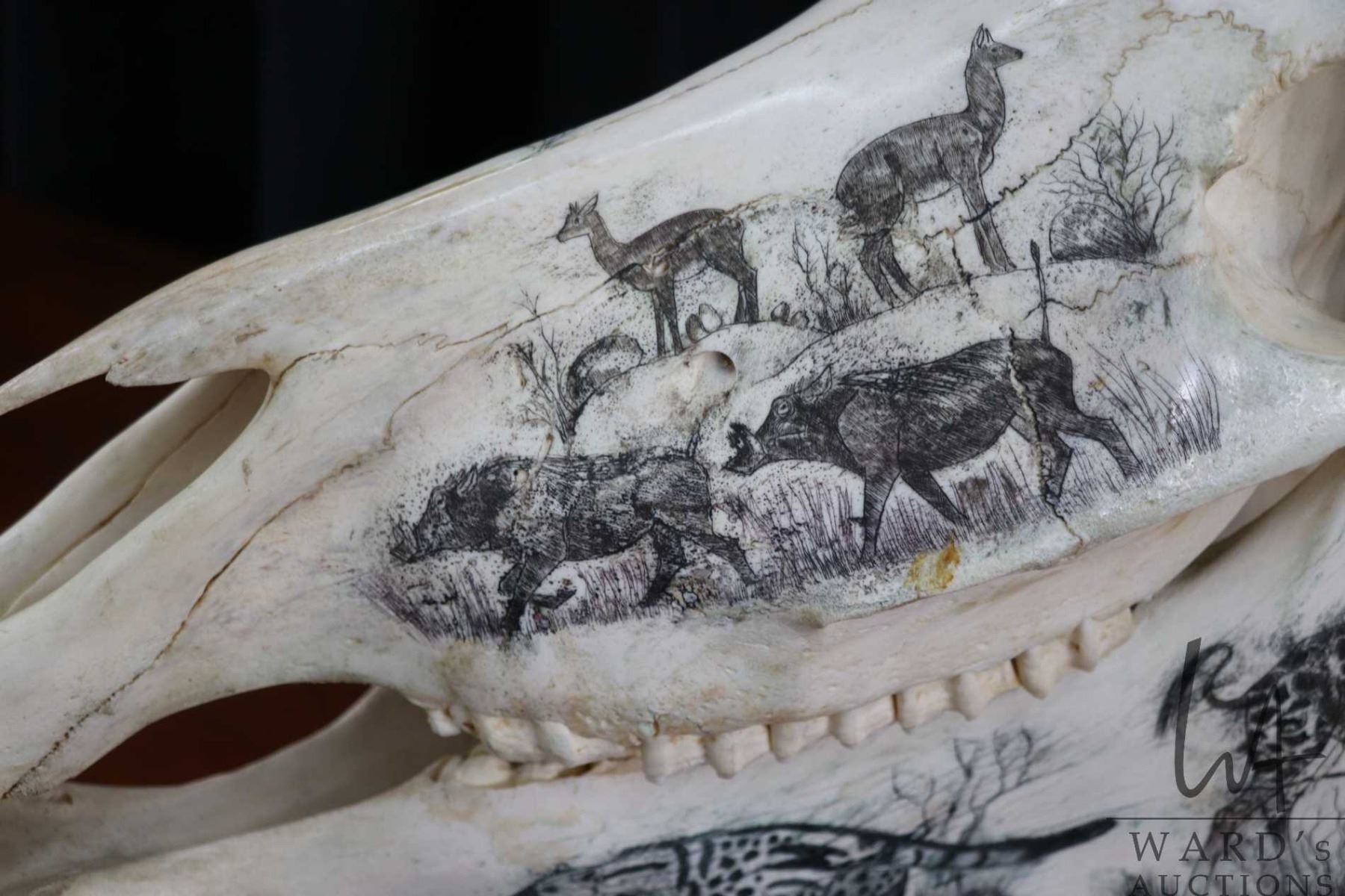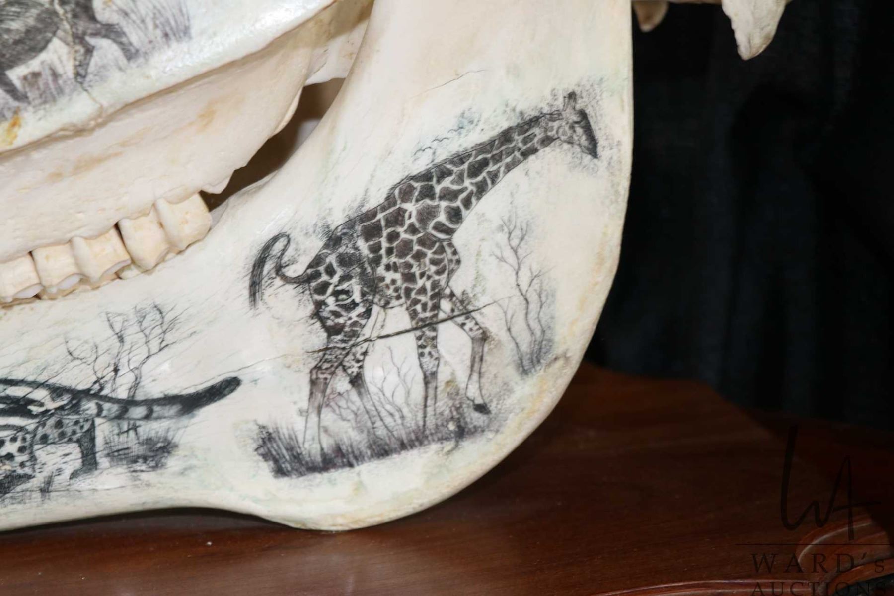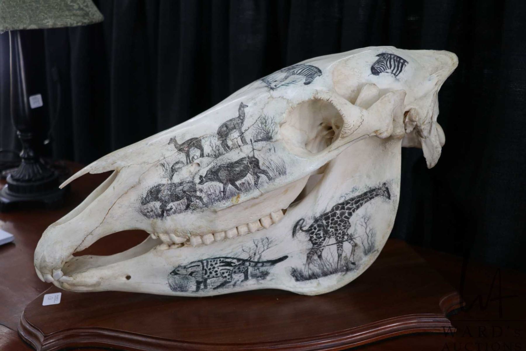Vintage horse skull with decorative scrimshaw drawing featuring African animals including giraffes,