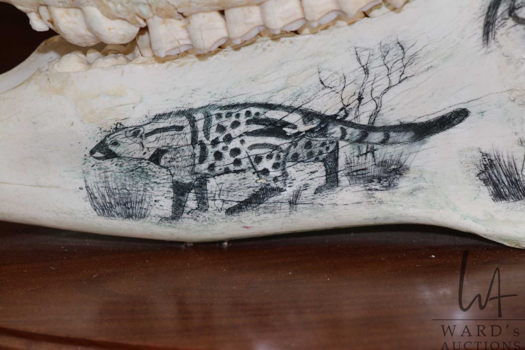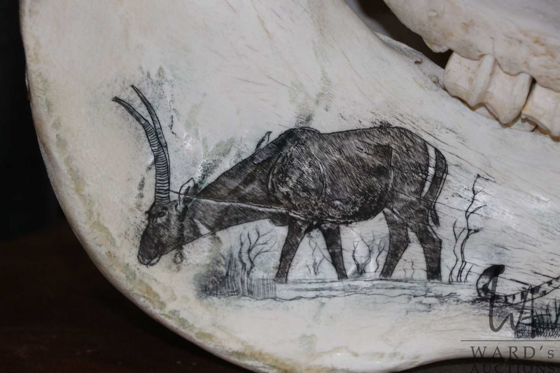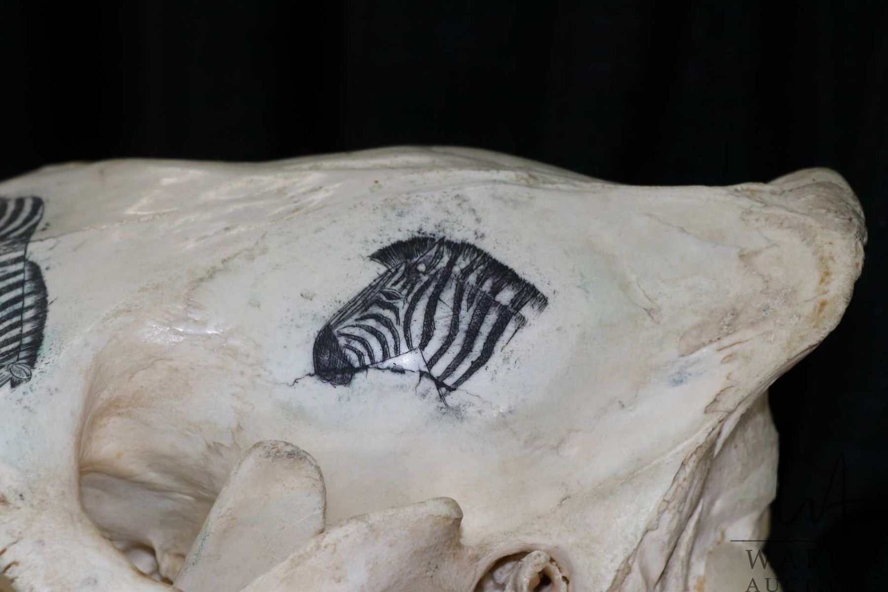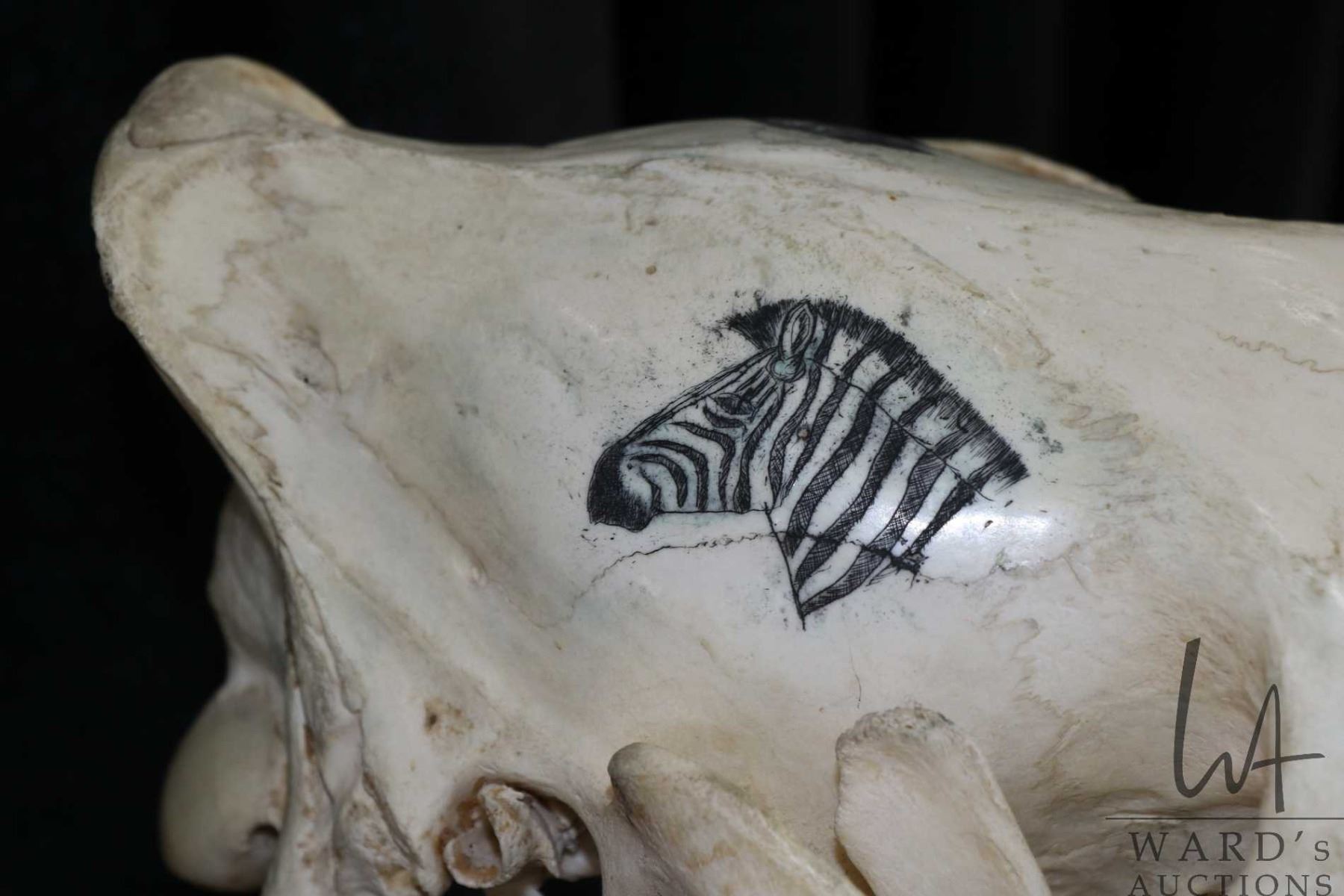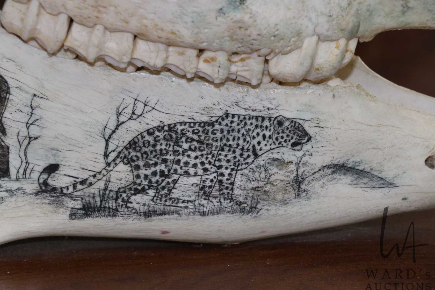 Vintage horse skull with decorative scrimshaw drawing featuring African animals including giraffes,