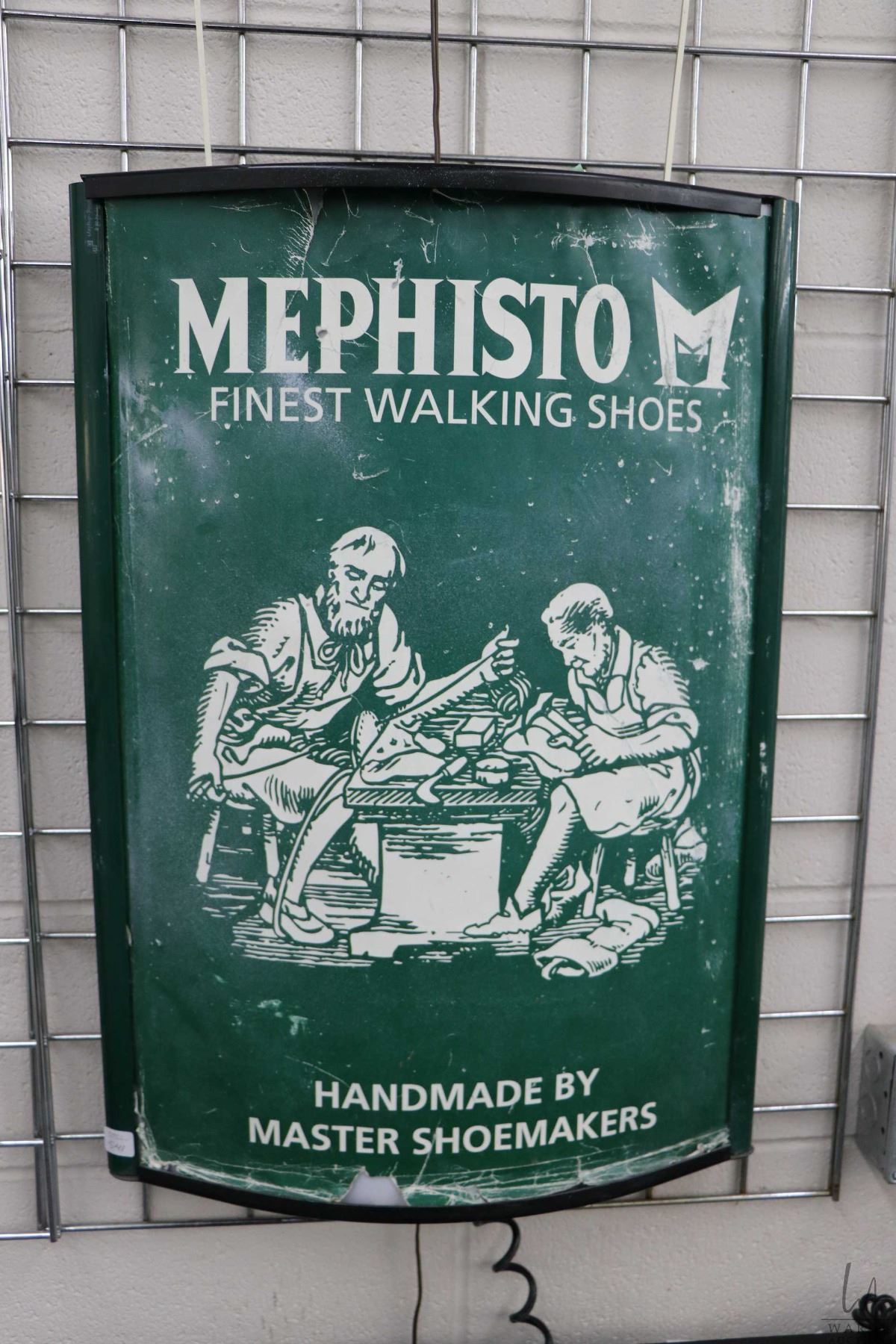 Vintage light up Mephisto Finest Walking Shoes light up advertising wall sign, 26 1/2" X 20", working at time of cataloguing. Note: Not available for shipping. Local pickup only