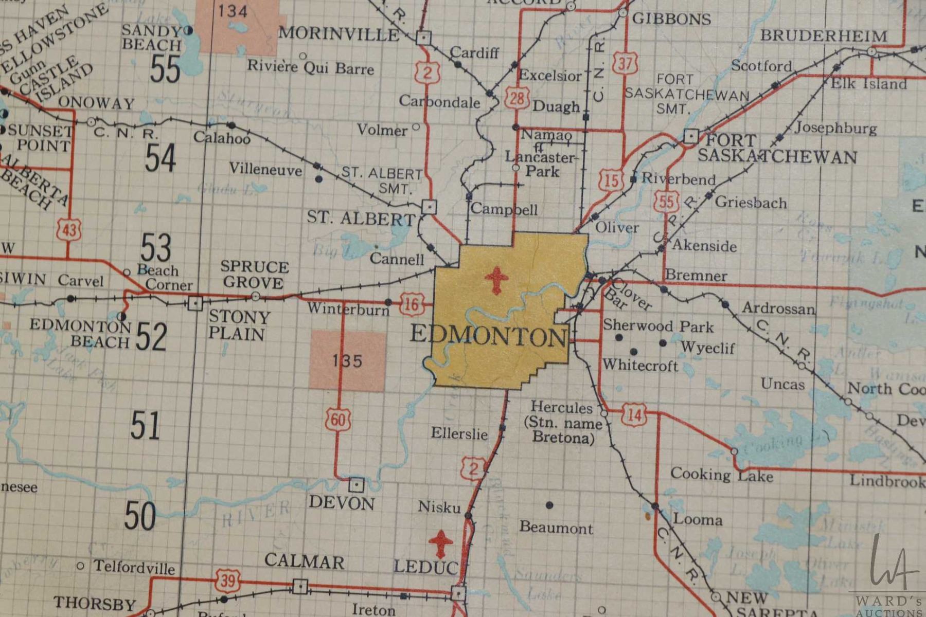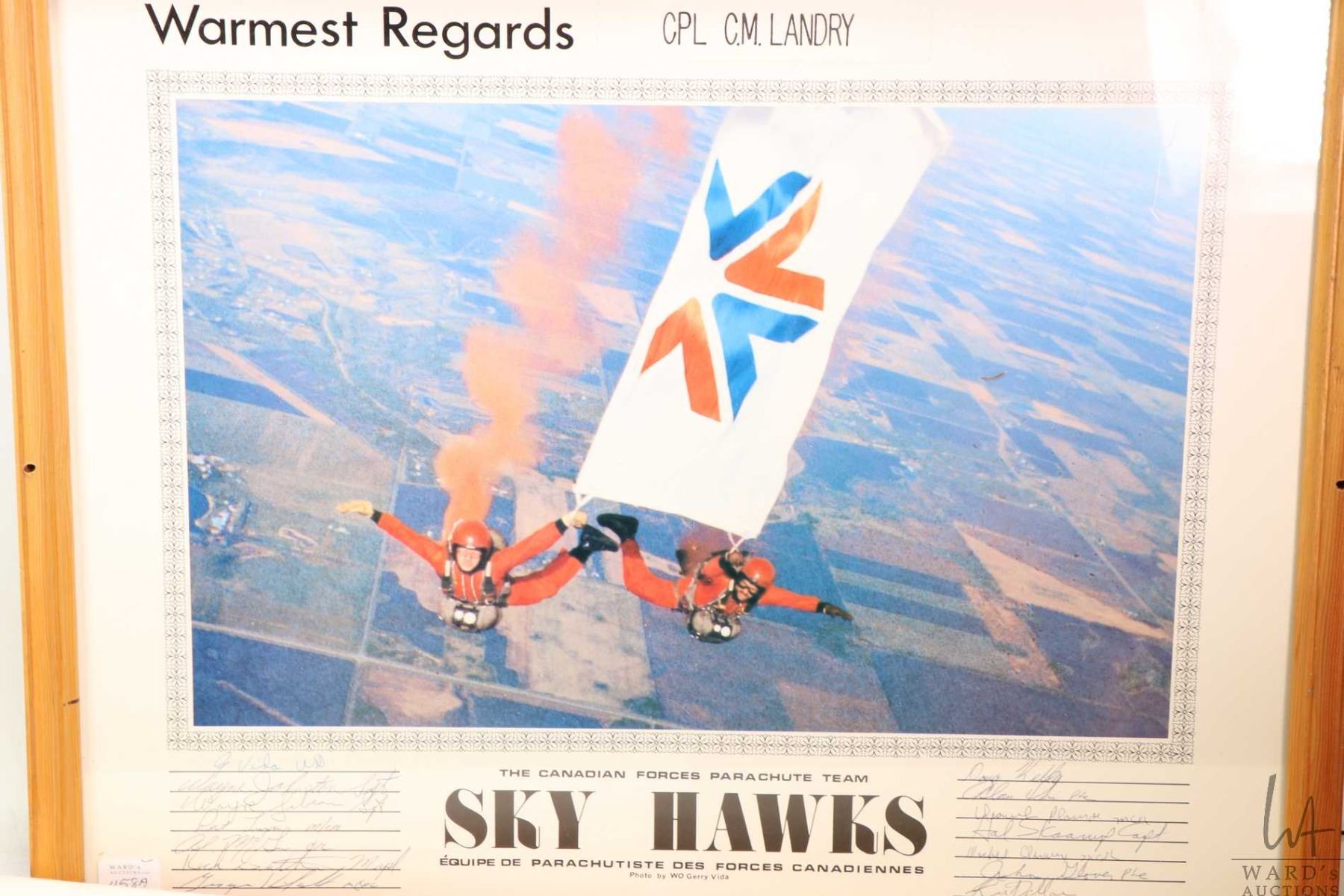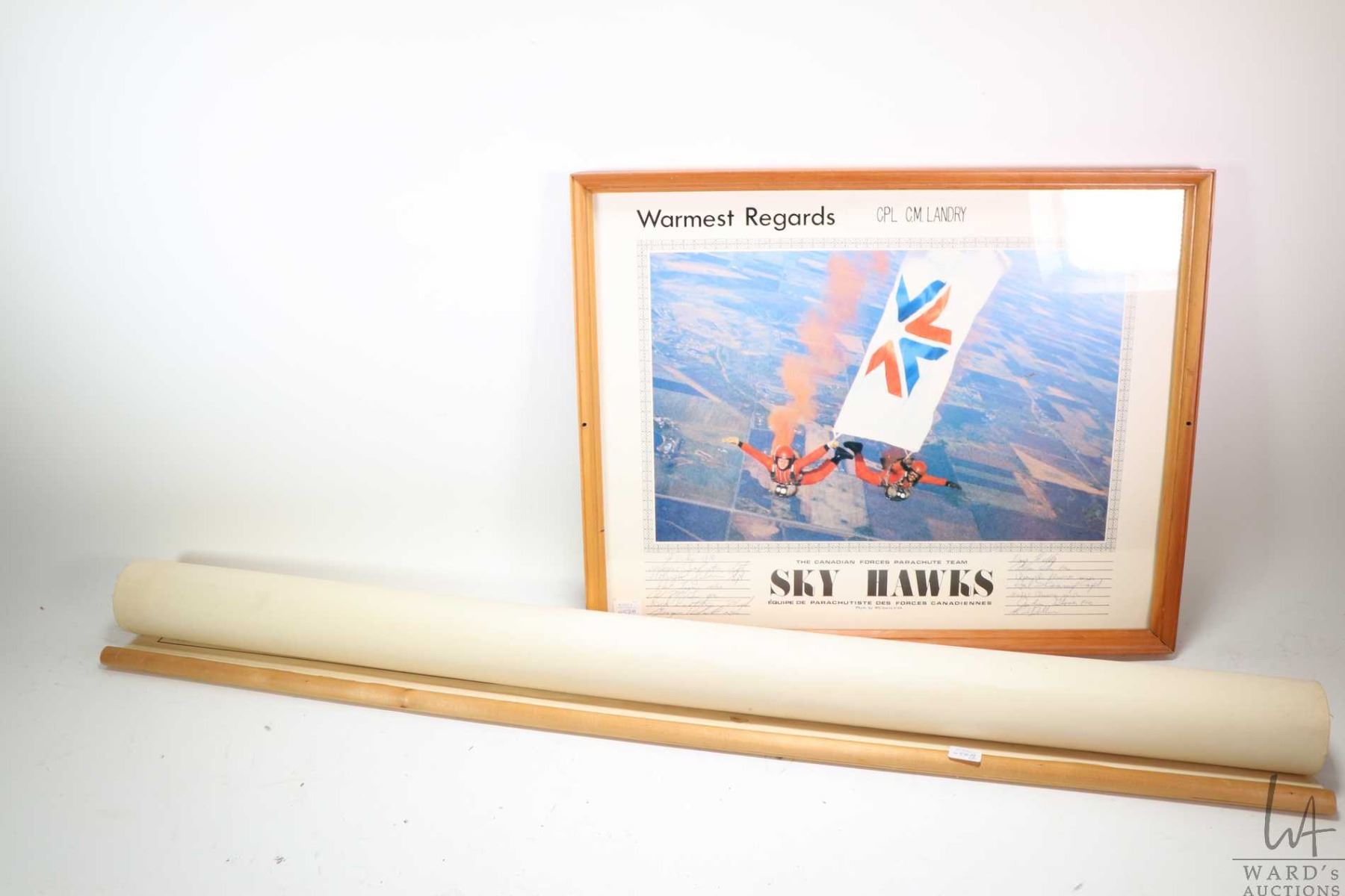 Vintage map of Alberta circa 1967 and a framed Skyhawk Canadian Forces parachute team poster signed by membership