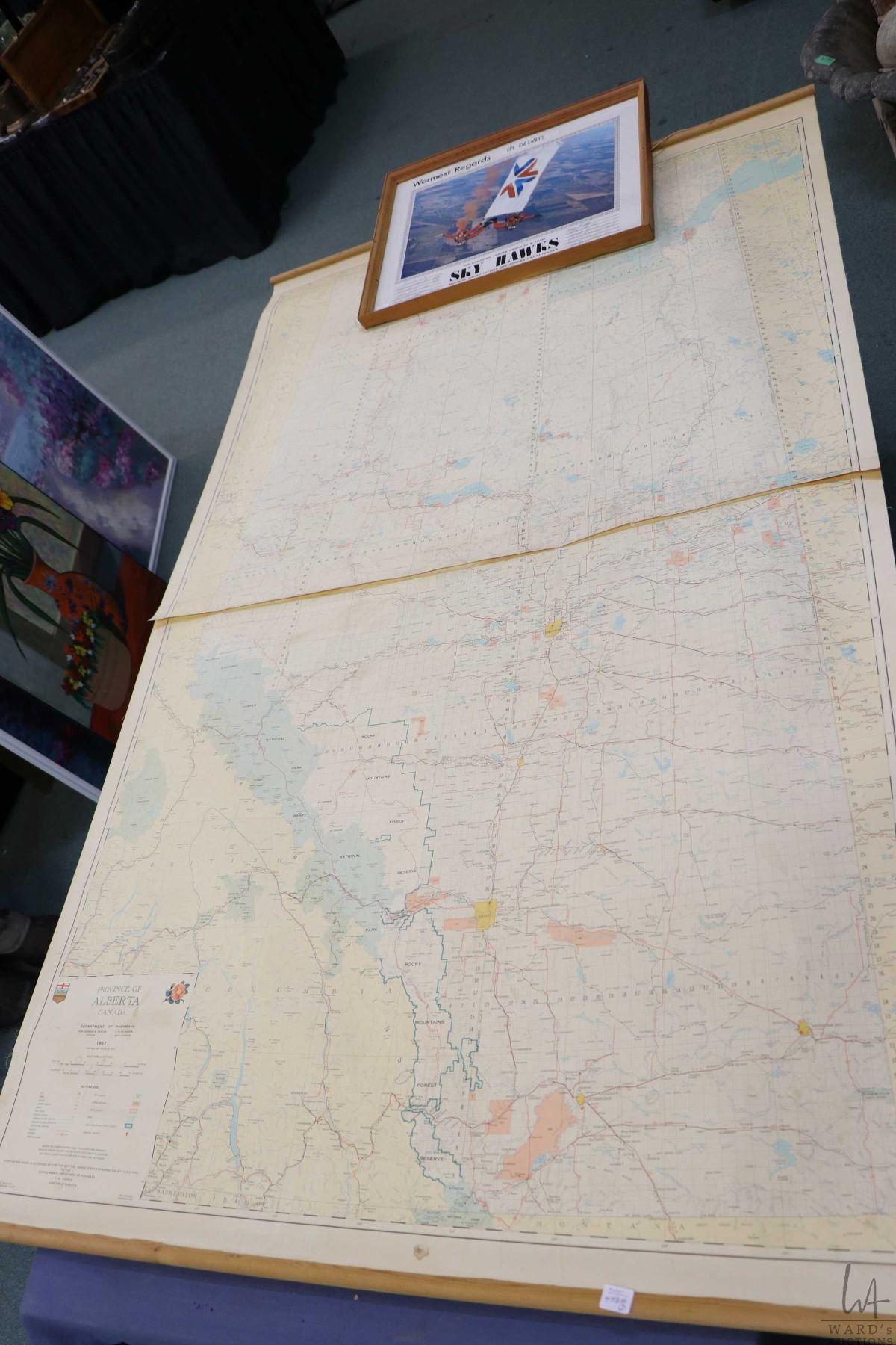 Vintage map of Alberta circa 1967 and a framed Skyhawk Canadian Forces parachute team poster signed