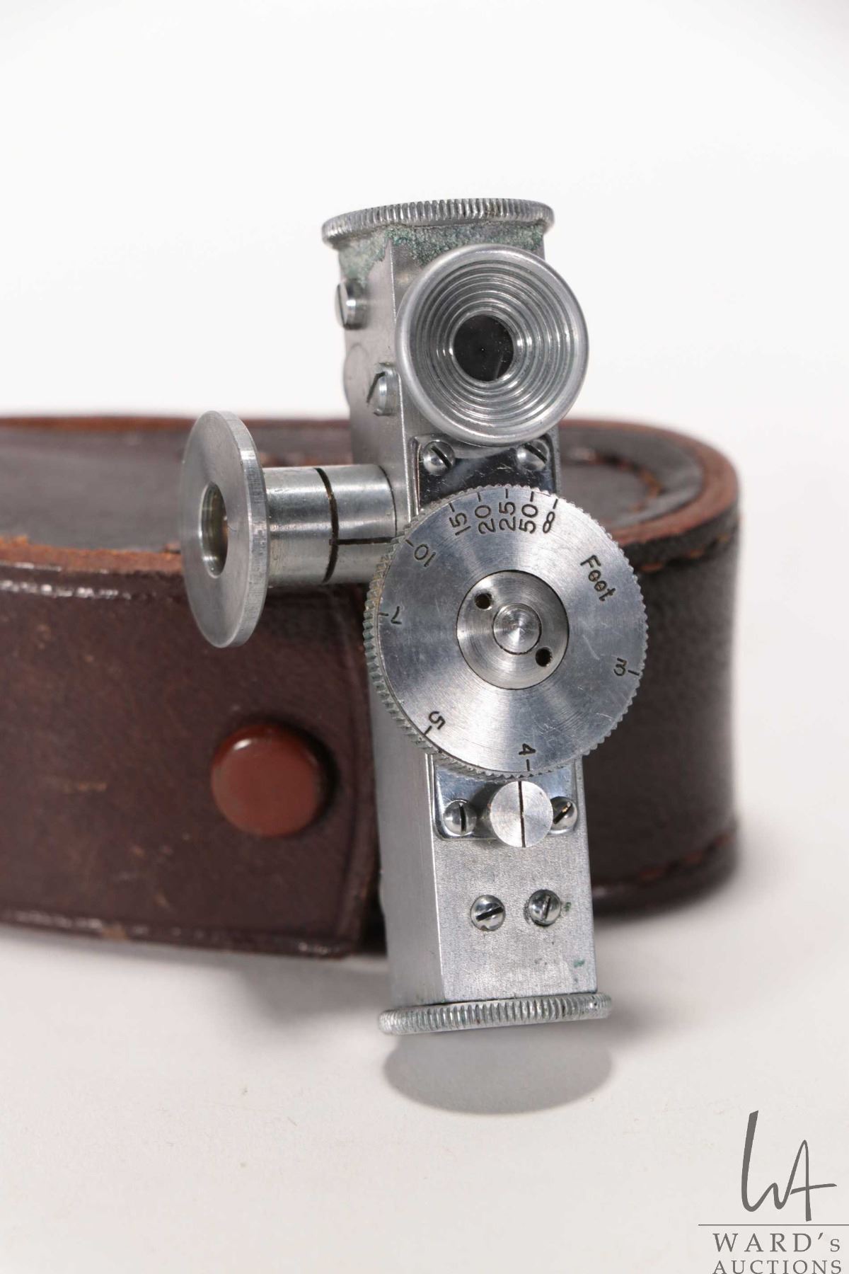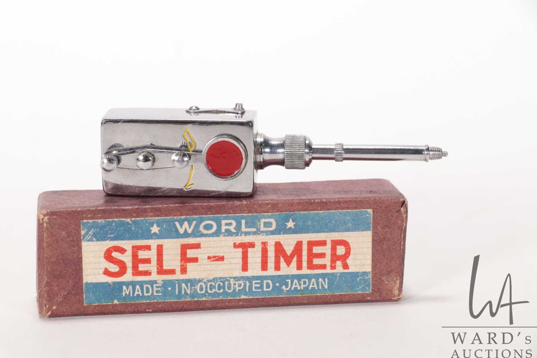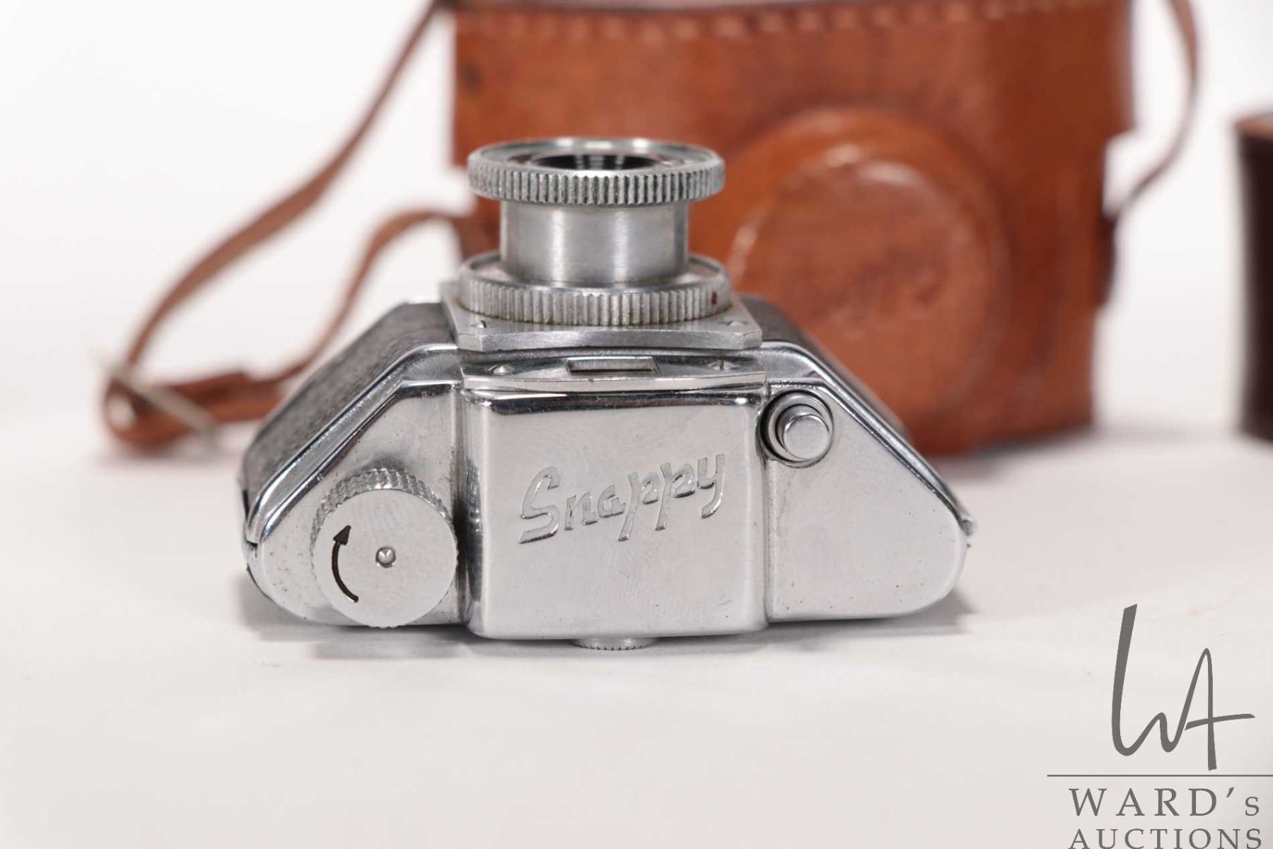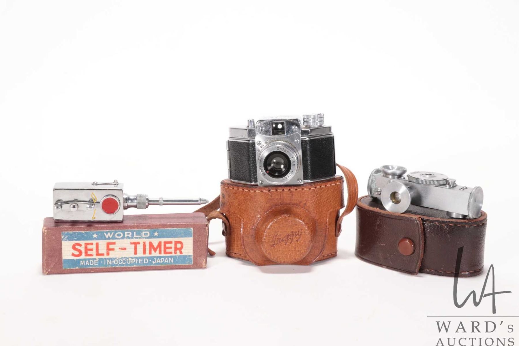 Vintage miniature camera and a selection of camera accessories including 1940's Konica Snappy Subminiature camera and leather case, World Self-Timer with original box marked " Made in Occupied Japan" and a Leica Fokos range finder with leather case