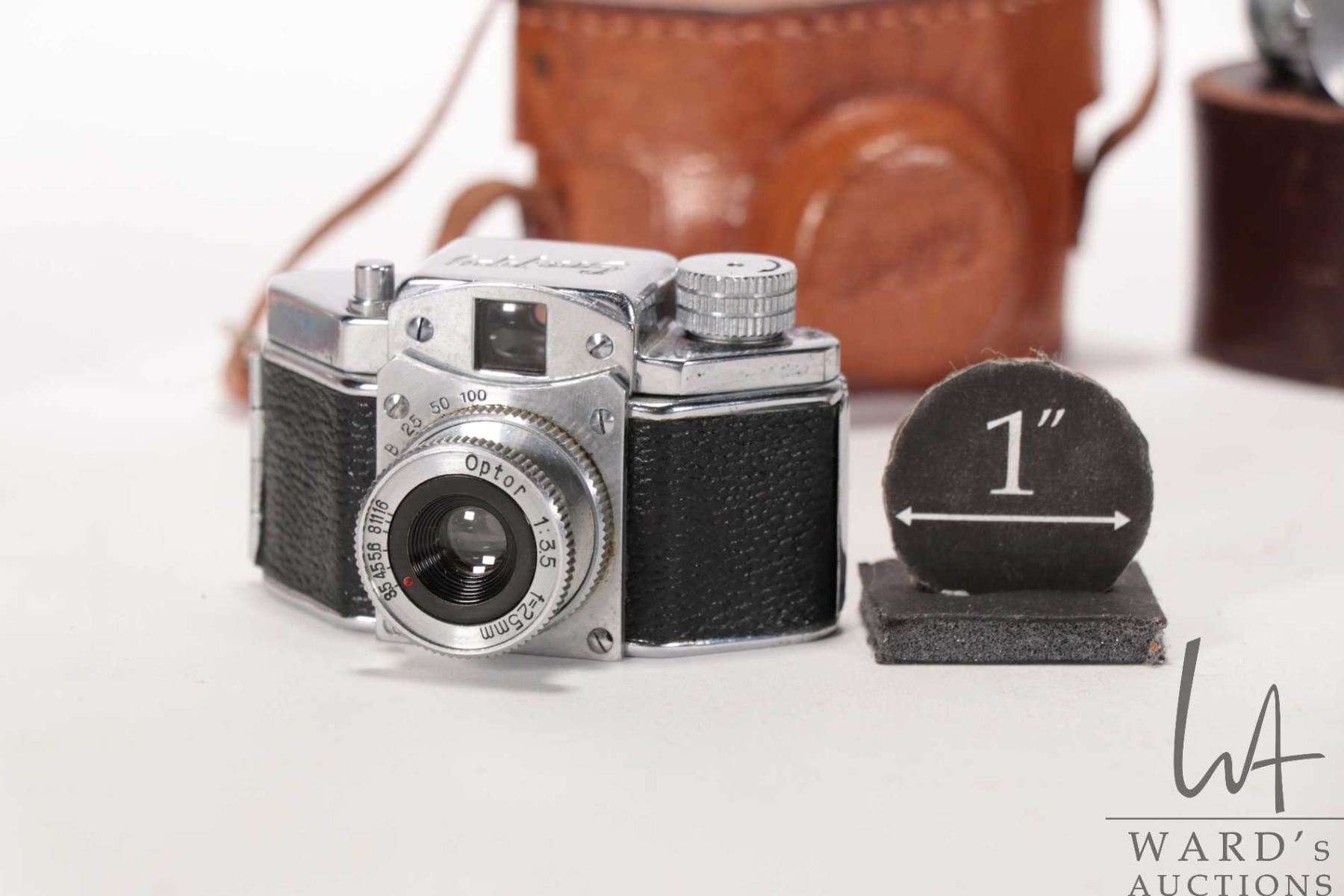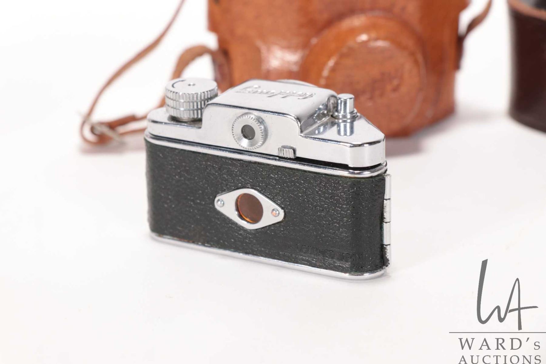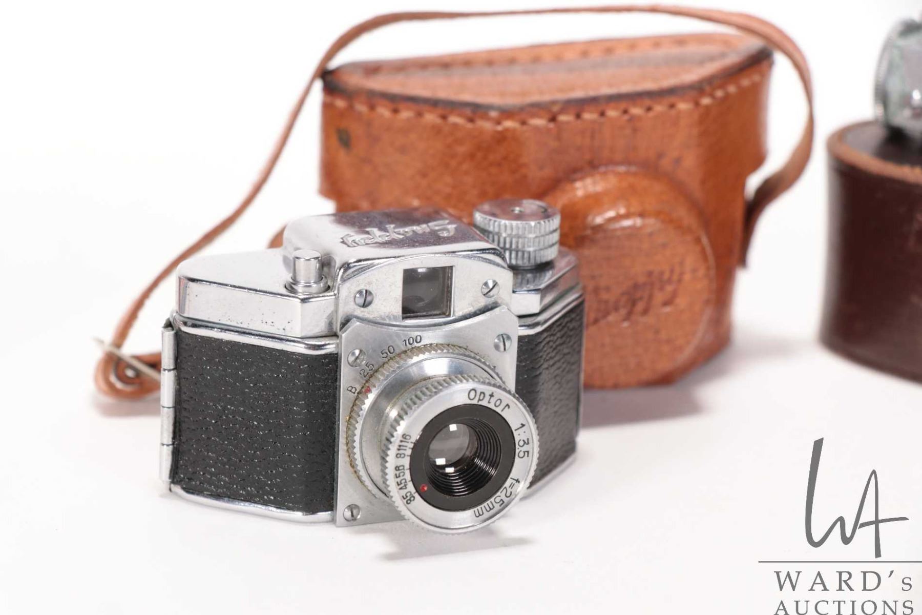 Vintage miniature camera and a selection of camera accessories including 1940's Konica Snappy Submin